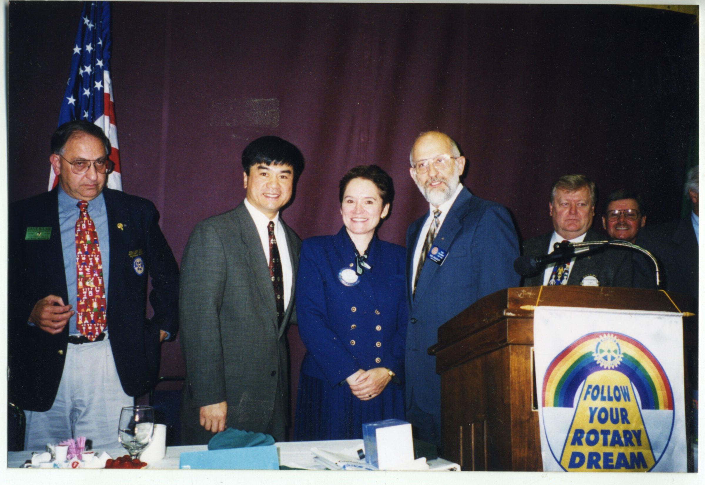 In this photograph is (left to right) Dave, the district governor before Ken Balsley, Gary Locke, Jan Teague, Ken, Lacey police chief John Mansfield, North Thurston School District Superintendent Dave Steele. This photo was taken at the District Conference at the Capital, the last time it met in Olympia before 2016. Dave is wearing tan pants, a denim shirt, red tie and black jacket. Gary Locke is wearing a grey suit, white shirt and red tie. Jan Teague is wearing a navy blue skirt and jacket with a black ascot and large button on her right lapel. Ken Balsley is wearing a blue suit with a white shirt and neutral colored tie. He has on glasses and also has a beard. There is a large pin on his left lapel. John Mansfield is standing behind a podium and appears to be wearing a grey suit with a white shirt. Dave Steele is standing behind John Mansfield and is wearing glasses. In front of all of them is a table with sugar and cream on it, cups, and napkins. There is a podium some members are standing behind that has a microphone on the top and on the front of it there is a sign that reads "Follow Your Rotary Dream." Behind them is an American flag. The reverse of the photograph reads "Kodak premium processing Dec. 1998" Digital copy of color photograph.Relationships