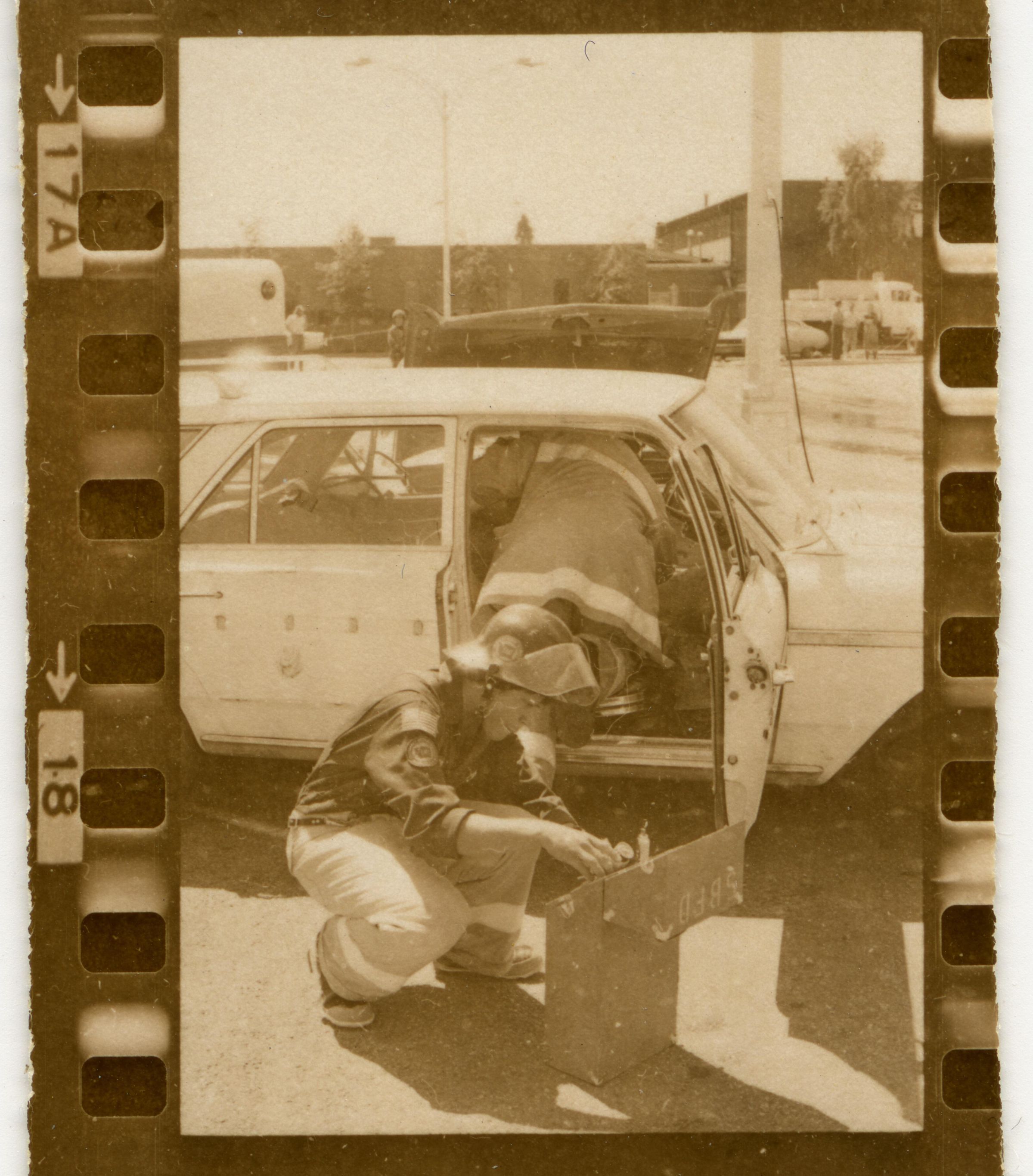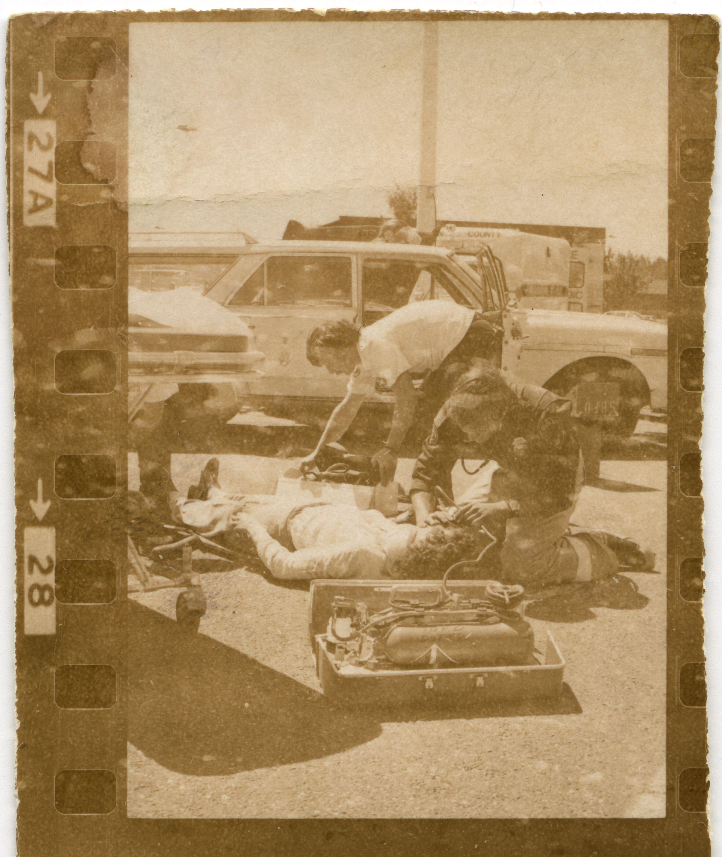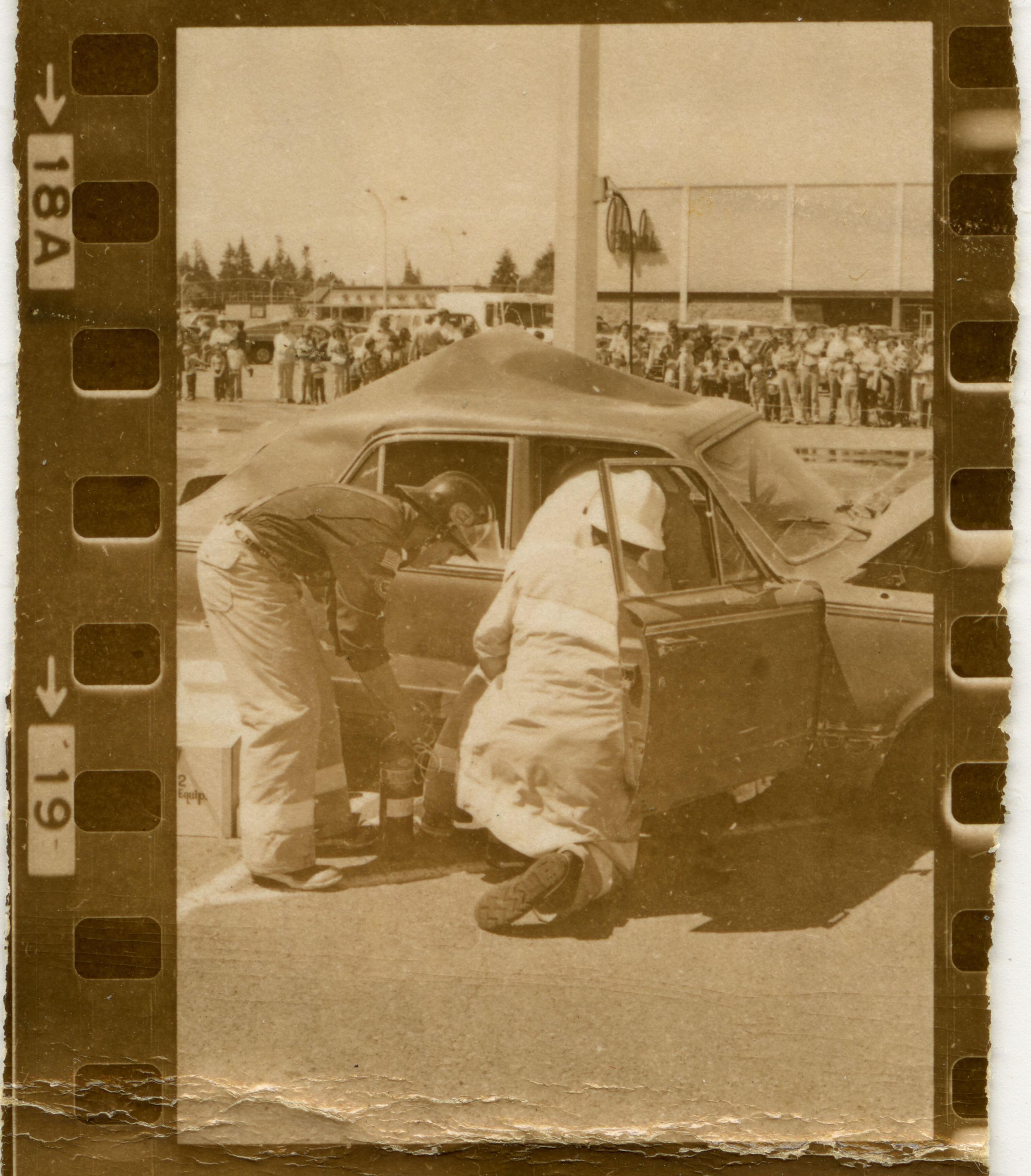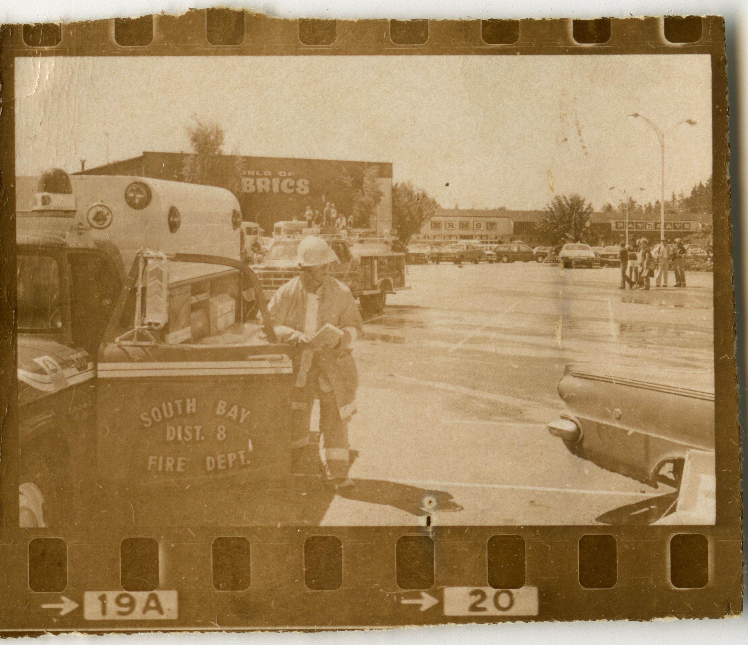 Fire Recognition Day with South Bay District 8 Fire Department. Black and white strip of 14 images originally created for the Lacey Leader newspaper. According to the sleeve these photos are of fire recognition day. In frame 28 there are two men standing over a third who is laying on the ground. One of the men is wearing a fire fighter suit. In frame 29 there is a fire fighter assisting a man on a stretcher that has a neck brace on. In frame 30 there are four men, two of them are fire fighters, assisting a fifth man who is on a stretcher with a neck brace on. Frames 31, 32 33, and 34 are very difficult to see and you are unable to identify what is occurring in the photo. Frame 35 contains the image of a man laying on the ground and another man approaching him. Frame 16 is an image of a fireman with a hose that appears to be running. Frame 17 shows two fire fighters approaching a vehicle with a person inside and a photographer taking a picture of the scene. Frame 18 shows a fire fighter looking inside a vehicle and another fire fighter looking inside a box next to the car. Frame 19 shows two fire fighters pulling a person from a car onto a stretcher. Frame 20 shows a man standing outside a fire truck which reads "South Bay Dist. 8 Fire Dept" and in the background you can see they are in the parking lot of a fabric store and there is a small group of people crossing the parking lot. Frame 21 shows two fire fighters approaching a car that has been crushed. The photos appear to be taken at the South Sound Center in Lacey.Made/Created