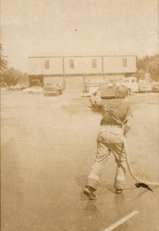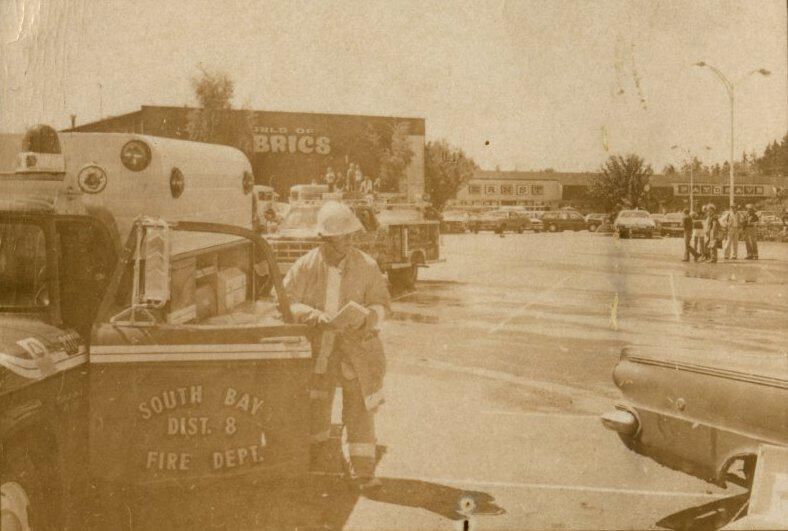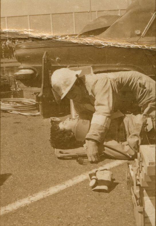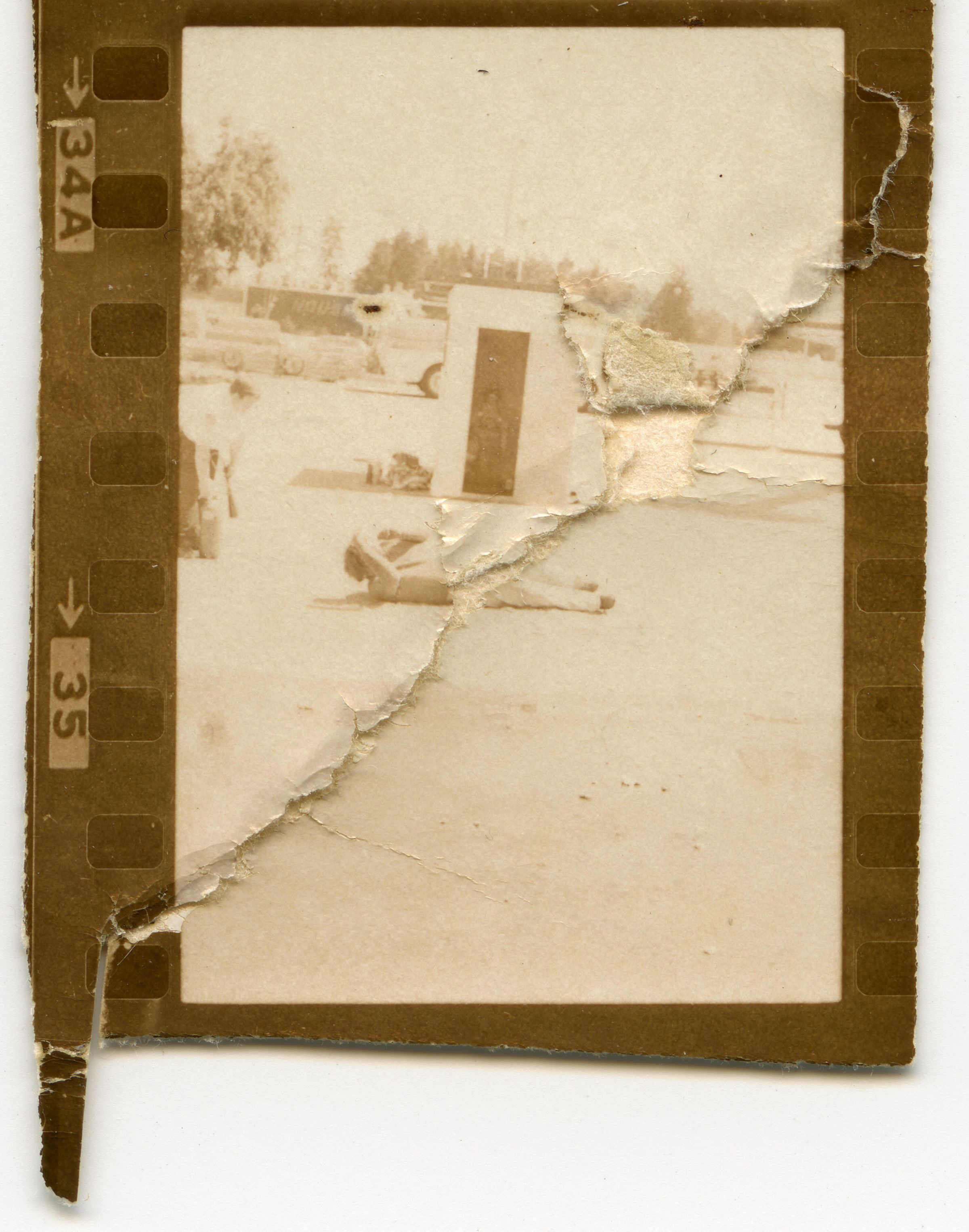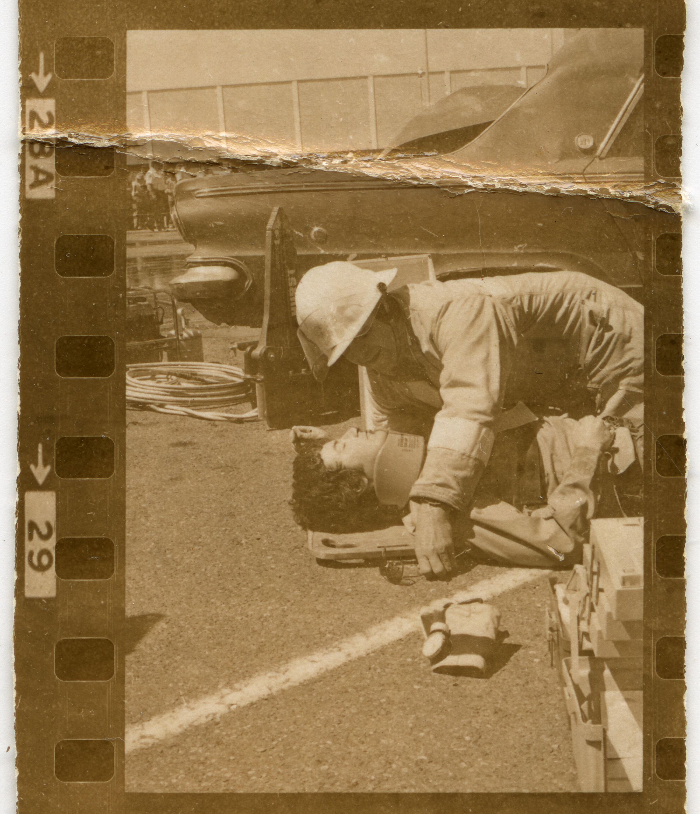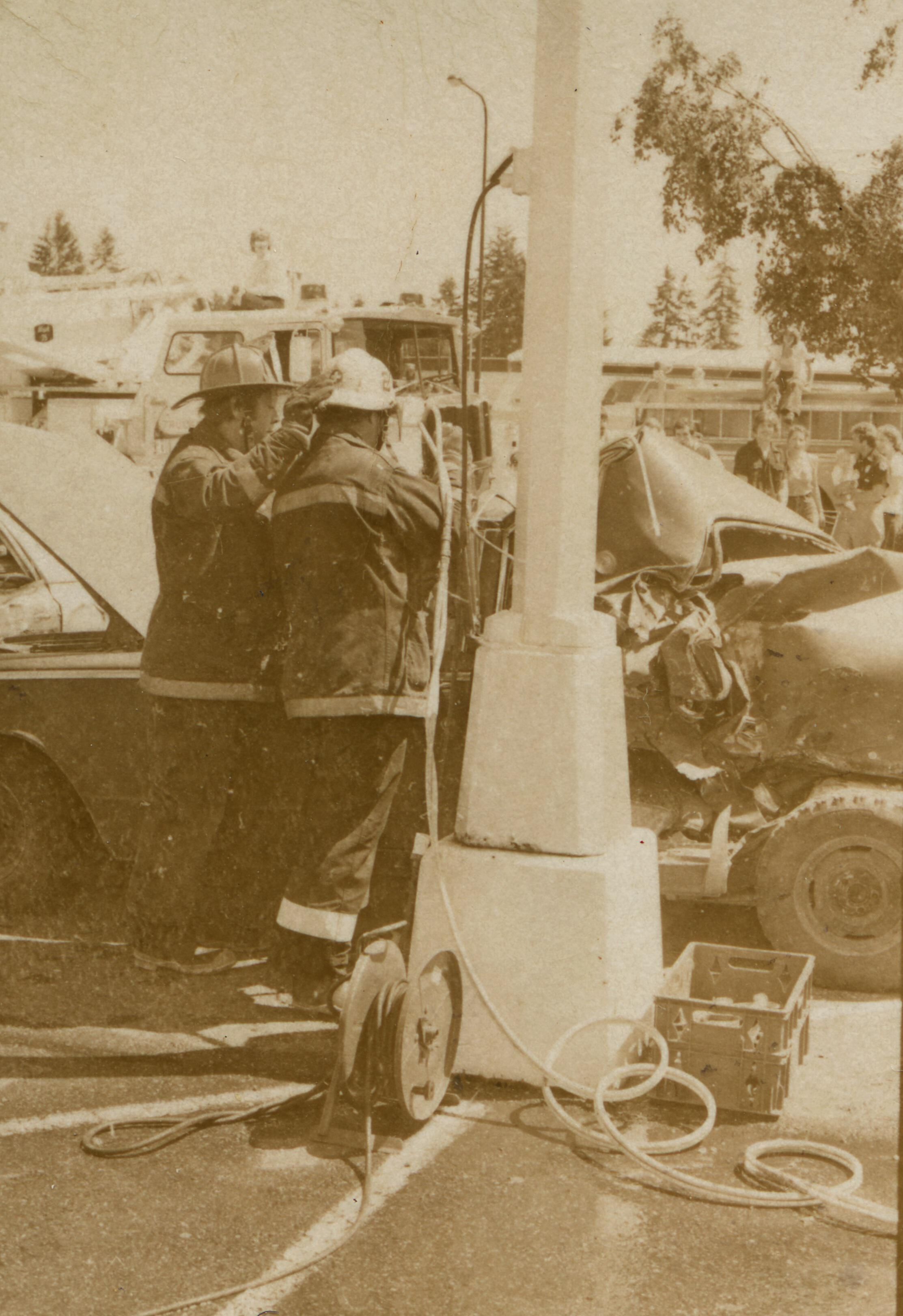 Fire Recognition Day with South Bay District 8 Fire Department. Black and white strip of 14 images originally created for the Lacey Leader newspaper. According to the sleeve these photos are of fire recognition day. In frame 28 there are two men standing over a third who is laying on the ground. One of the men is wearing a fire fighter suit. In frame 29 there is a fire fighter assisting a man on a stretcher that has a neck brace on. In frame 30 there are four men, two of them are fire fighters, assisting a fifth man who is on a stretcher with a neck brace on. Frames 31, 32 33, and 34 are very difficult to see and you are unable to identify what is occurring in the photo. Frame 35 contains the image of a man laying on the ground and another man approaching him. Frame 16 is an image of a fireman with a hose that appears to be running. Frame 17 shows two fire fighters approaching a vehicle with a person inside and a photographer taking a picture of the scene. Frame 18 shows a fire fighter looking inside a vehicle and another fire fighter looking inside a box next to the car. Frame 19 shows two fire fighters pulling a person from a car onto a stretcher. Frame 20 shows a man standing outside a fire truck which reads "South Bay Dist. 8 Fire Dept" and in the background you can see they are in the parking lot of a fabric store and there is a small group of people crossing the parking lot. Frame 21 shows two fire fighters approaching a car that has been crushed. The photos appear to be taken at the South Sound Center in Lacey.Made/Created