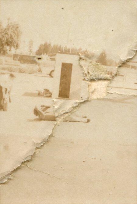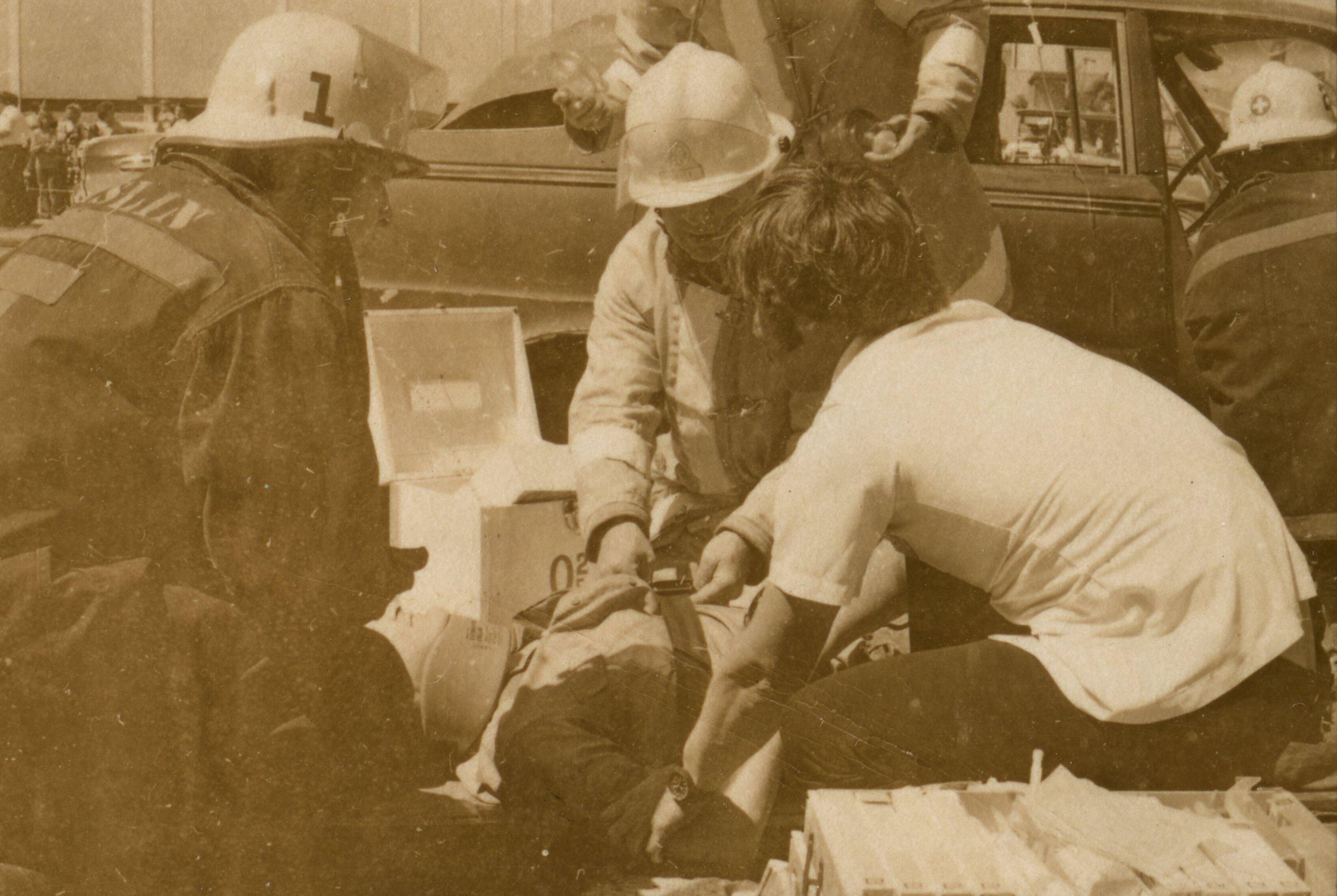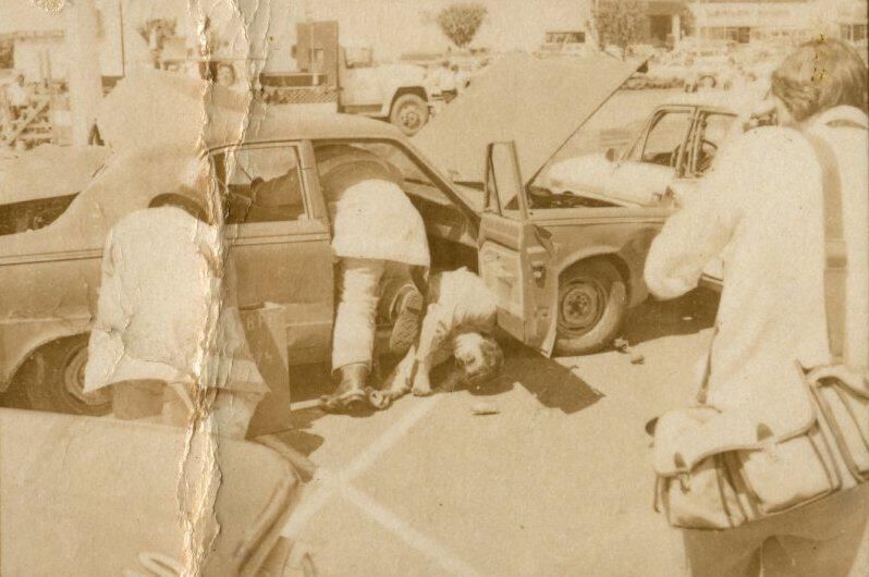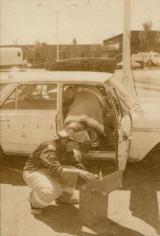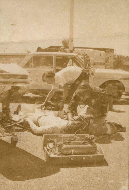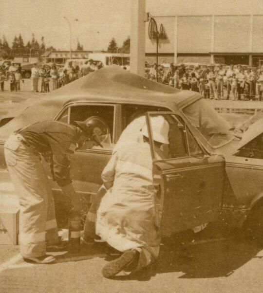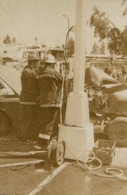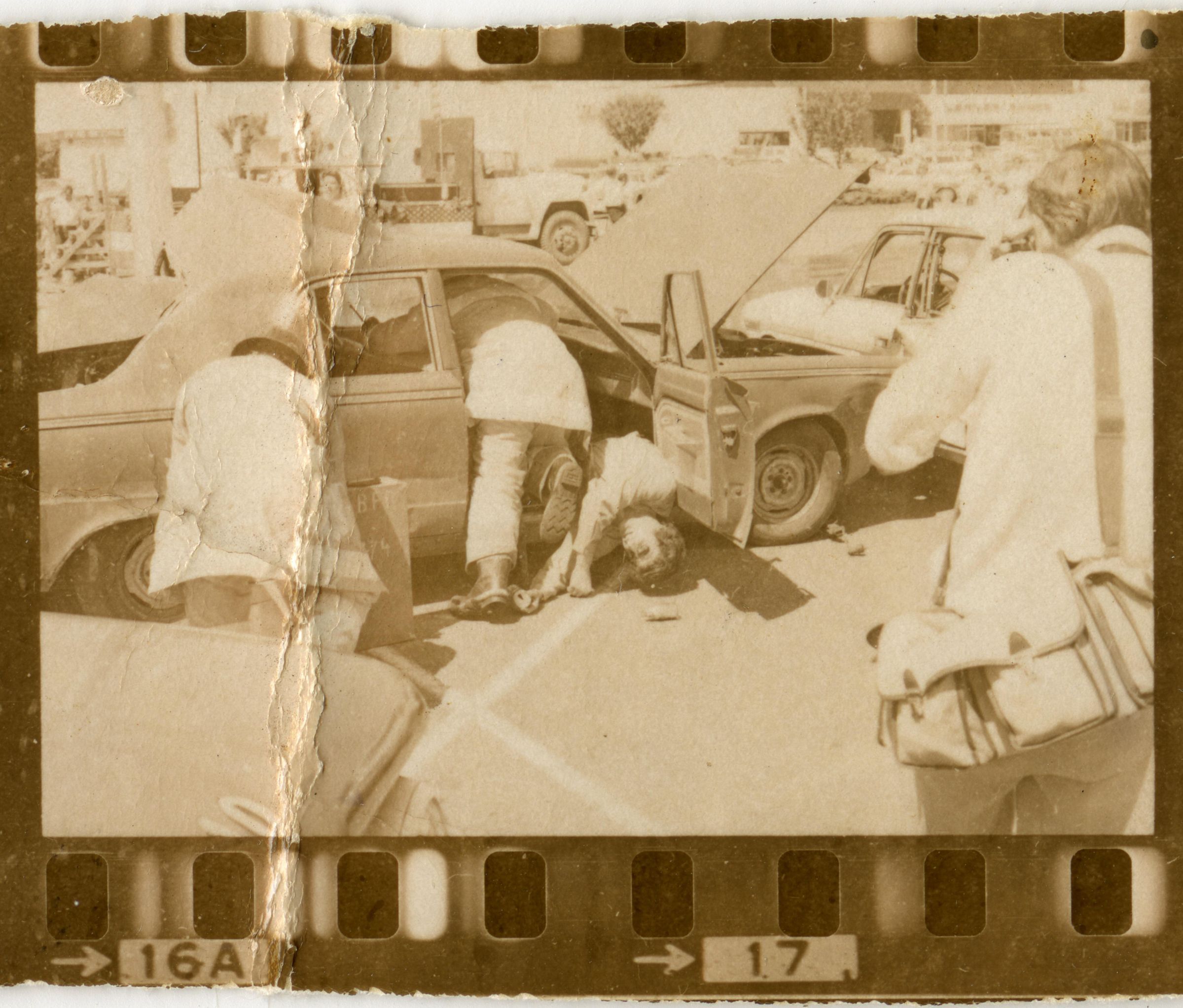 Fire Recognition Day with South Bay District 8 Fire Department. Black and white strip of 14 images originally created for the Lacey Leader newspaper. According to the sleeve these photos are of fire recognition day. In frame 28 there are two men standing over a third who is laying on the ground. One of the men is wearing a fire fighter suit. In frame 29 there is a fire fighter assisting a man on a stretcher that has a neck brace on. In frame 30 there are four men, two of them are fire fighters, assisting a fifth man who is on a stretcher with a neck brace on. Frames 31, 32 33, and 34 are very difficult to see and you are unable to identify what is occurring in the photo. Frame 35 contains the image of a man laying on the ground and another man approaching him. Frame 16 is an image of a fireman with a hose that appears to be running. Frame 17 shows two fire fighters approaching a vehicle with a person inside and a photographer taking a picture of the scene. Frame 18 shows a fire fighter looking inside a vehicle and another fire fighter looking inside a box next to the car. Frame 19 shows two fire fighters pulling a person from a car onto a stretcher. Frame 20 shows a man standing outside a fire truck which reads "South Bay Dist. 8 Fire Dept" and in the background you can see they are in the parking lot of a fabric store and there is a small group of people crossing the parking lot. Frame 21 shows two fire fighters approaching a car that has been crushed. The photos appear to be taken at the South Sound Center in Lacey.Made/Created
