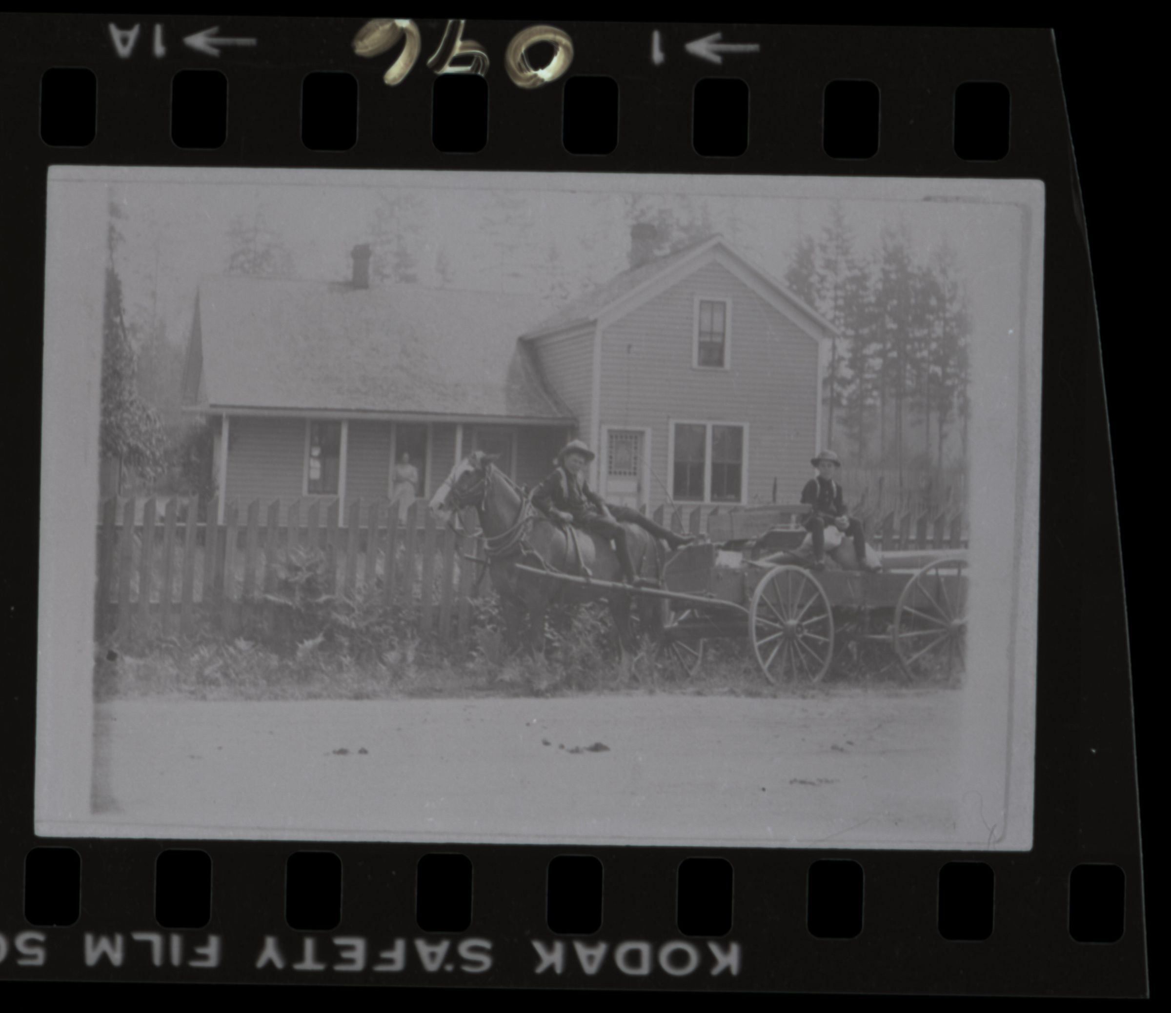 Kagy House. A horse and wagon are in front of the picket fence. A boy sits atop the horse and another in the wagon. A woman stands on the front port of this L-shaped house. There are three thin columns on the front porch. There are tall pine trees in the background.