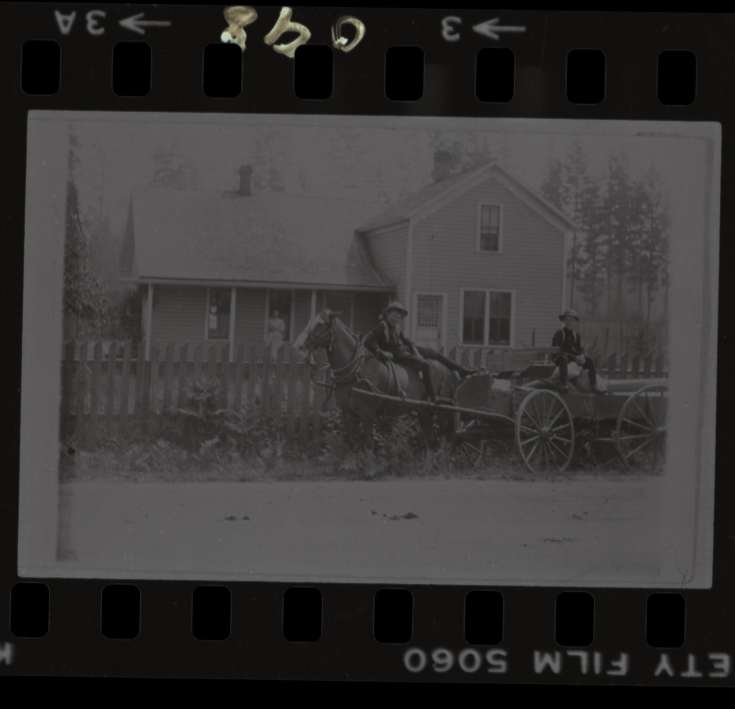 Kagy House. A horse and wagon are in front of the picket fence. A boy sits atop the horse and another in the wagon. A woman stands on the front port of this L-shaped house. There are three thin columns on the front porch. There are tall pine trees in the background.