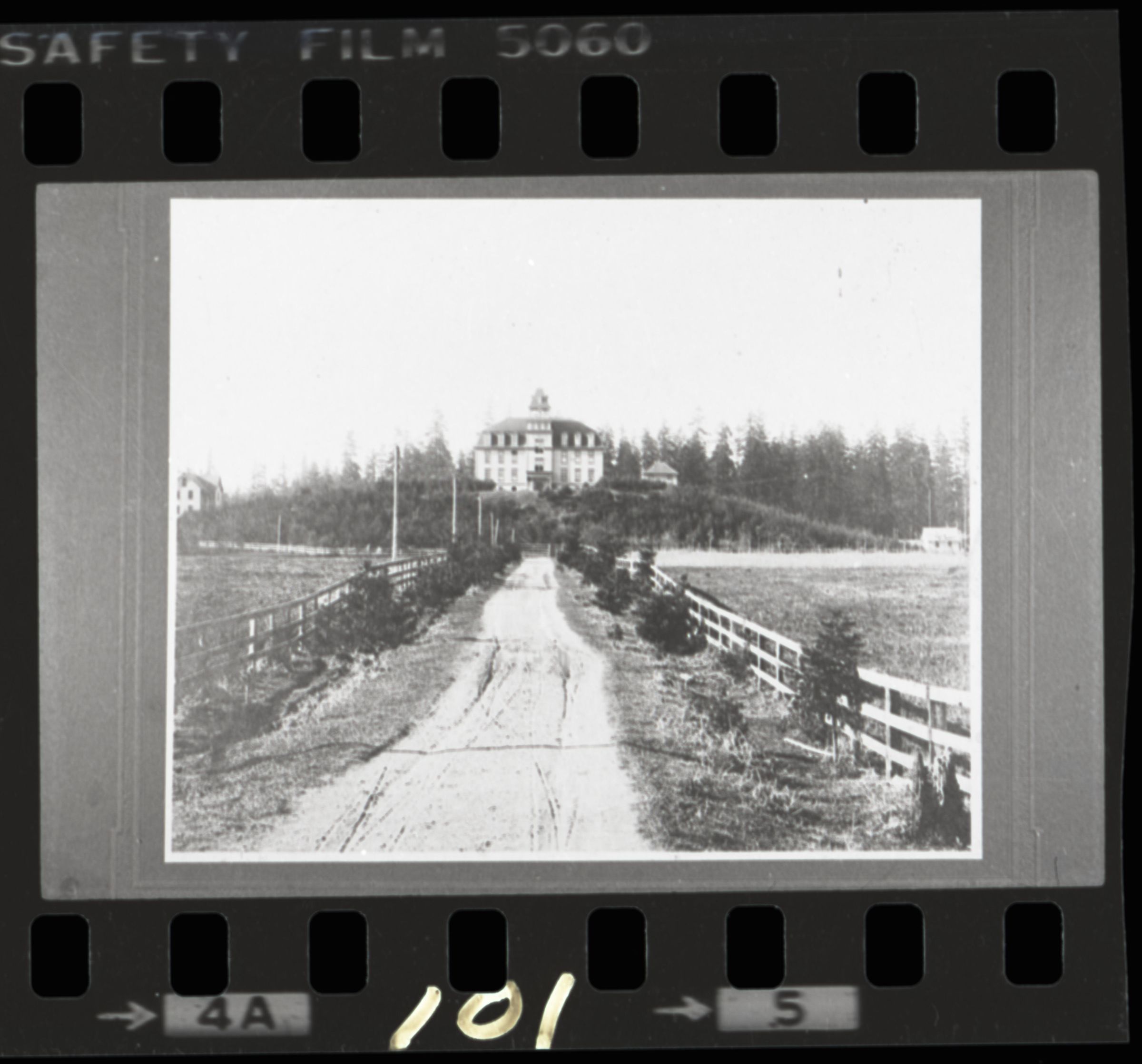 Negative is one on a strip of two images, frame number 5. Printed at the bottom is frame number "5" and to the left "4A." "101" is handwritten directly onto the bottom edge of the negative. At the top is printed: "[Kodak] Safety Film 5060".Made/Created