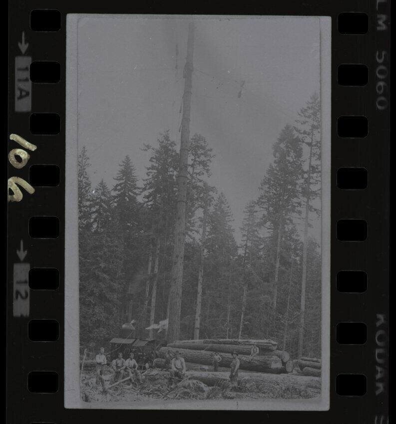 Logging in Lacey. Black and white negative made from an original 3 x 5 print probably from the George Elder photo album. Image features nine lumberjacks, four are sitting on felled logs and the remainder are standing. There is a large piled of felled trees and a steam donkey engine at the left with steam coming off the top. They are among a large stand of tall pine trees. One in the center is stripped bare of branches and has ropes tied around it at intervals with a longer rope hanging down.