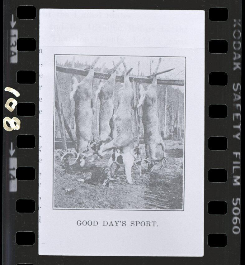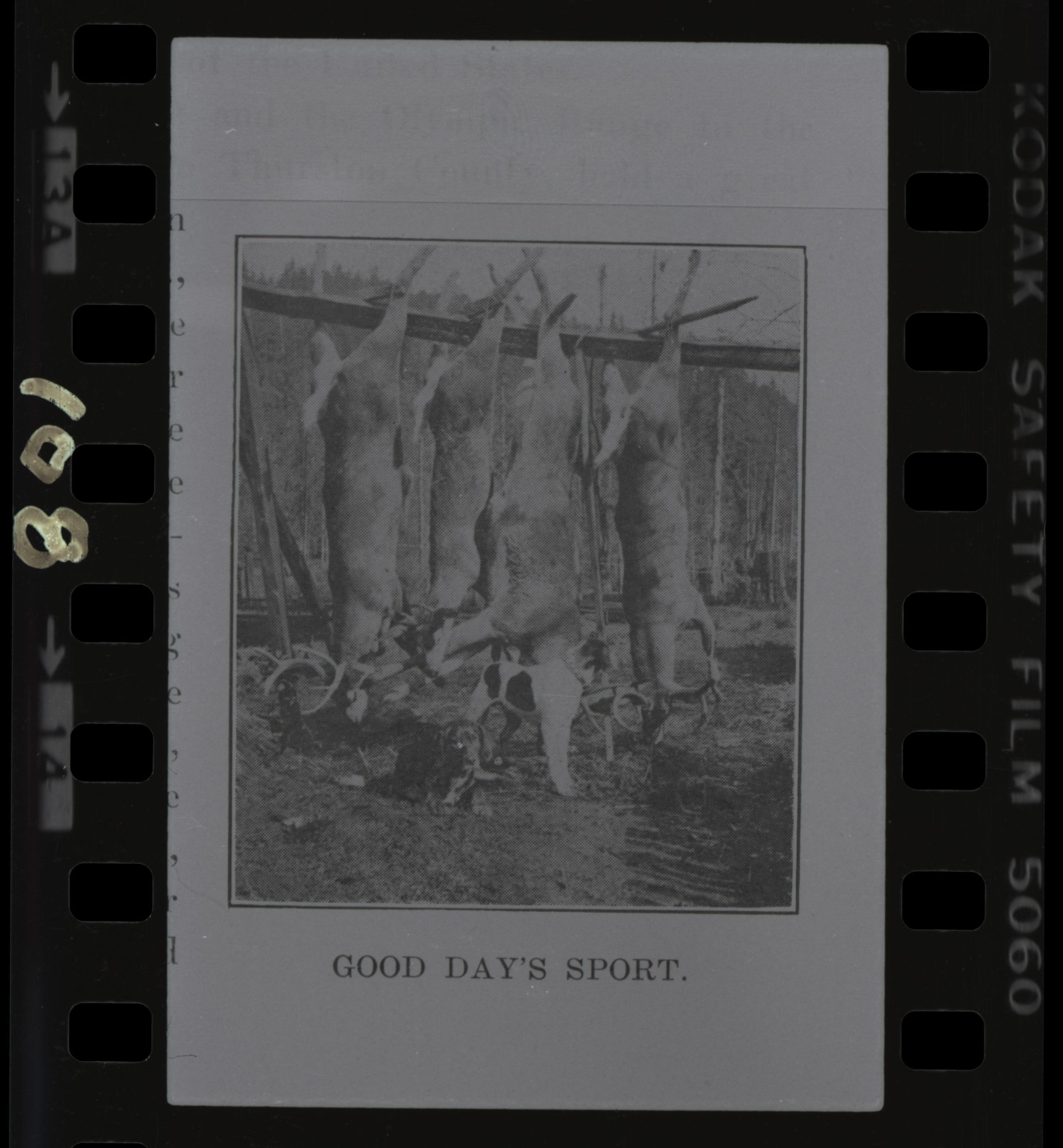 Good Day's Sport. Black and white negative probably created from a slide of a photo in "Olympia," a circa 1907 Olympia Chamber of Commerce promotional brochure or booklet. Pictured is four dead deer, at least three of which are bucks, hanging from a wooden frame. Two hunting dogs are in front of them; at left, a labrador retriever is lying on the ground and at right, a terrier is standing. In the background is a large stand of tall evergreen trees. Image is surrounded by a thin black line. Underneath is the title "Good Day's Sport." Text can be seen just to the left of this image.