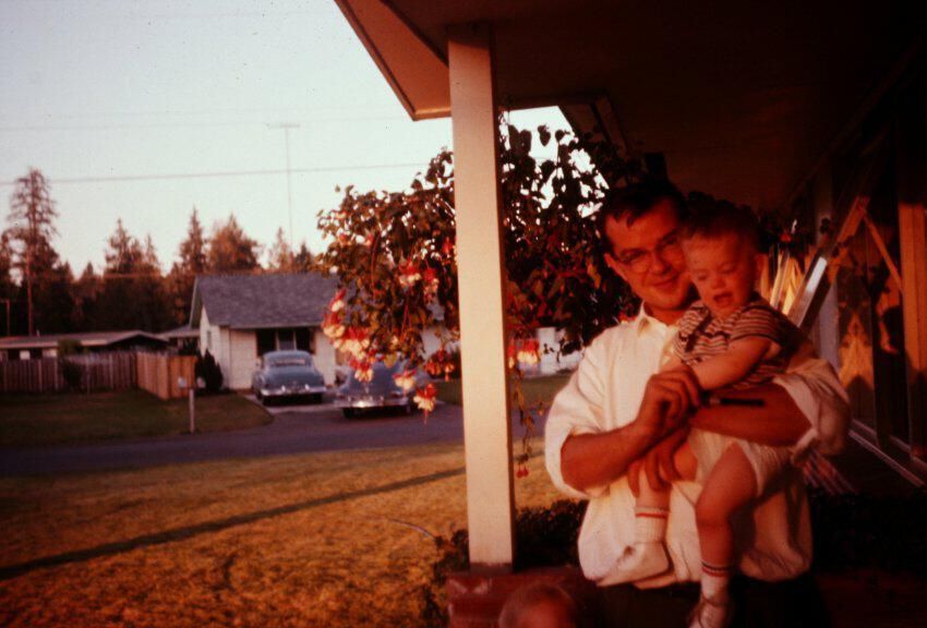 Robert Chamberlain holding his son, Richard Chamberlain, at the Chamberlain House in 1961. Color image scanned from a slide. The photograph, probably taken by Richard Weideman, was taken from the front porch of 1740 Cedar (now Gemini) near the door. Only a column and eave of the house is visible. A fuschia plant hangs from the eave. It appears to be late evening judging by the light. Bob is wearing glasses, dark pants and a white long-sleeved shirt with the sleeves rolled up. Richard, about one year old, is wearing a brown striped short sleeve shirt, a diaper and white baby shoes with red and blue stripes at the top. There is a white house visible across the street on Sycamore. There are two early 1950s style cars in the driveway.
