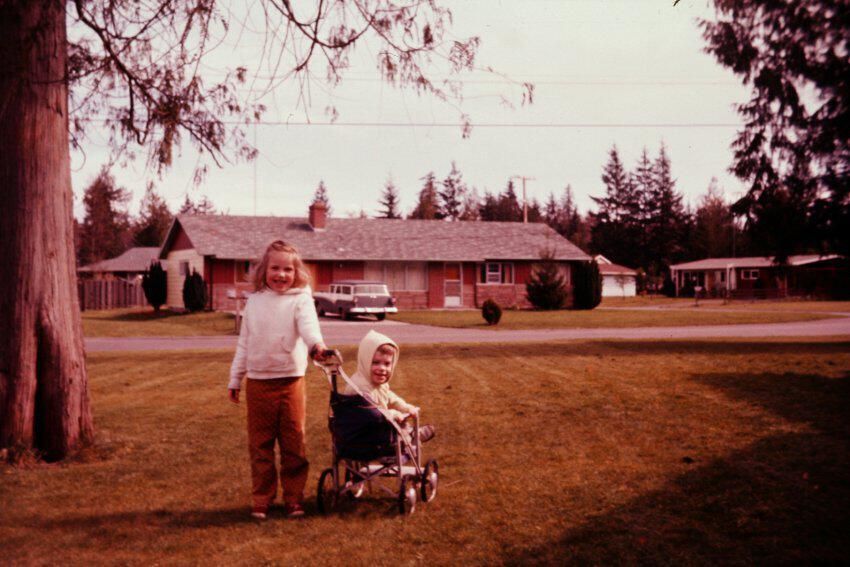 Becky and Richard Chamberlain at the Chamberlain House in 1962. Color image scanned from a slide. The photograph, taken by their dad, Bob Chamberlain, was taken from the driveway of 1740 Cedar (now Gemini) facing east. The cedar tree is visible at the left edge of the photo. Becky is standing with her left hand on a stroller facing the opposite direction which holds her brother, Richard, who is turned in the seat to face the camera. She is wearing a white hoodie and red pants with red tennis shoes and a big smile. Richard is wearing a light-colored hooded sweater with the hood up. The stroller is chrome and blue fabric. There is a red house with brick trim visible across the street on Sycamore. There is a late 1950s style car in the driveway. Another brown house can be seen in the distance at the far right where Alder Street abuts Sycamore Street.Made/Created
