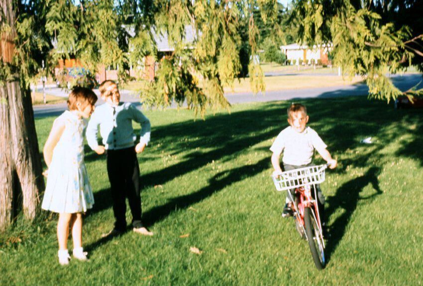 David, Becky and Richard Chamberlain at the Chamberlain House, probably on Easter in 1966. Color image scanned from a slide. The photograph, taken by their dad, Bob Chamberlain, was taken from the front of 1740 Cedar (now Gemini) facing east. The cedar tree is visible at the left edge of the photo and has grown considerably since earlier photos. Becky, age 8, is standing with her arms behind her back facing her brother, Richard, age 6. She is wearing a sleeveless printed floral dress with white shoes. David, 10, stands next to her wearing black slacks and a blue cardigan sweater. Richard is riding the red bicycle seen in 2016-002-0003, which now has a white basket. Richard is wearing gray pants and a light-colored short sleeved shirt. There is a red house with brick trim visible through the trees across the street on Sycamore. There is a brown or red car in the driveway. Another brown house can be seen in the distance at the far right where Alder Street abuts Sycamore Street.