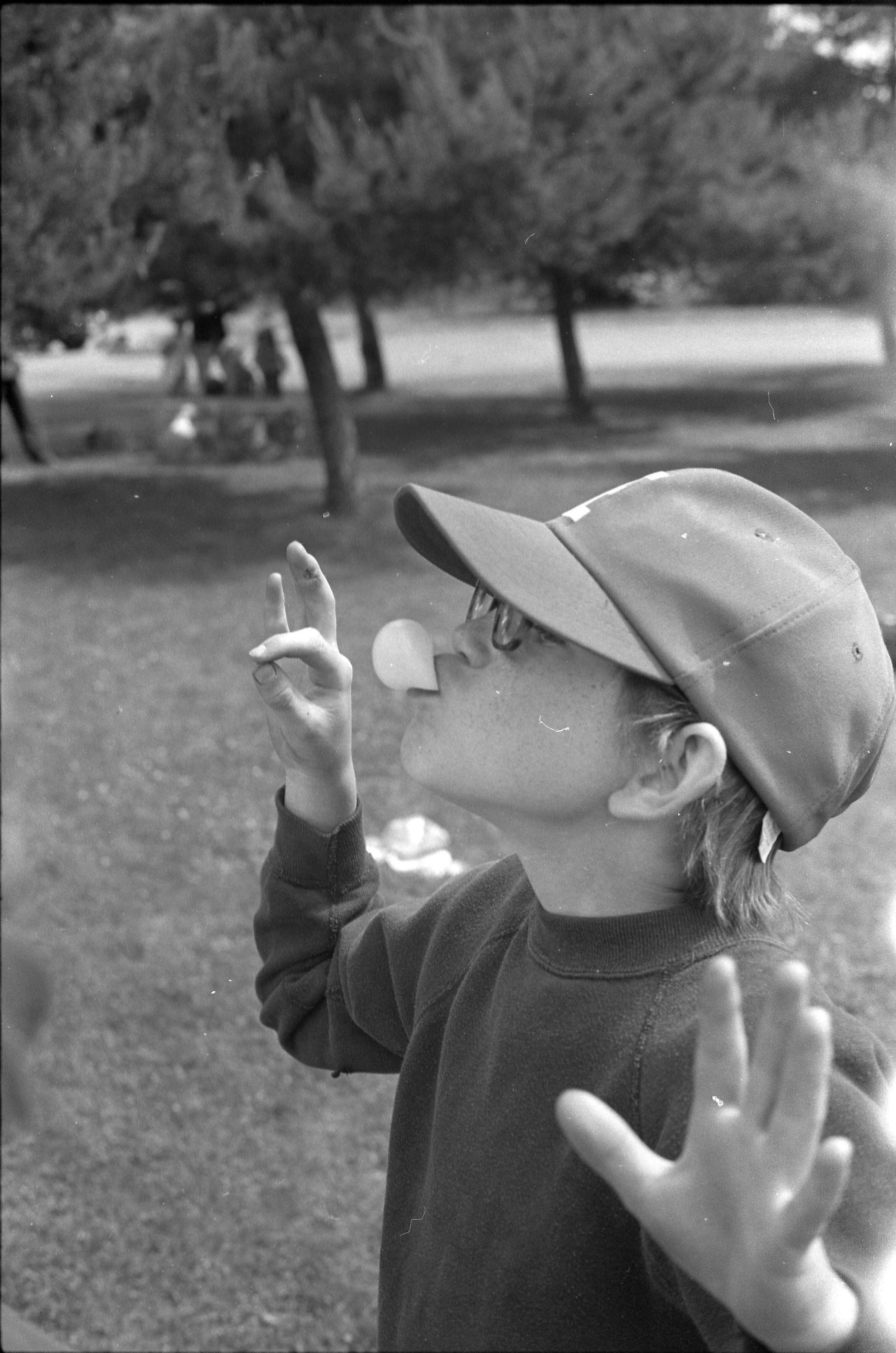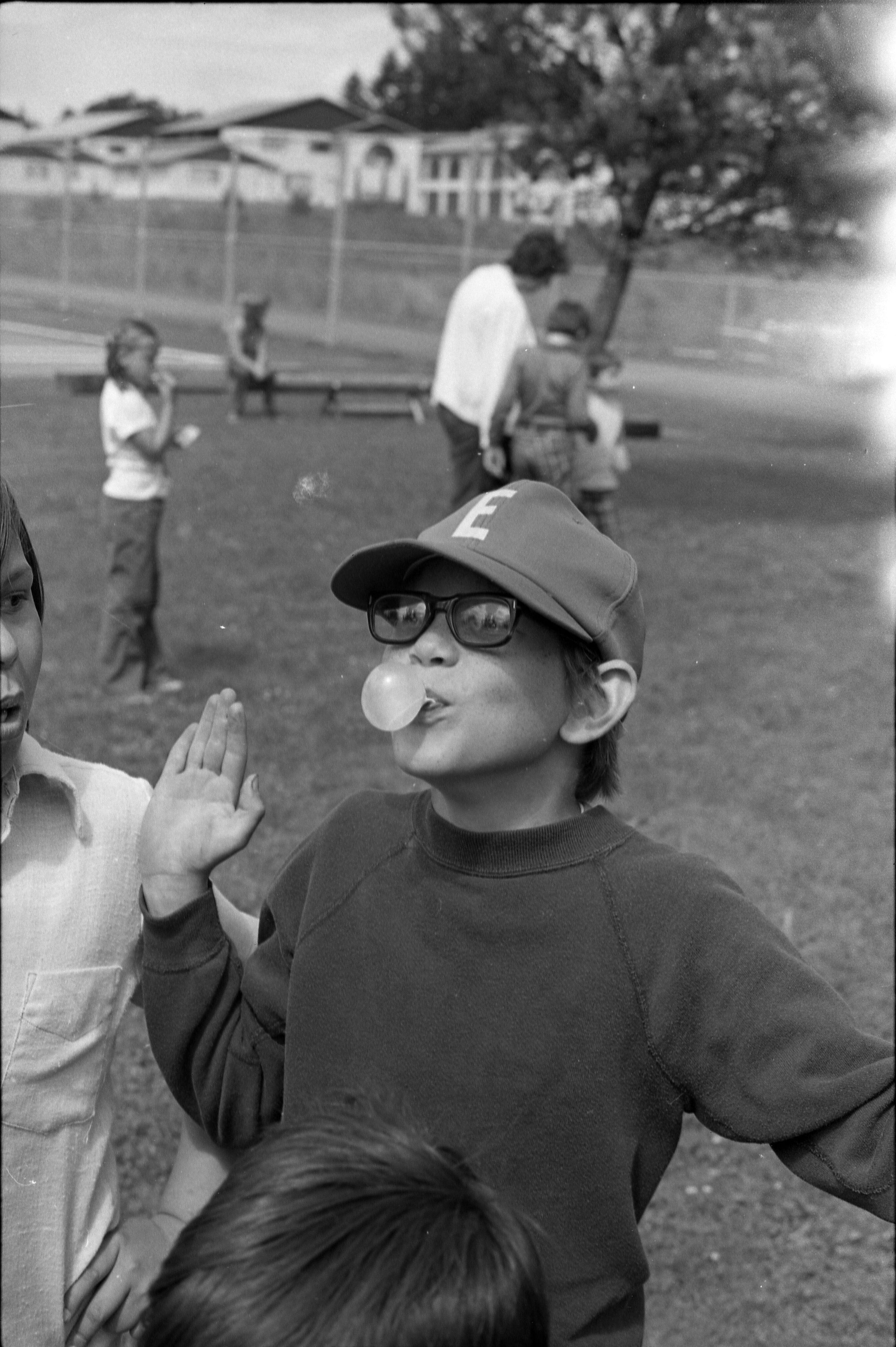 Frame 2 is the image of a street, lined with trees and a car traveling on the road. Frame 1 is of a boy with what appears to be chewing gum in his hands. Frame 44 shows a young girl blowing a bubble with her chewing gum. Frame 43 is an image of a little girl blowing a bubble with her chewing gum and a boy is standing next to her. Frame 42 shows a boy with a hat on and glasses who is also blowing a bubble with his chewing gum. Frame 41 shows a side view of the boy with glasses and a hat on blowing a bubble with his chewing gum. Frame 40 shows two boys pushing rubber tires and there are two children standing between them. Frames 39 and 38 show people hammering nails into a wooden plank. Frame 37 shows the same two boys pushing the rubber tires while other children stand around them.Made/Created