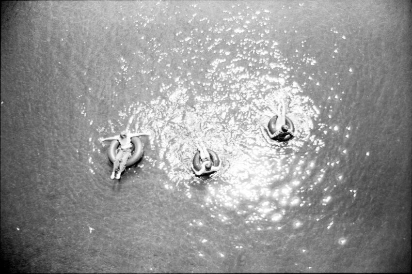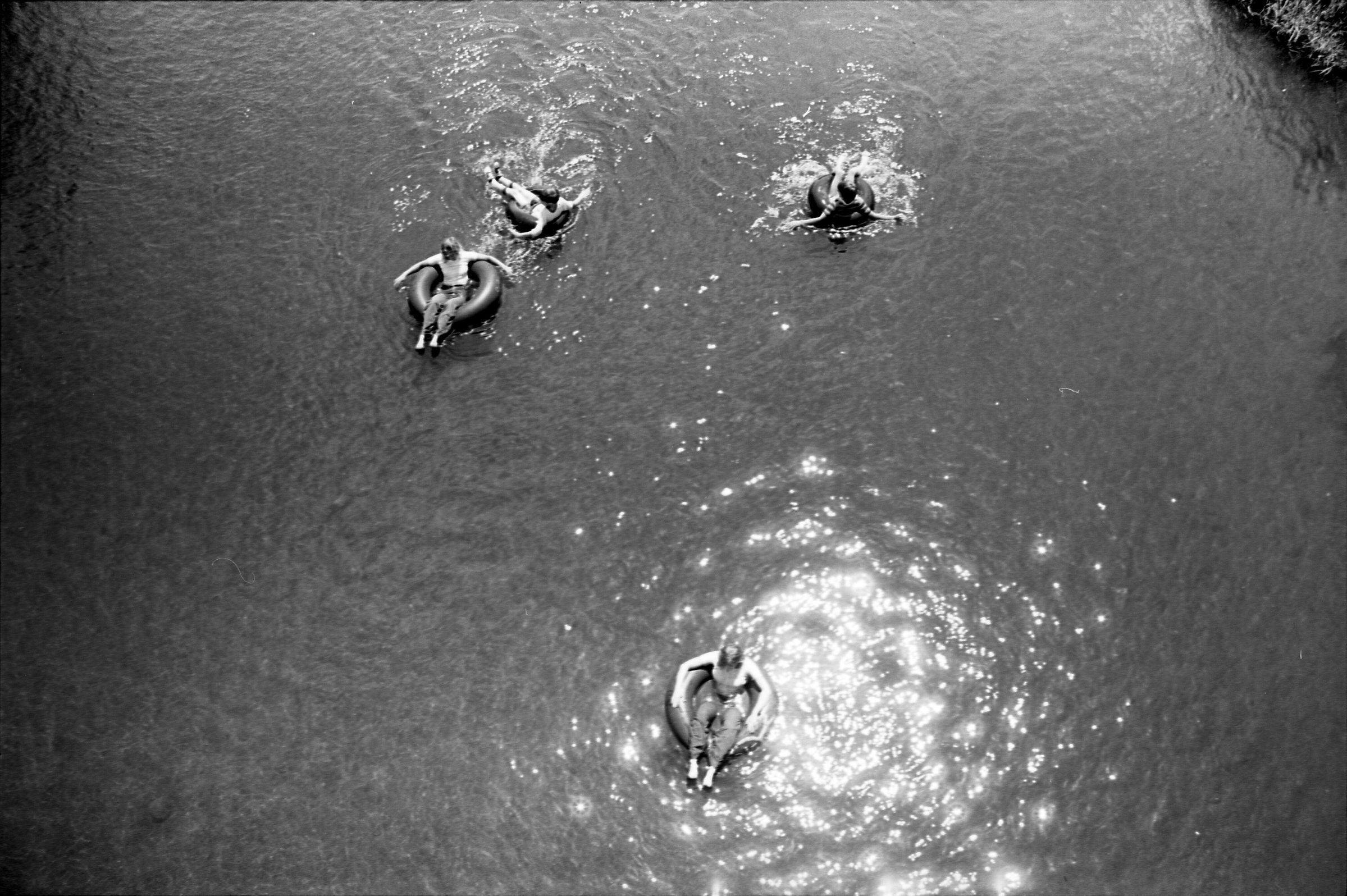 These images all show groups of people floating down the Deschutes River in inner tubes. Frame 30 shows a group of three people floating down the river and you can see trees on either side. Frame 31 is a group of 4 people floating. Frame 32 is a group of 3 people floating. Frame 33 shows approximately 6 people floating and are passing buildings. The event was a fund raiser called "Shoot the Deschutes" where people would pay to float in their inner tube down the Deschutes river.Made/Created
