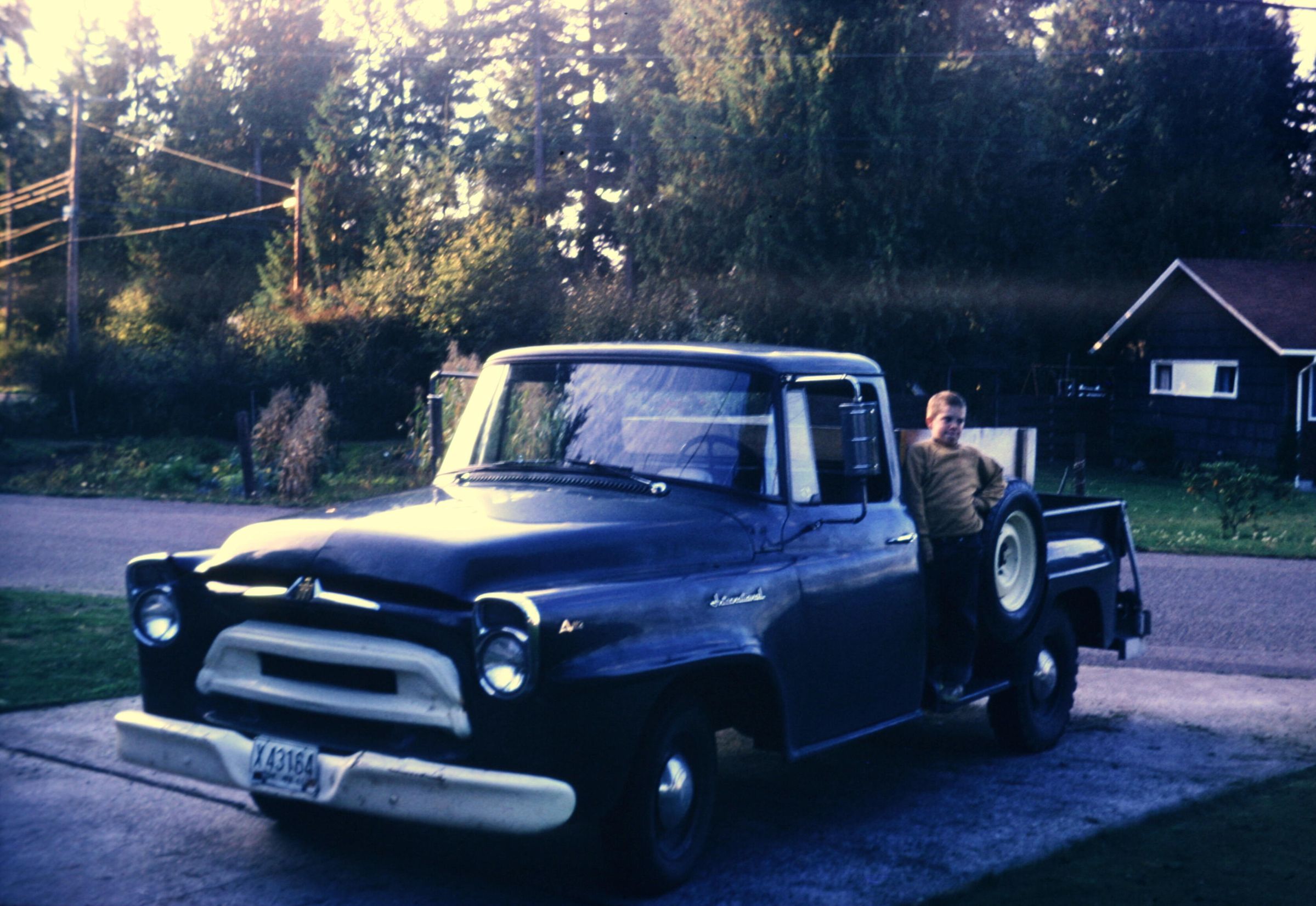 Richard Chamberlain, age 7, on the running board of his dad's truck in the summer of 1967. Color image scanned from a slide. The photograph, taken by his dad Bob Chamberlain, was taken from the porch of 1740 Cedar (now Gemini) facing northwest. The main feature of the photograph is of a dark blue or black late 50s or early 60s International Truck A series which is parked in the driveway and has a load in the back. Richard, dressed in dark pants and a brown sweater is standing on the running board leaning on the truck with his left hand on his hip.