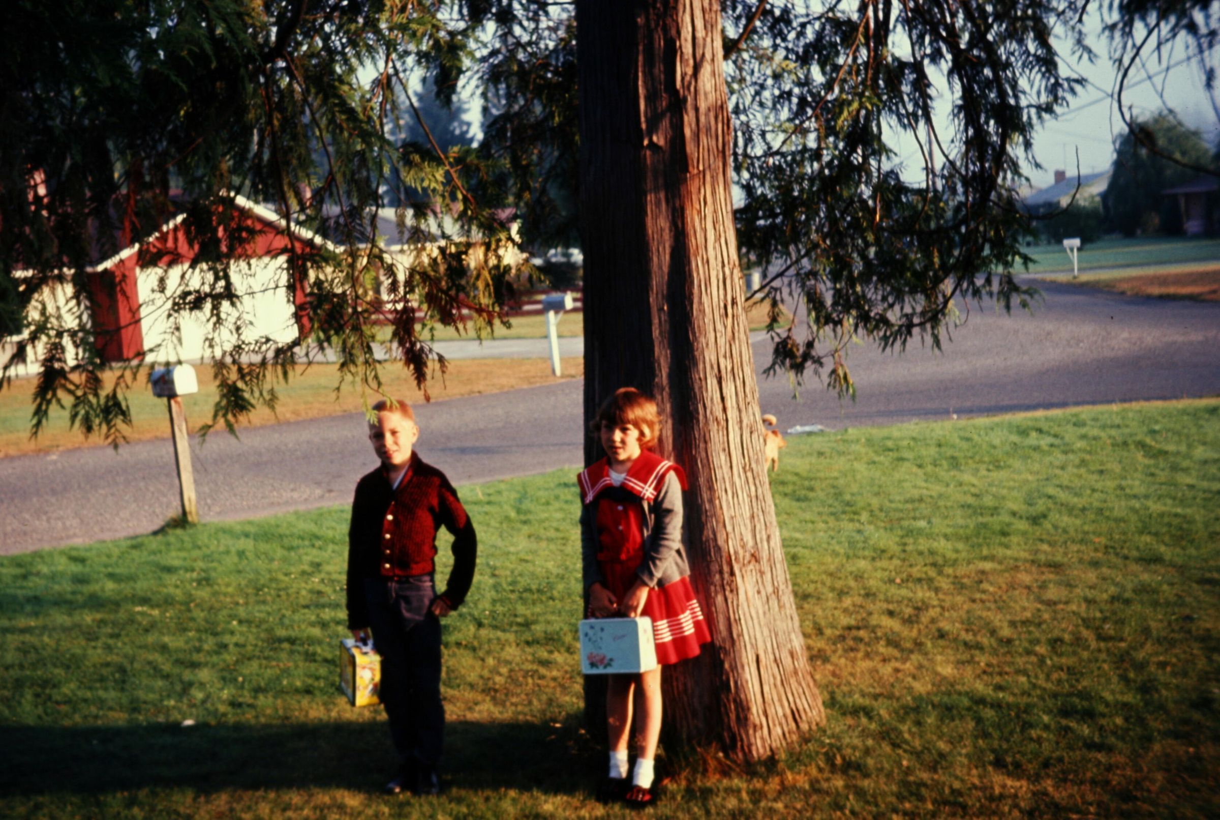 Becky and David Chamberlain on the first day of school in 1964. Color image scanned from a slide. The photograph, taken by their dad Bob Chamberlain, was taken on the lawn of 1740 Cedar (now Gemini) facing north. The children are standing underneath the large cedar tree in the front yard. Becky, age 6, is leaning against the tree holding a white lunchbox with flowers on it. She is wearing a red sailor style dress with middy collar and white striped trim, gray sweater and red shoes. David, age 8, is wearing dark pants, red sweater, and is holding a yellow lunchbox with some type of characters on it. In the background, a red house across Cedar Street is visible through the tree branches.