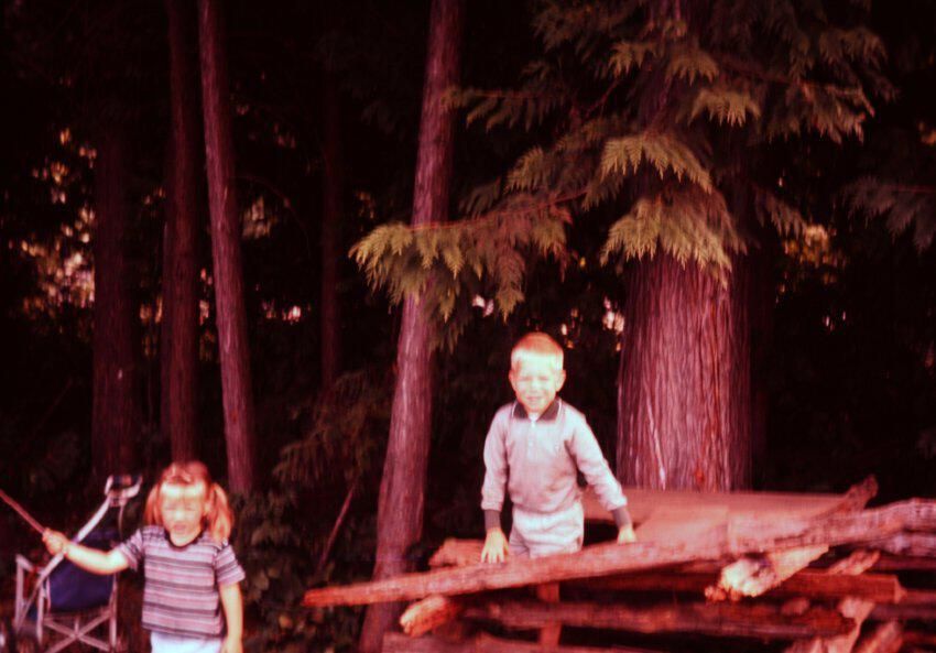Becky and David Chamberlain behind their house in about 1960. Color scanned image taken from a slide. The photograph, taken by Robert Chamberlain, shows the extent of the wooded buffer between 1720 Cedar (now Gemini) and Ruddell Road. Becky, who is about three is holding a stick and wearing a striped blue t-shirt and pigtails. David, about age 5, stands atop a stack of split cedar rails wearing a long-sleeved blue shirt with a collar and a big smile.Made/Created