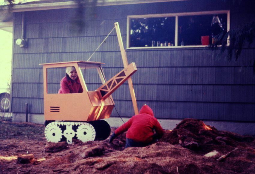 Becky and David Chamberlain playing steam shovel beside their house in about 1961. Color scanned image taken from a slide. The photograph, taken by Robert Chamberlain, was taken facing east from the side yard looking at the garage of 1720 Cedar (now Gemini). It shows the kids playing in the dirt with a plywood contruction machine their dad built which included a rope pulley that actually worked the shovel. Becky's back, in a red jacket, is facing the camera while she is busy doing something in the dirt. David, sits inside the steam shovel controlling the rig. He is wearing a red coat and a knit hat.