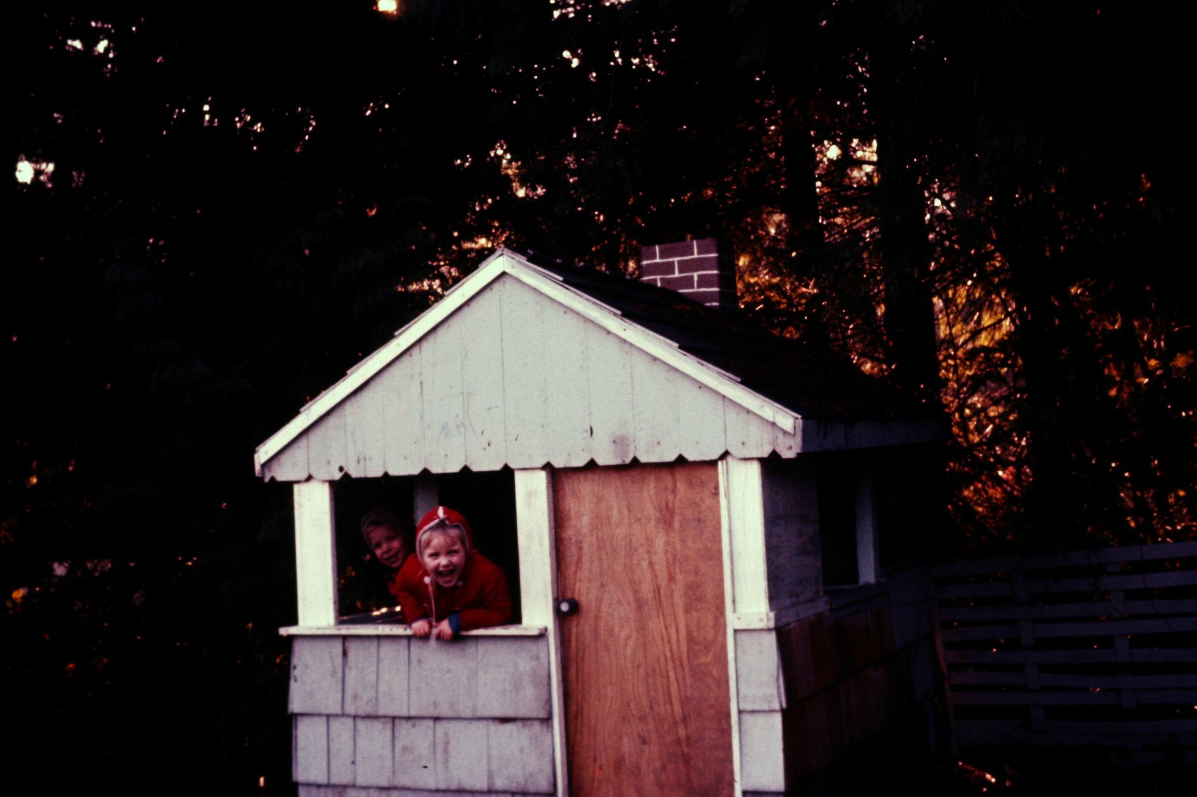 Becky and David Chamberlain playing in their playhouse about 1961. Color scanned image taken from a slide. The photograph, taken by Robert Chamberlain, was taken from the side of 1720 Cedar (now Gemini). It shows the kids playing in a playhouse their dad built for them with gray siding, a real door and a roof. Becky, laughing, is leaning out the front window in a red hooded sweater with the hood up. David is tucked behind her with his head just visible behind her.
