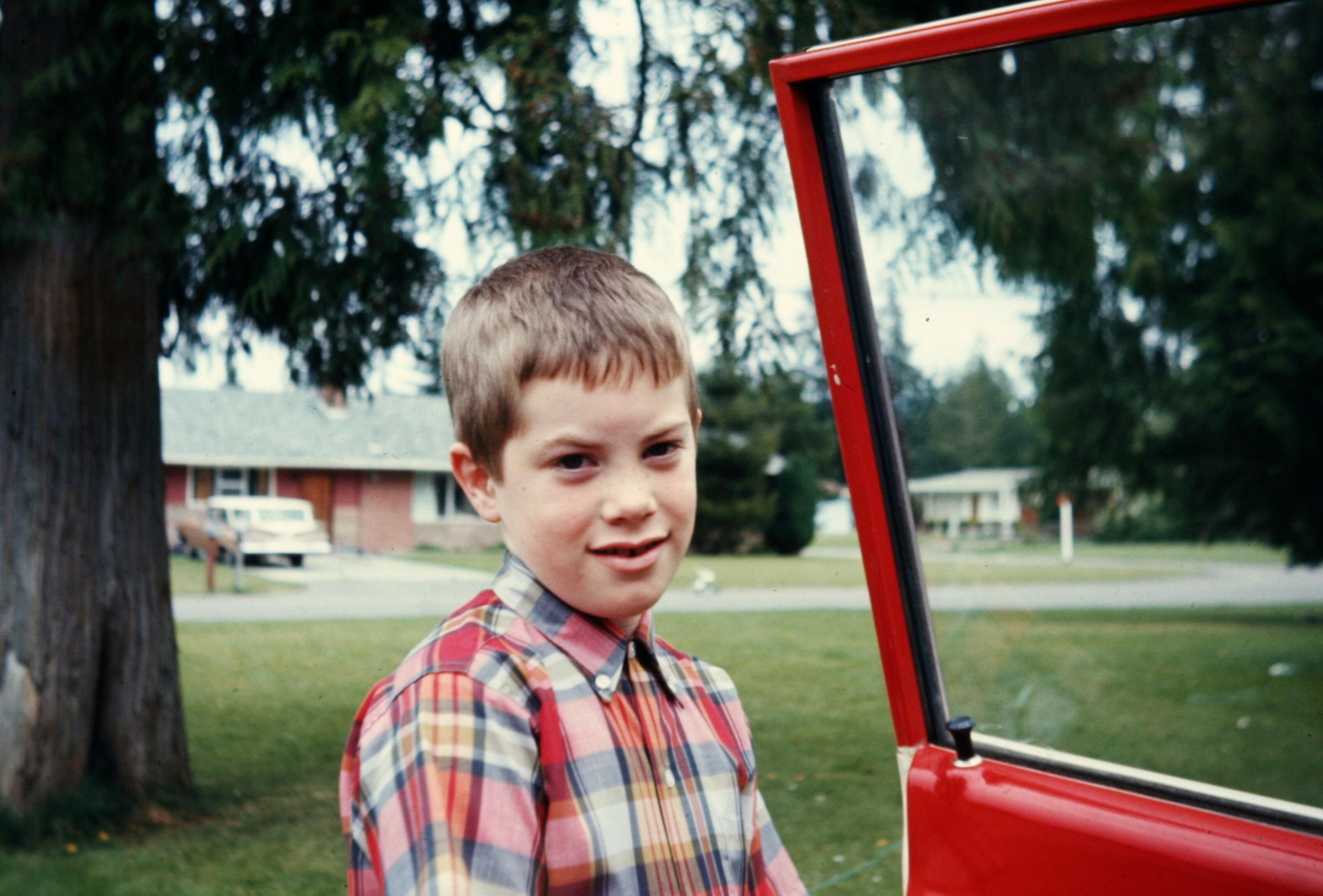 Richard Chamberlain, probably 1968. Color image scanned from a slide. The photograph, taken by donor's father, Bob Chamberlain, was taken in the front yard of 1740 Cedar (now Gemini) facing east from Bob's vehicle in the driveway. The red car door can be seen at right. Richard Chamberlain, about 8, is the main subject. The large cedar tree is seen in the foreground as is the house across the street (Hollingsworth/Golden family).Made/Created