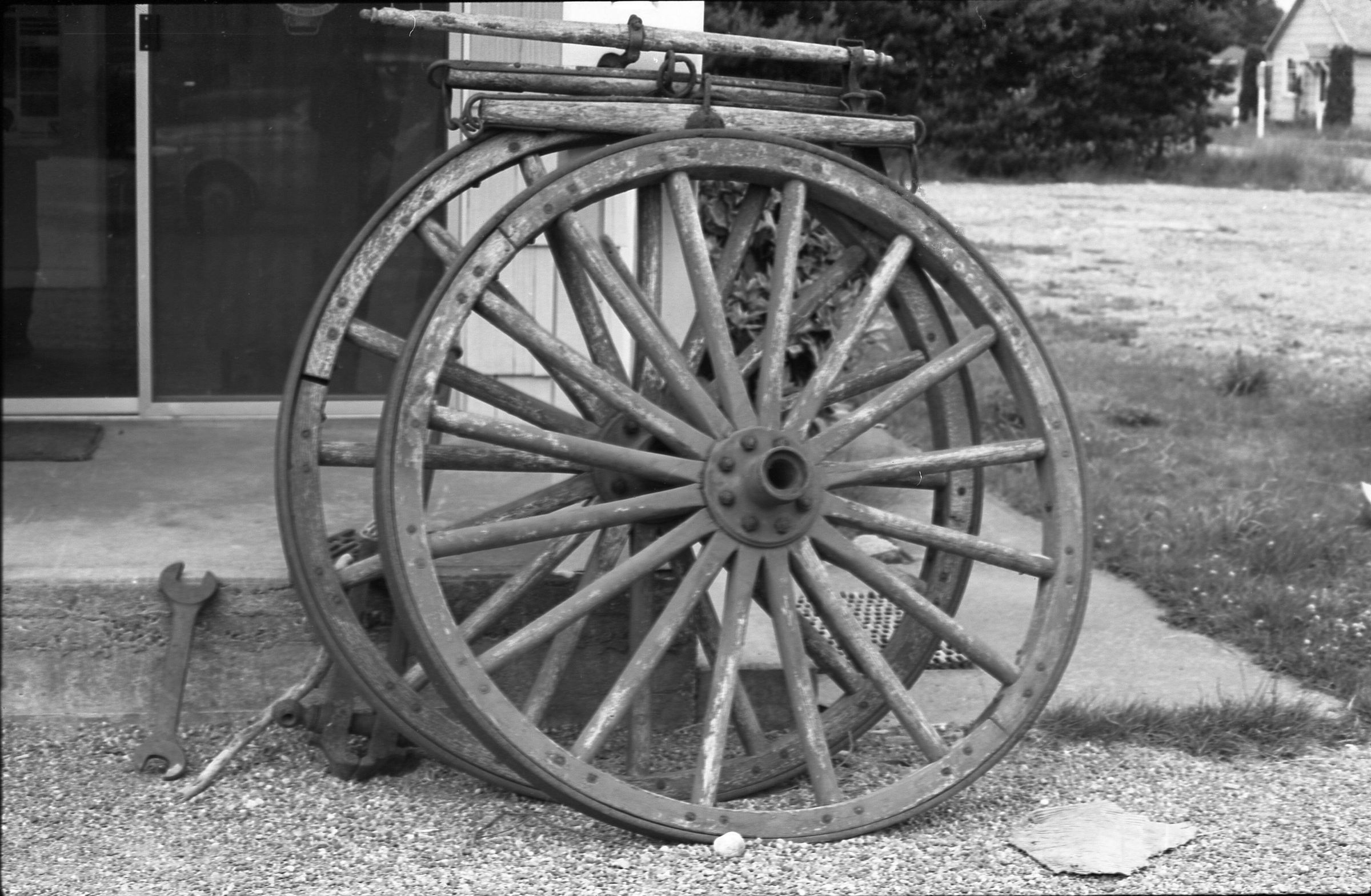 In frame 20 you see the side angle of the wagon. two wheels are visible as well as the side of the wagon. In the strip containing frames 21-25: Frame 21 is a view of the wagon where you are able to see the side and end of the wagon. Wooden planks line the side of the wagon and the back appears to have a gate that can drop down. Frame 22 shows the end of the wagon. Behind it, a car is visible as well as a sign that reads "Lawn Mowers $39.95 U.S.A. Made." Frame 23 shows the lower side of the wagon. Due to the angle you are able to see three of the wheels and the wood on the sides. Frame 24 shows a vertical view of the seat of a different wagon. There are two large wheels on either side of it. Frame 25 shows a horizontal view of the seat. Both wheels are visible on either side of the seat as well as what appears to be hand bar to hold on to. In the strip containing frames 26-30: Frame 26 shows the seat portion of the wagon. There are four large wheels and wood siding around the floor boards of the wagon. Frames 27 and 28 show different views of the wagon seat from the front. Frames 29 and 30 show wooden wheels leaning up against the side of a building.Made/Created
