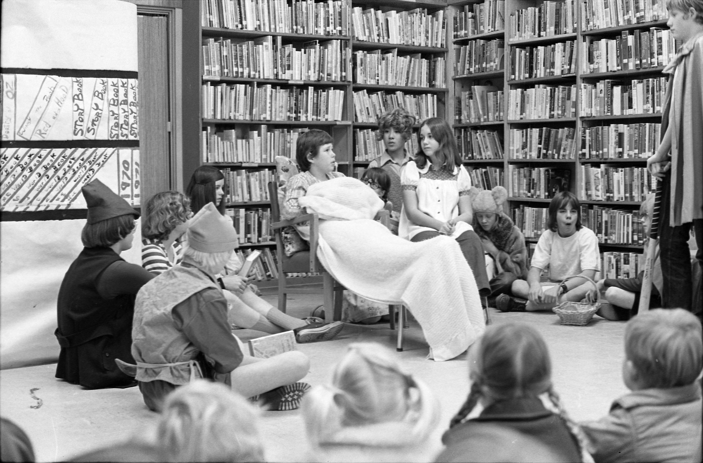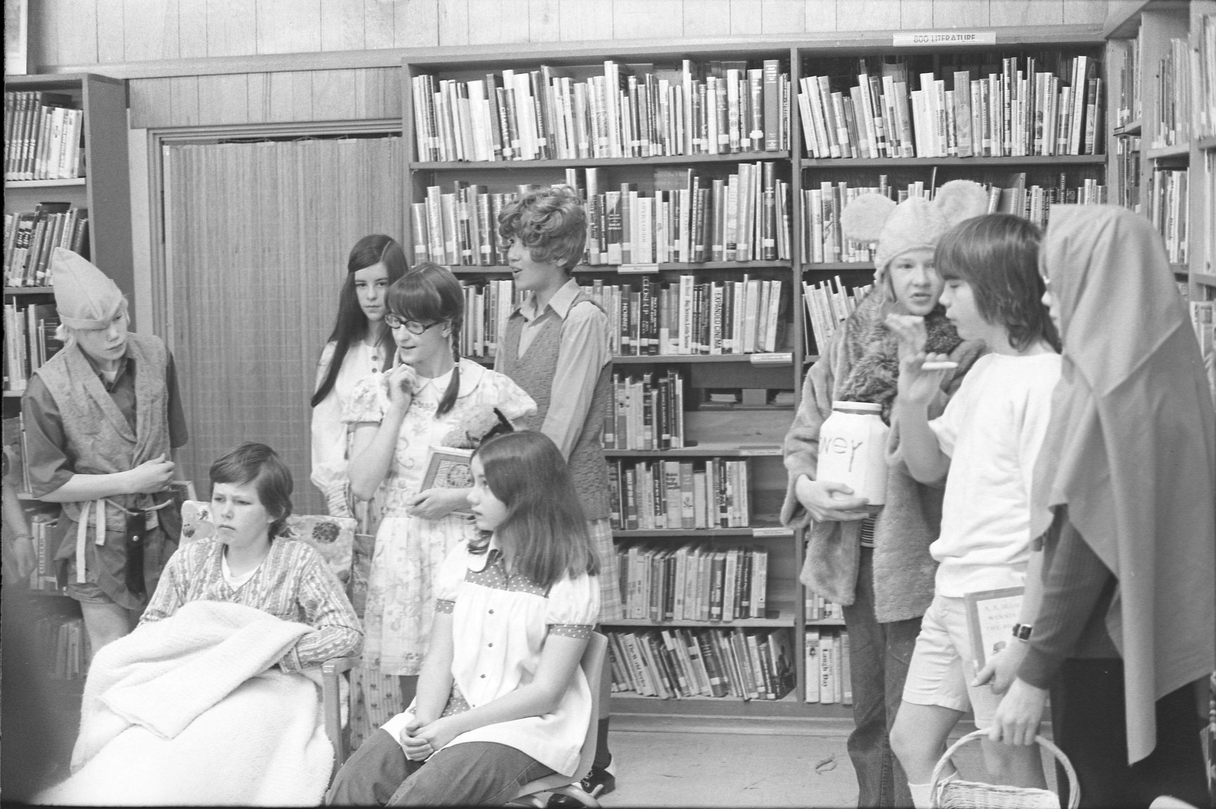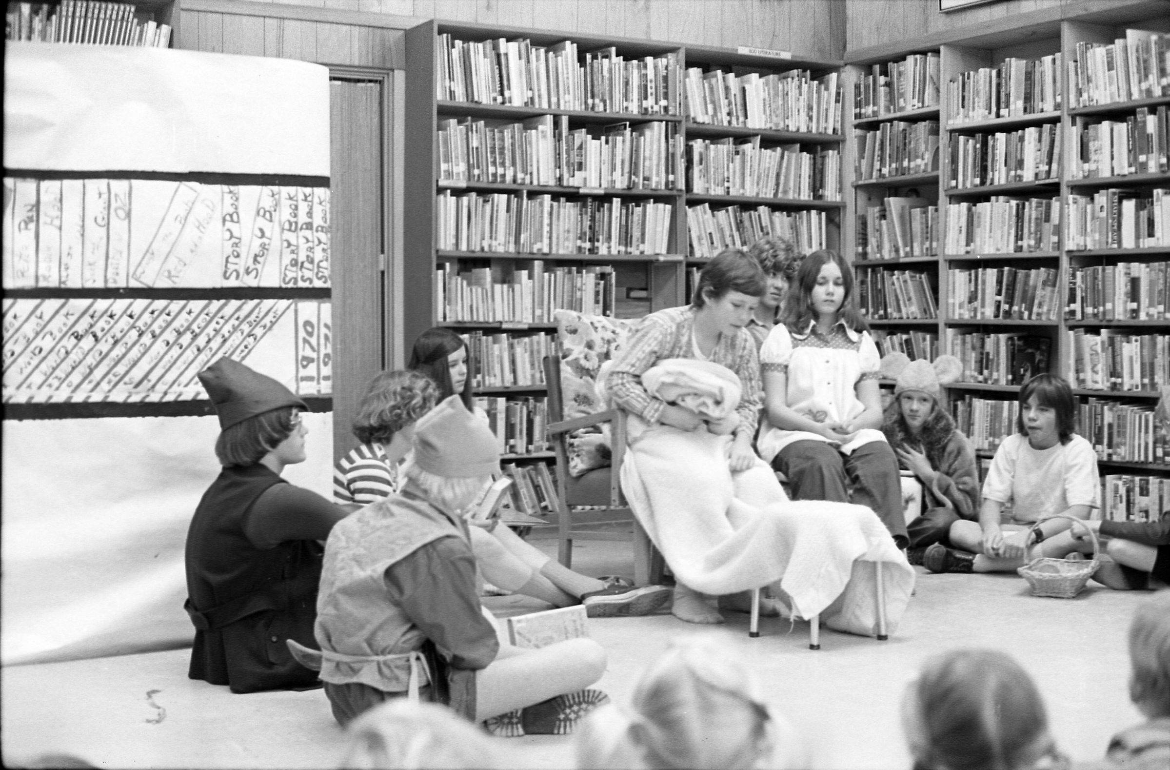 Lacey Library, 1973. Black and white negative strip of six images originally taken for the Lacey Leader newspaper. In these images we see high school students from North Thurston High School gathered around for a story time at the Lacey LIbrary which was located at the Lacey Village Shopping Center. Ken Balsley said this was a children's book reading. It appears to be two different groups of students that came out for the reading.