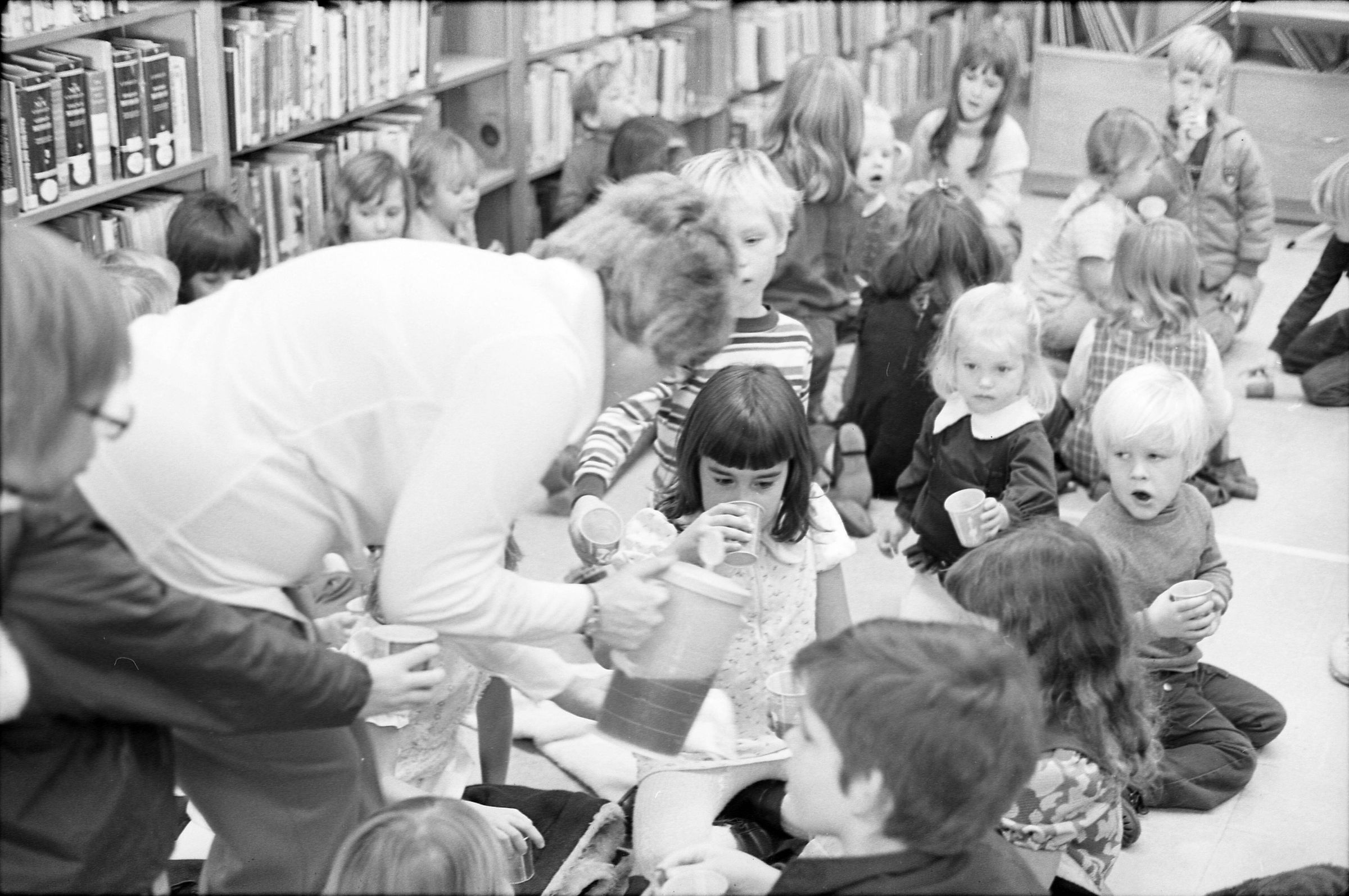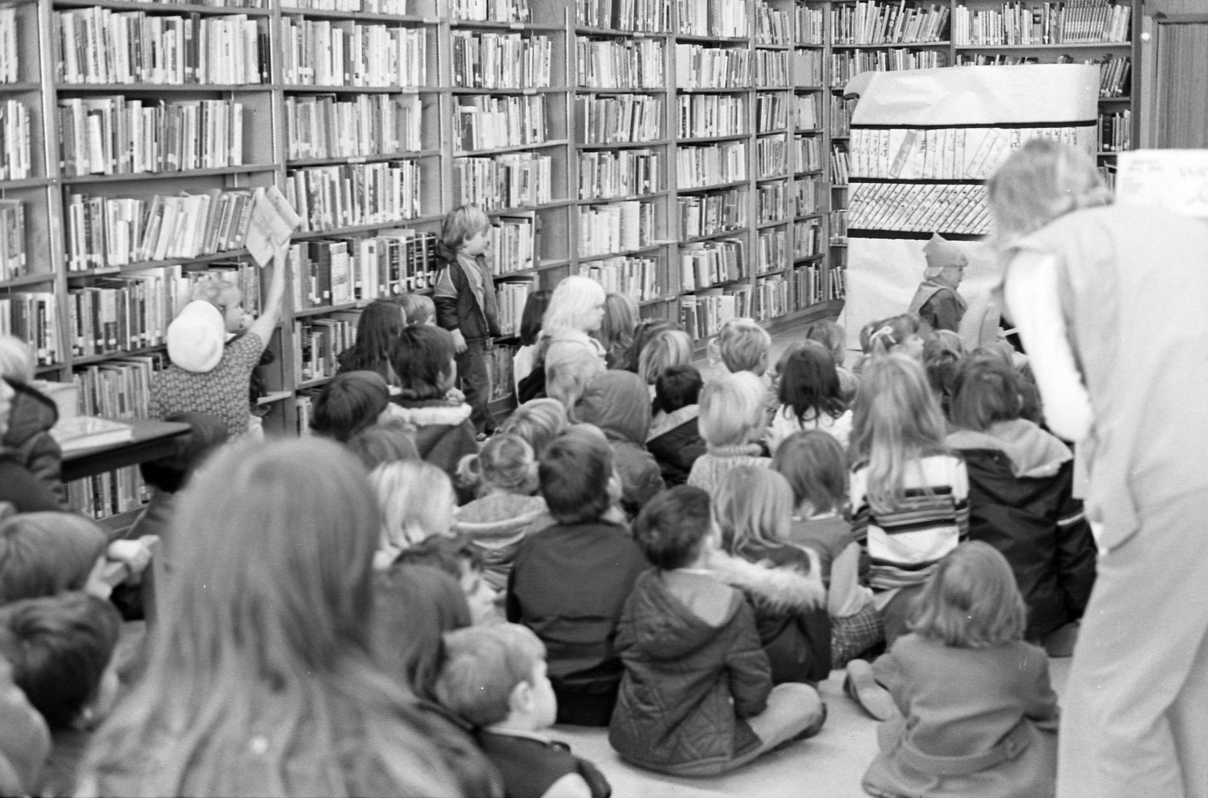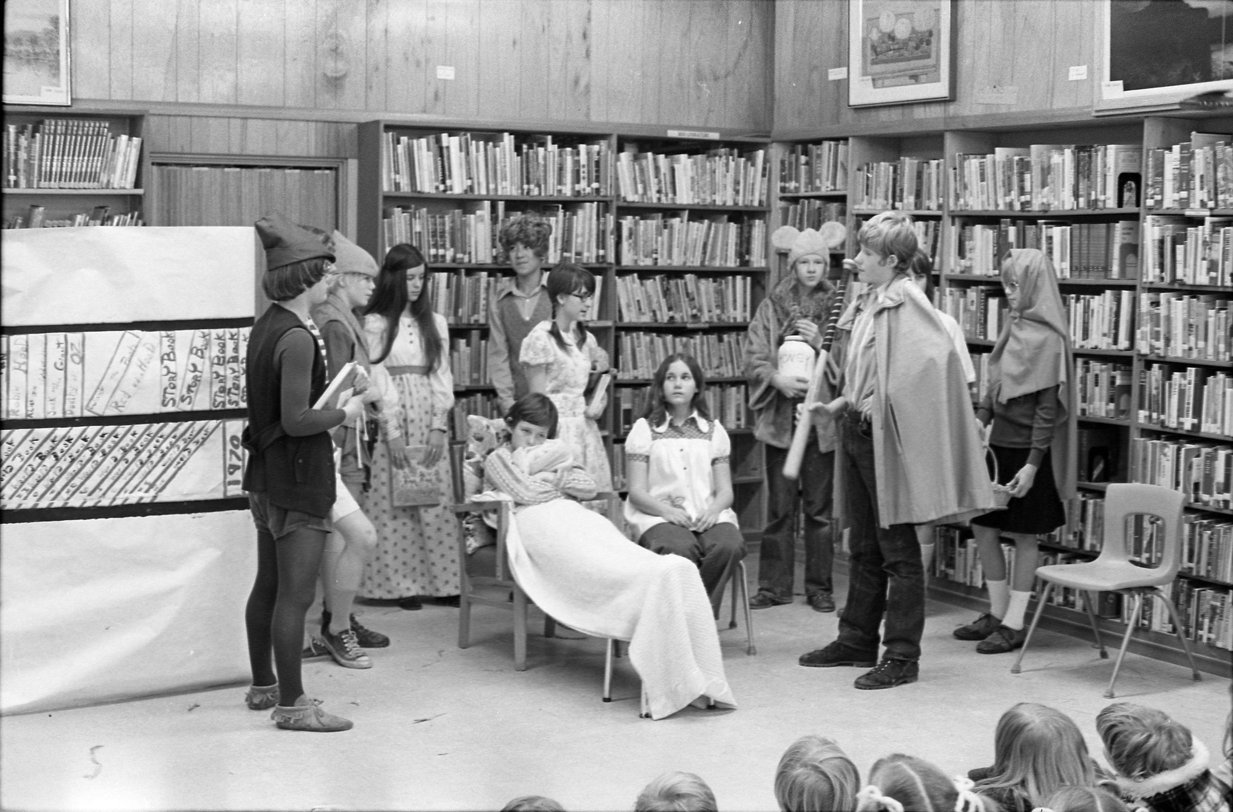 Lacey Library, 1973. Black and white negative strip of six images originally taken for the Lacey Leader newspaper. In these images we see high school students from North Thurston High School gathered around for a story time at the Lacey LIbrary which was located at the Lacey Village Shopping Center. Ken Balsley said this was a children's book reading. It appears to be two different groups of students that came out for the reading.