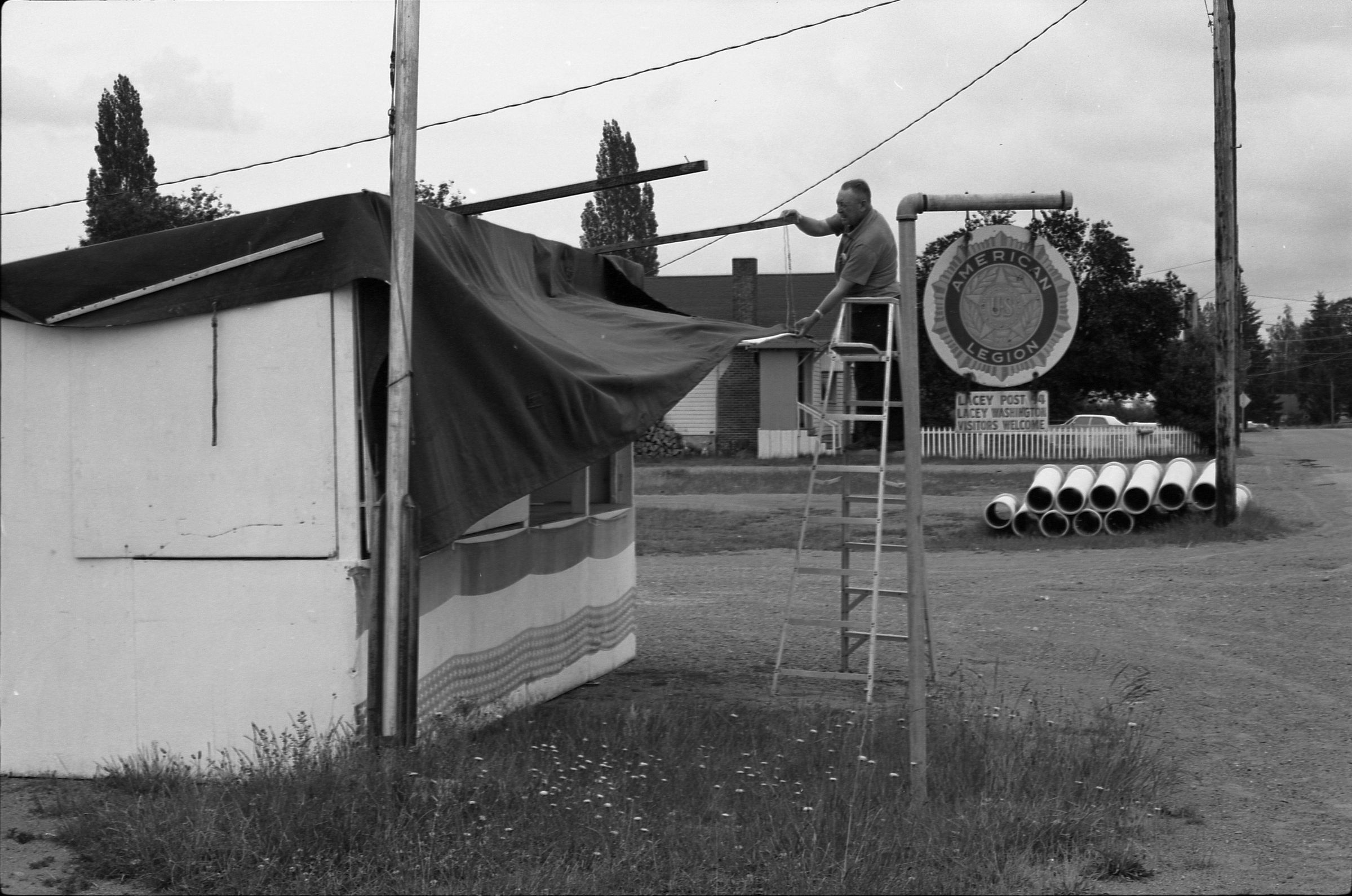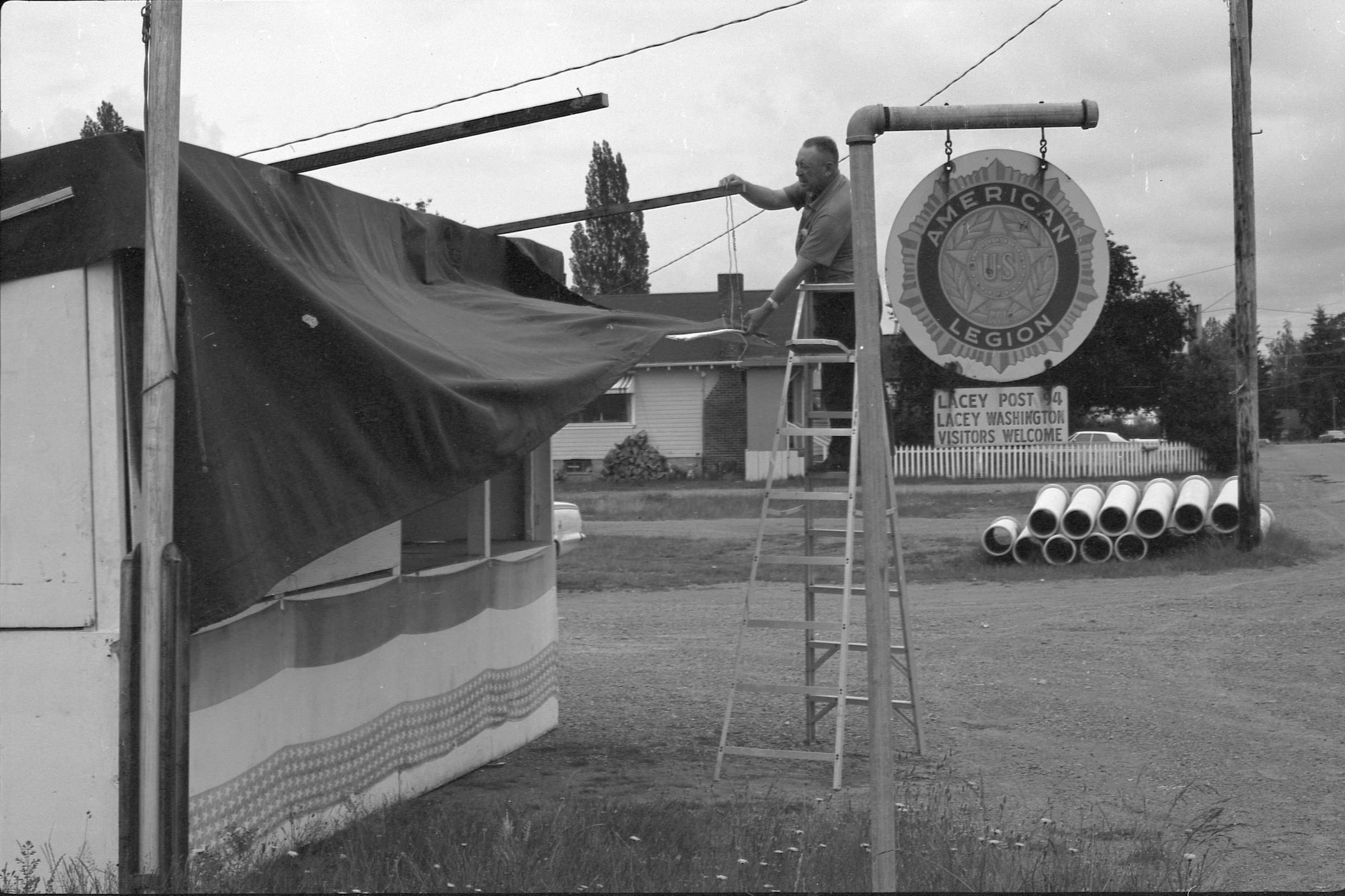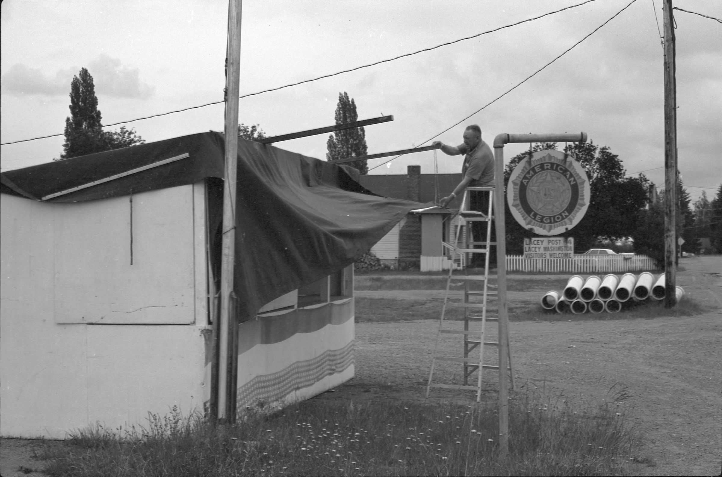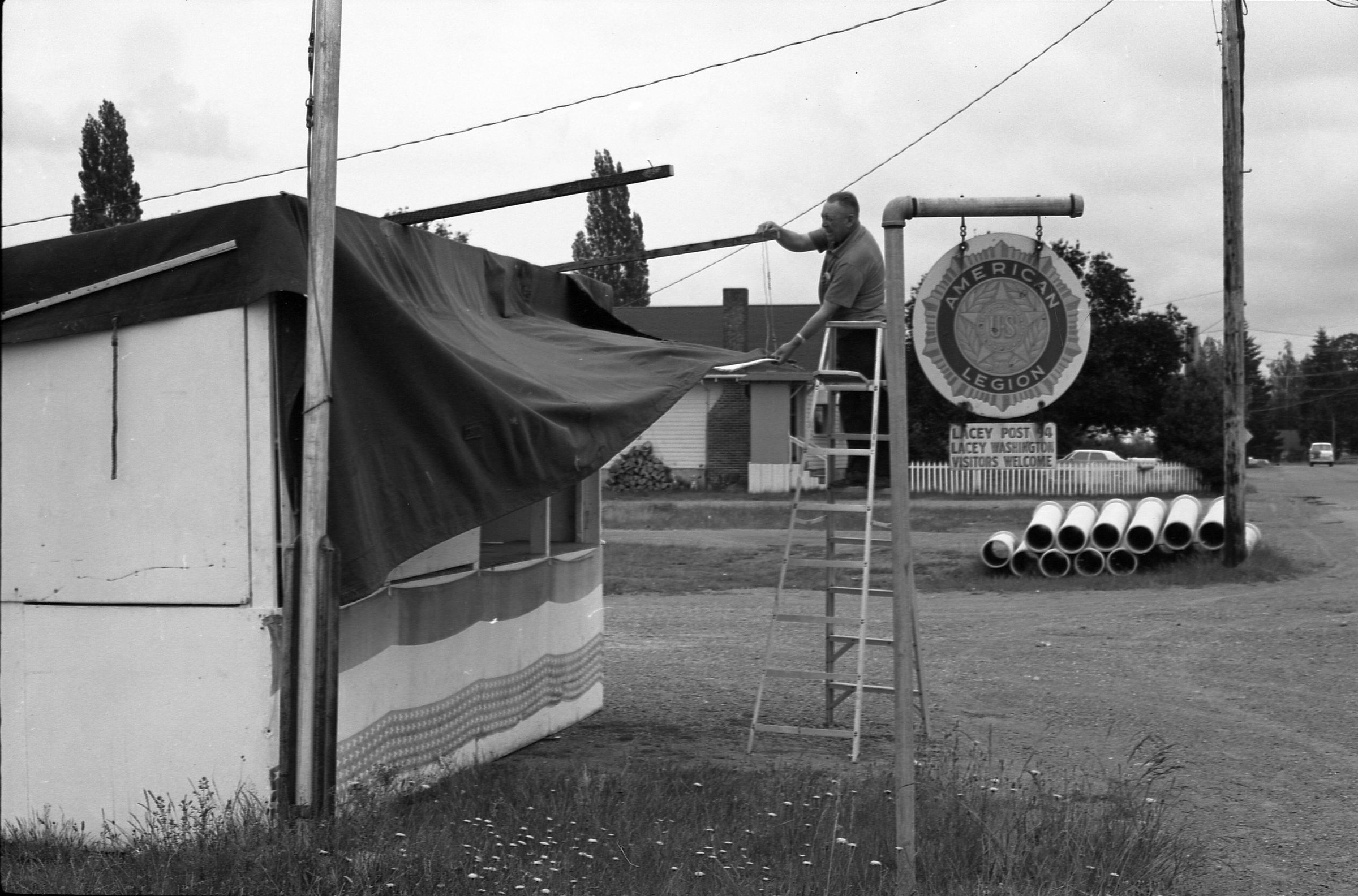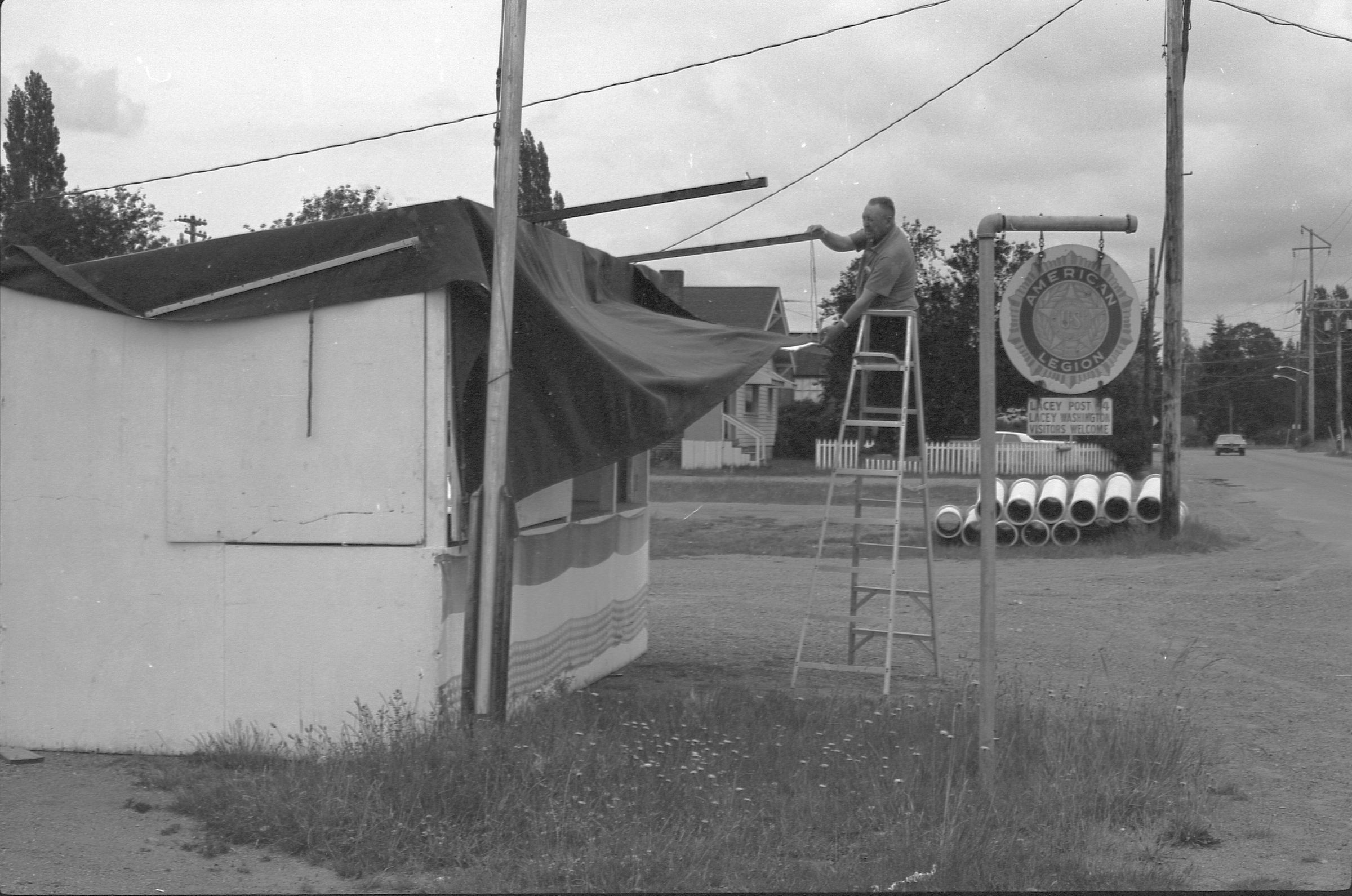 American Legion Fireworks Stand, 1973. Black and white negative strip of five frames originally created for the Lacey Leader newspaper. These frames show a man setting up an awning for a stand for fireworks. The man is standing on a ladder wearing a shirt and dark pants. He is holding the awning in his left hand and holding on to a post with his right hand. He appears to be setting up the awning. Next to him is a sign that reads "American Legion" with the American Legion logo on it.