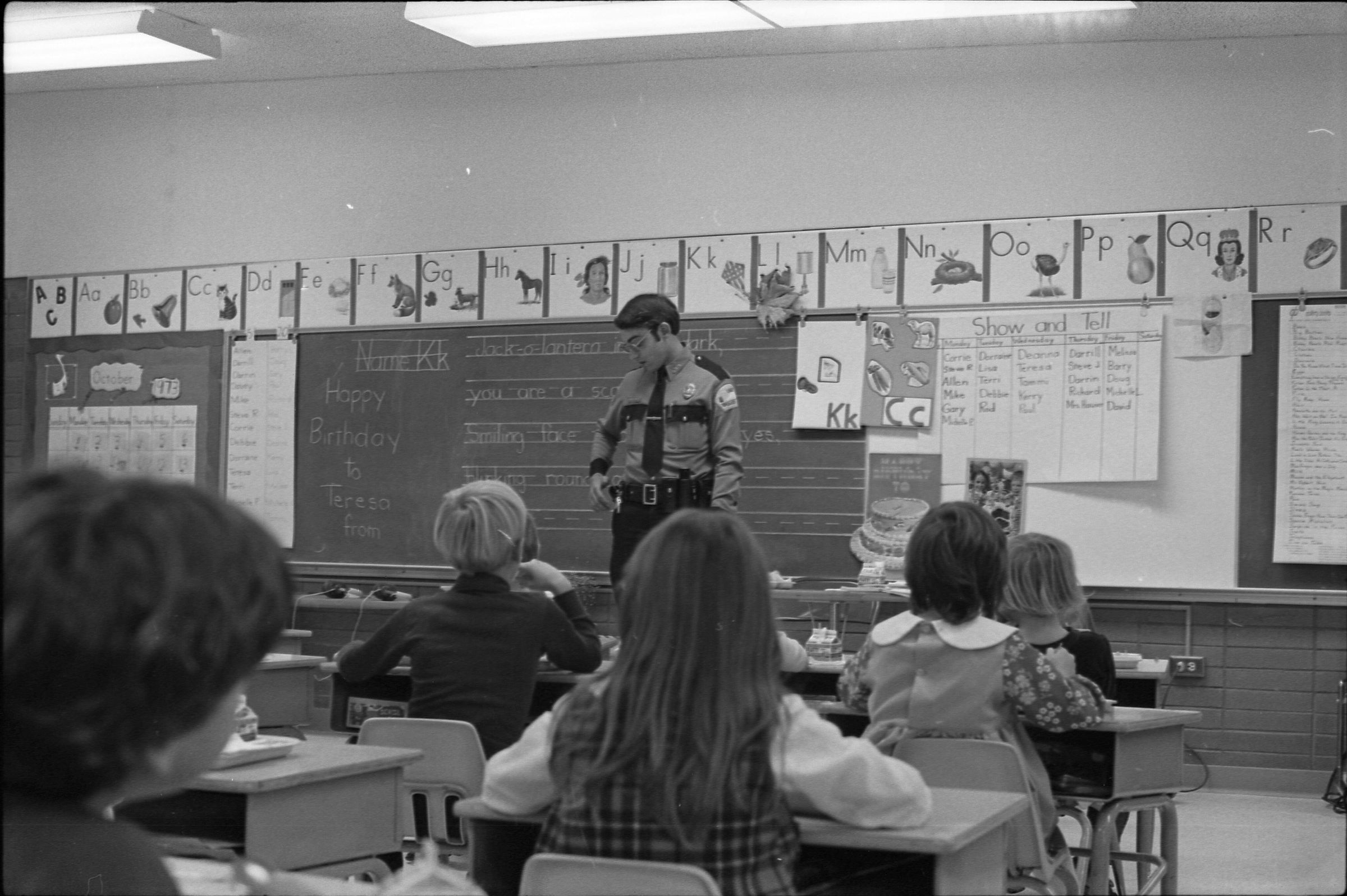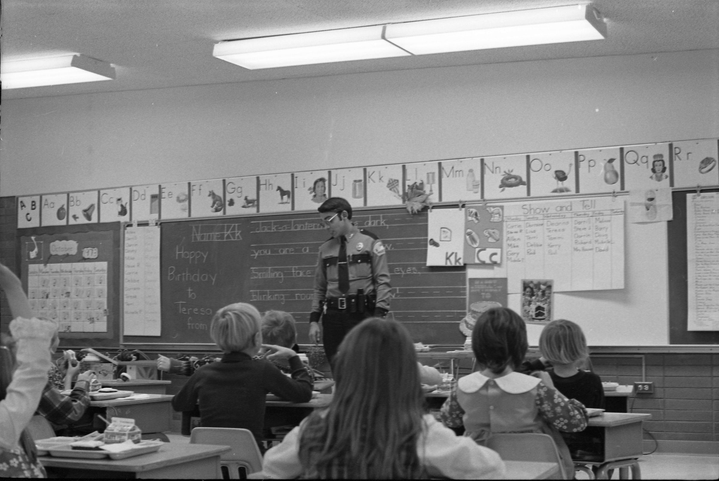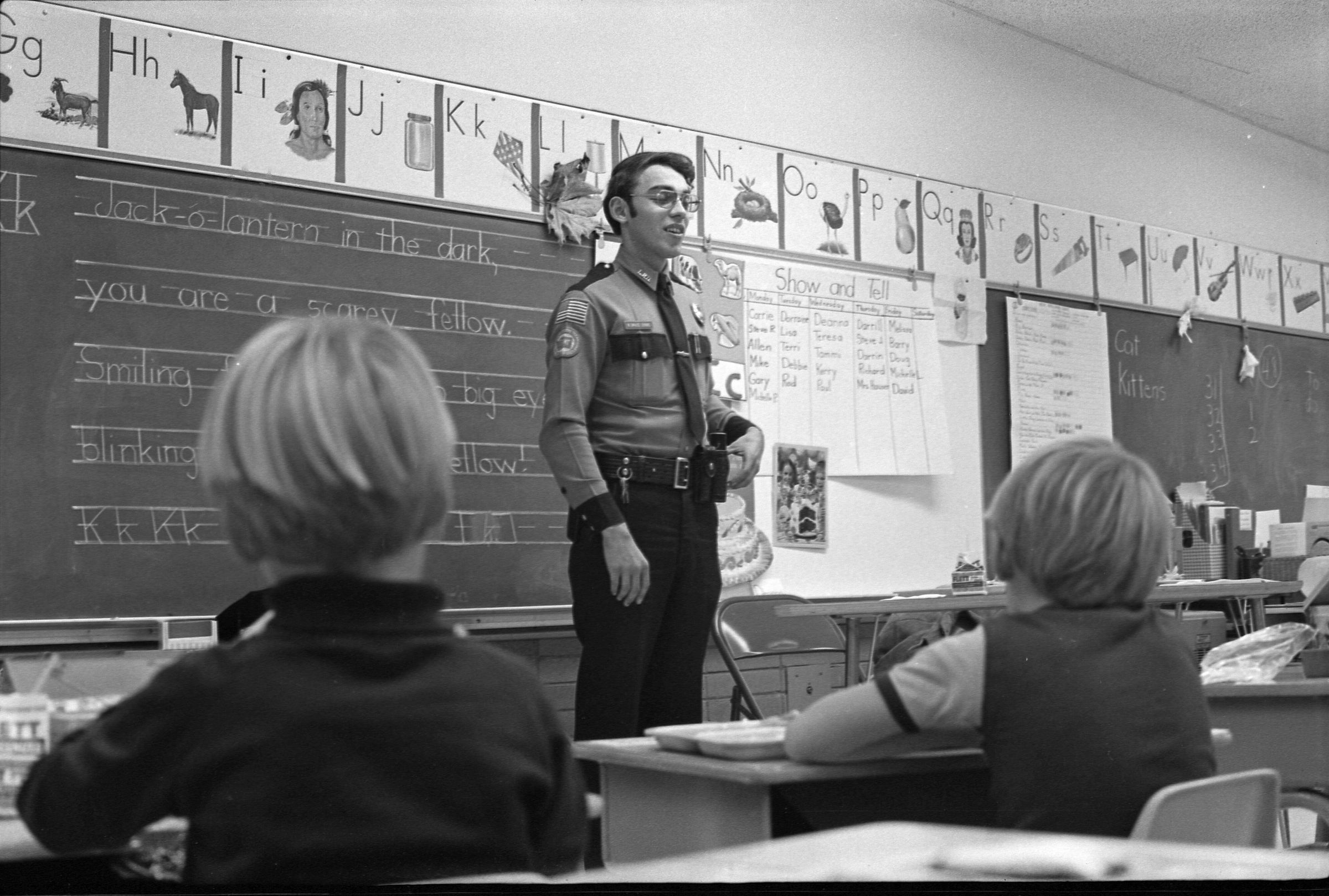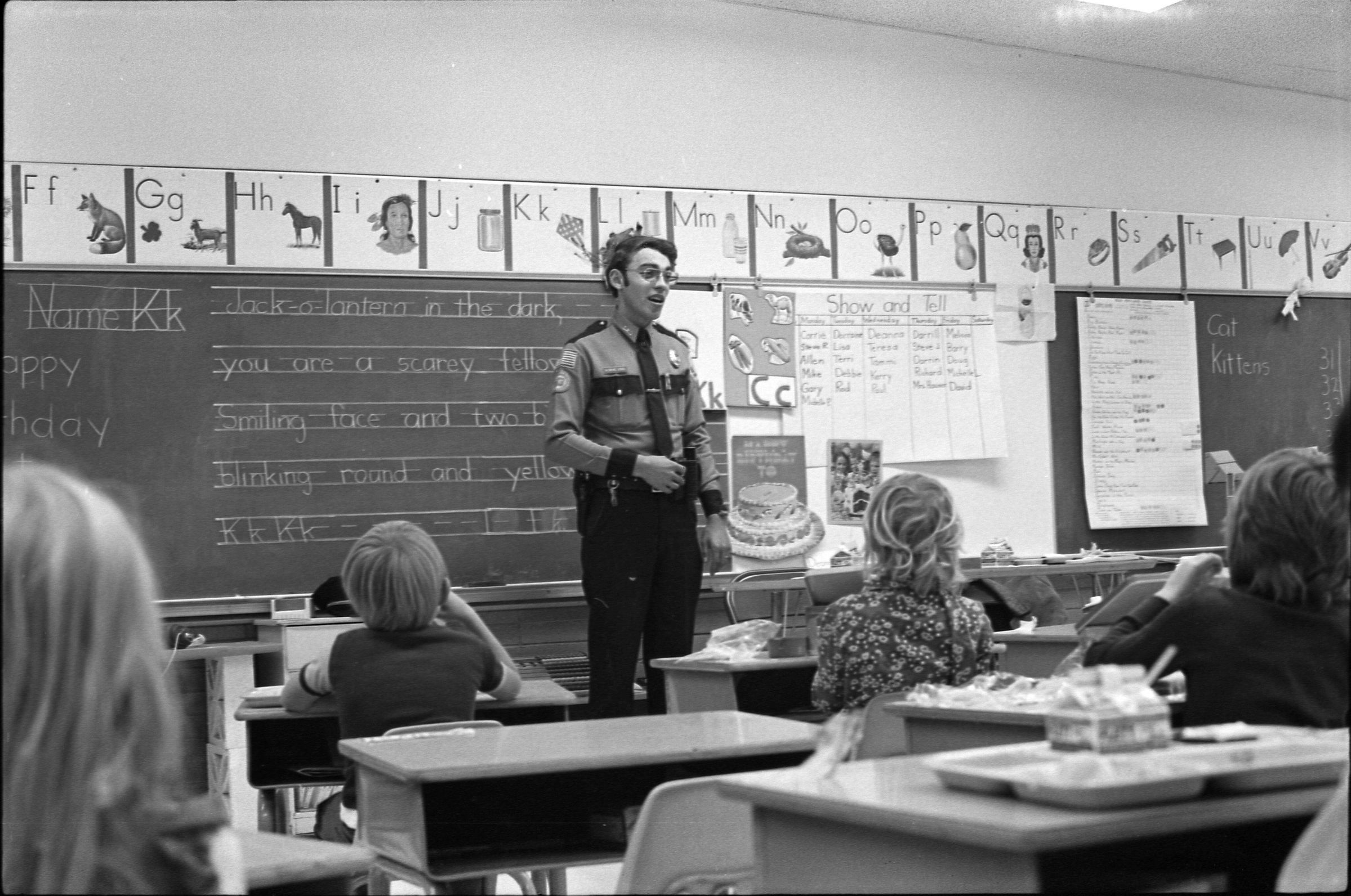 Officer Friendly, 1973. Black and white negative strip of four images originally created for the Lacey Leader newspaper. Ken Balsley says that Officer Friendly was a school resource officer. In the photographs we see the officer speaking to a young group of students in a class room. Behind him on the board you can see large samples of writing. The officer, possibly Officer Bruce Dobbs, is wearing a police uniform. He has on a tie, button up police shirt, and black pants. He is also wearing glasses. In frames 9 and 10 you are able to see six children sitting at their desks in front of him. In frames 11 and 12, you are able to see two children sitting in front of him.Made/Created
