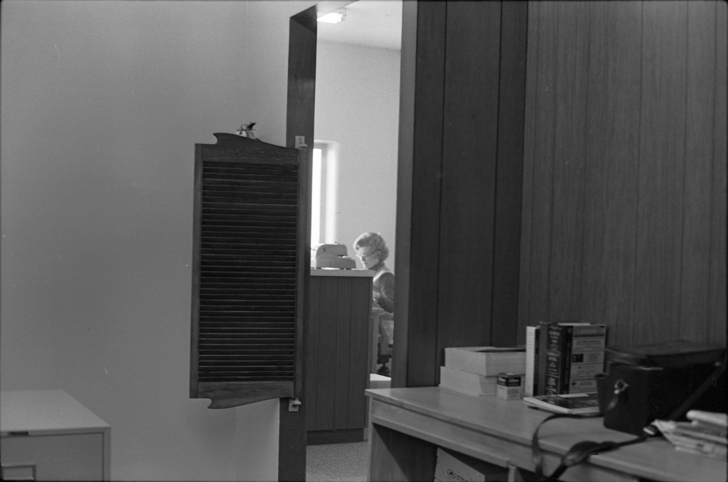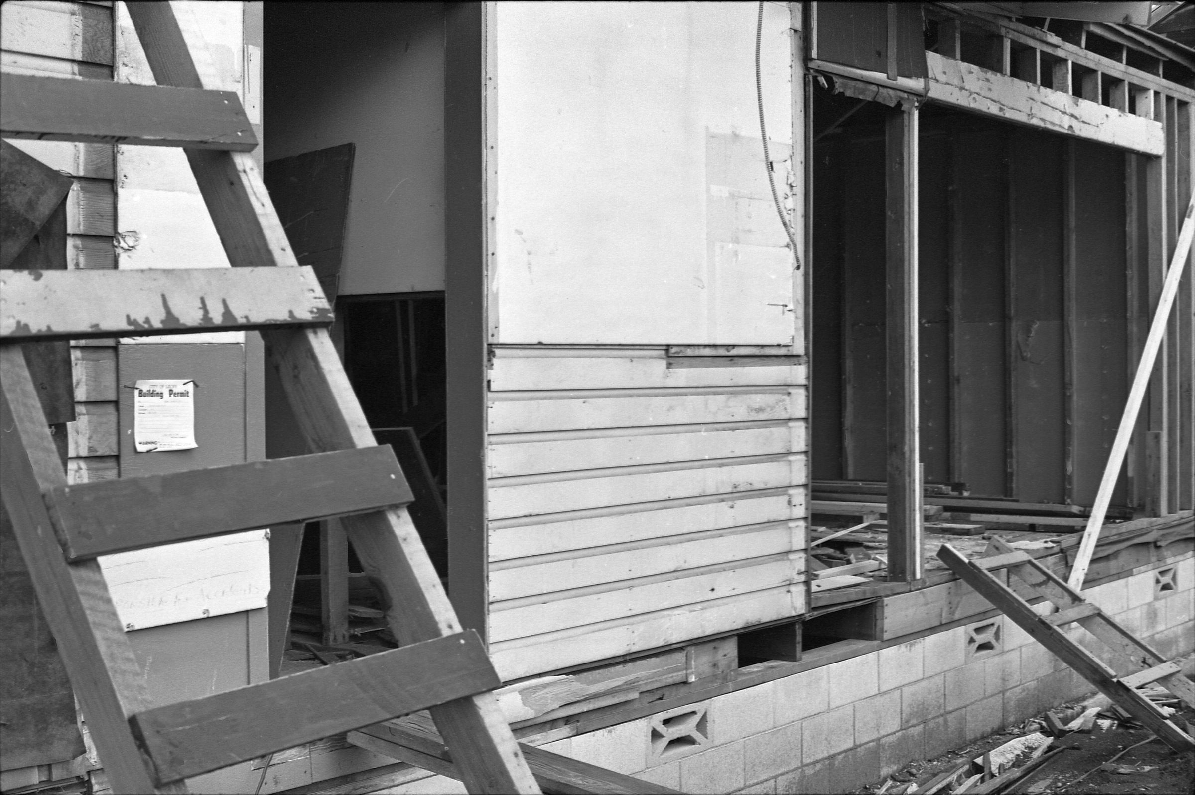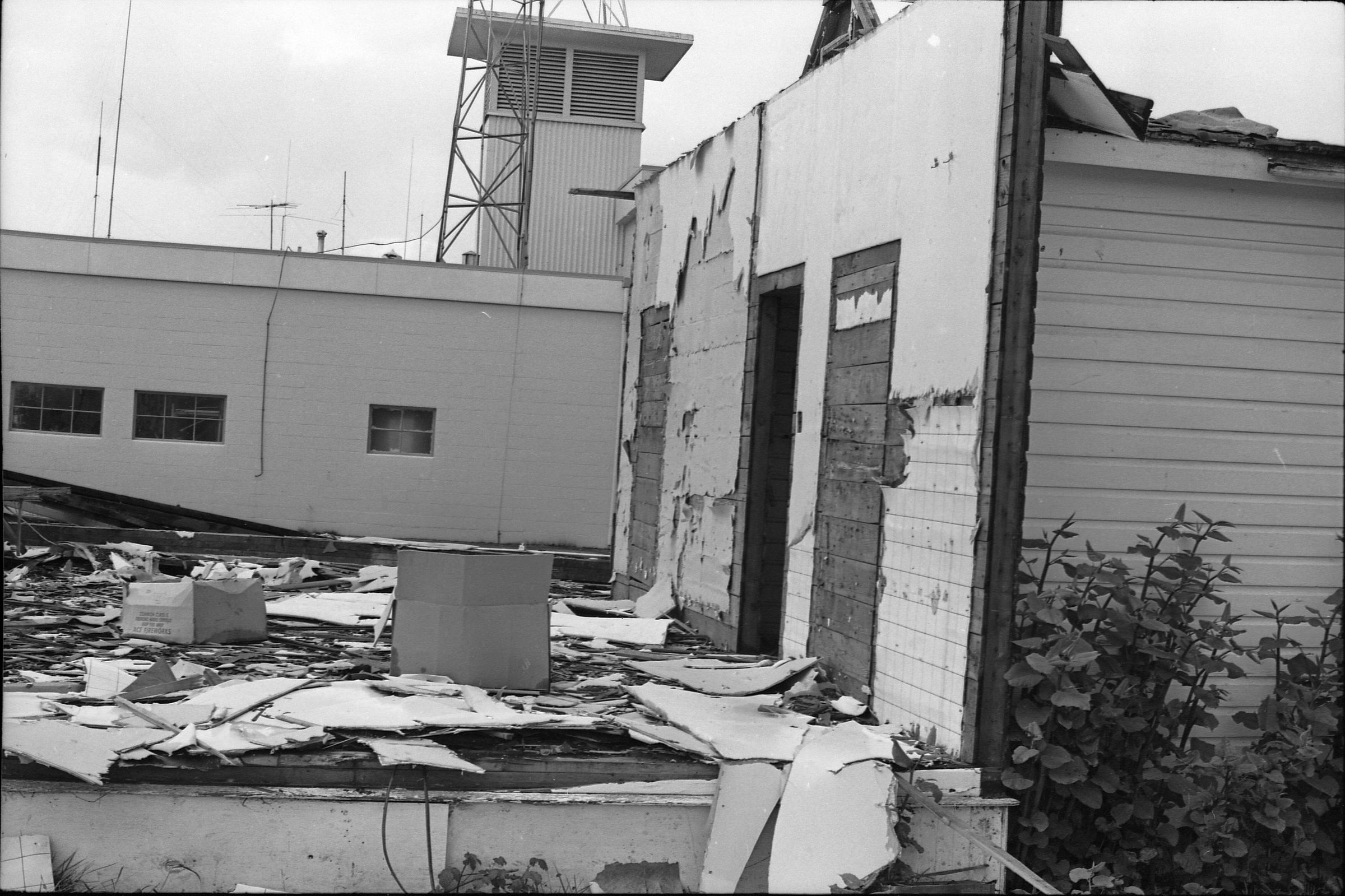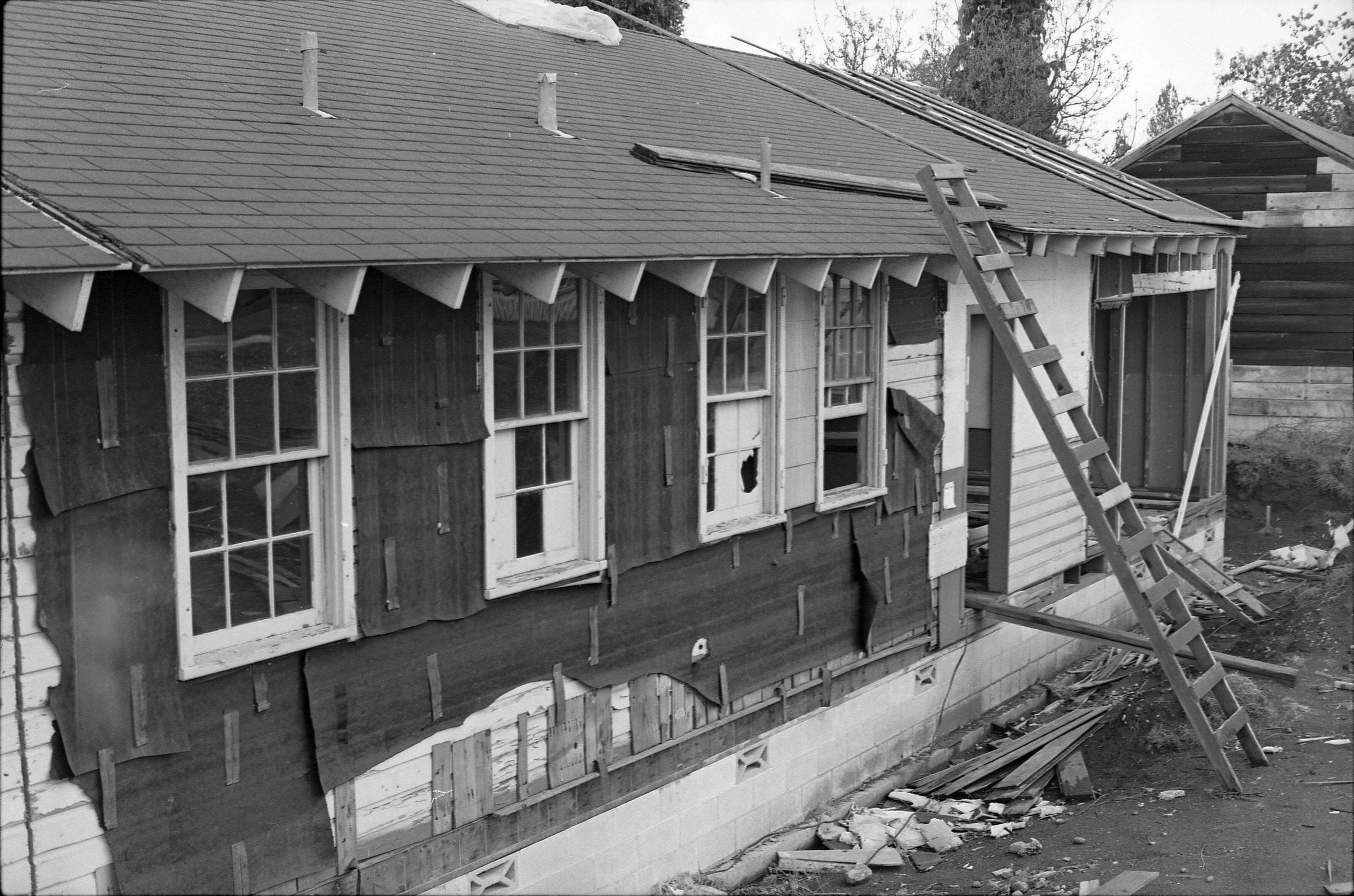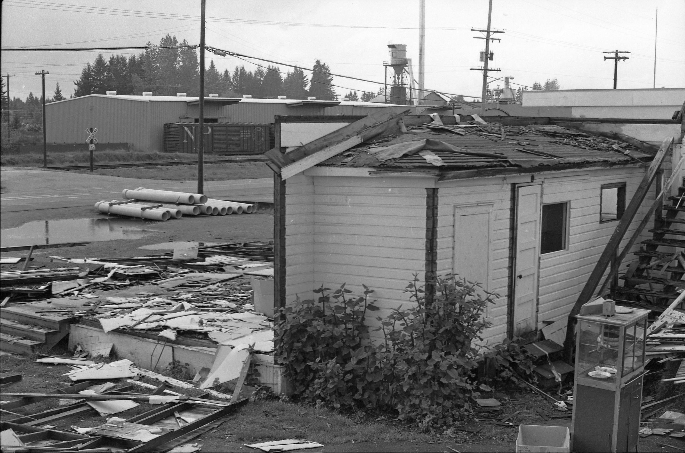 Lacey American Legion Hall Demolition, 1973. Black and white negative strip of 14 images (two strips of five frames and one strip of four frames) originally created for the Lacey Leader newspaper. In the photos we see the partially-demolished Lacey American Legion Hall.