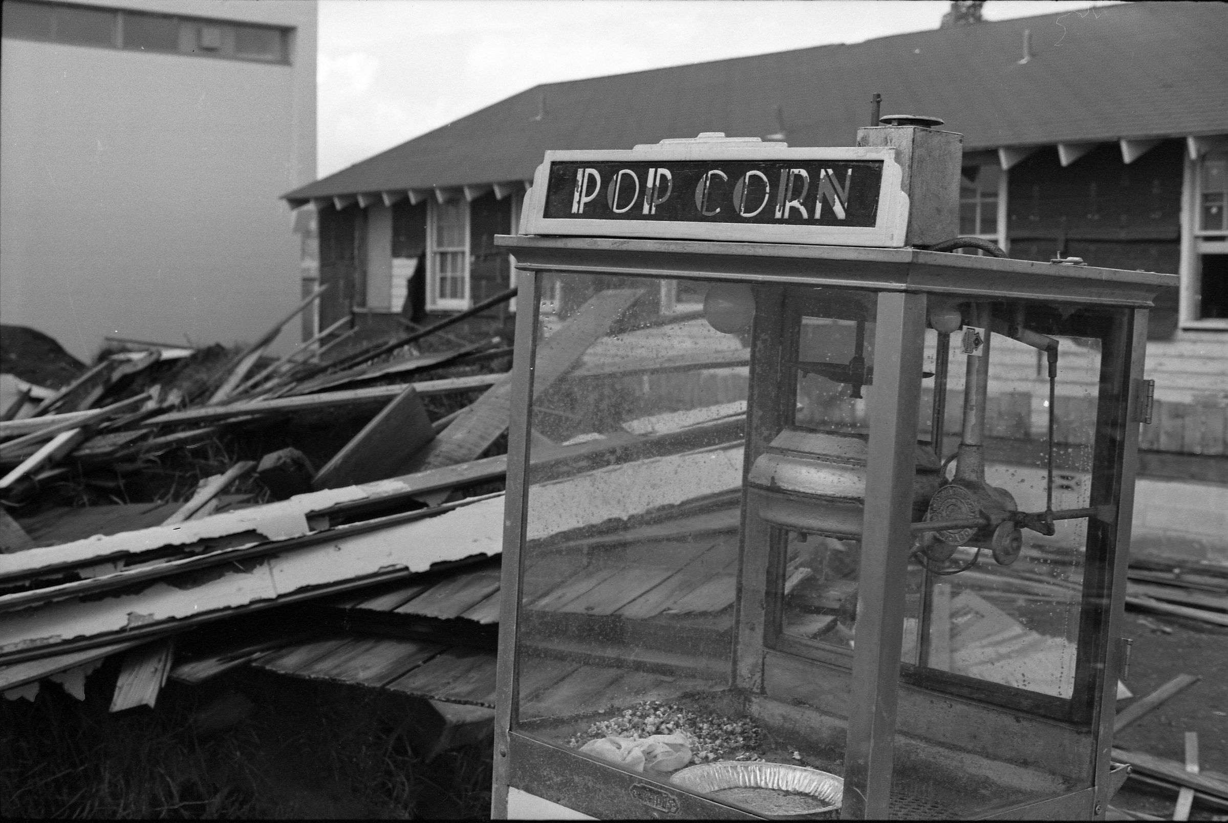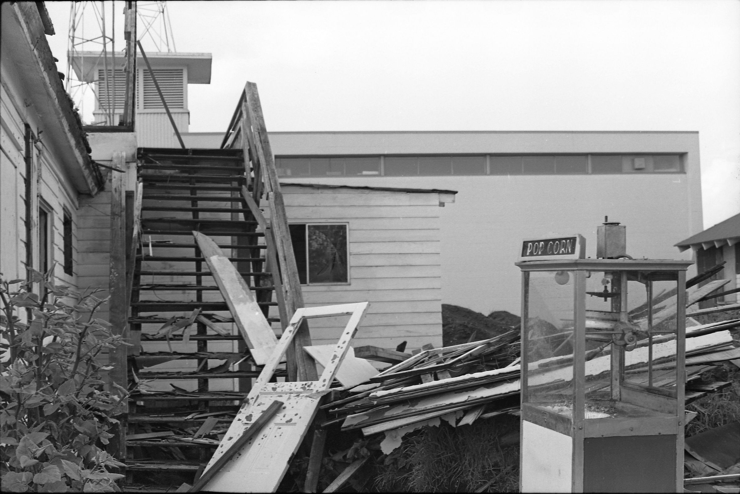 Frame 5 appears to be of a counter inside the building. On the counter appear to be files and a box. Frame 6 shows the outside construction of the building. The back frame of the building is visible and the area in front of the frame has debris on the floor. Frame 7 is of this same scene but taken from the side so a large amount of debris on the floor of the building and ground surrounding it is visible. Frame 8 shows debris around a staircase. A popcorn machine is visible next to the stairs. The stairs have a rail on the right side of them. On the strip containing frames 9-13: Frame 9 shows the popcorn machine with large amounts of debris on the floor behind it. Frame 10 shows the staircase from a different angle. There is debris on either side of it and the popcorn machine is seen on the right of it. The stairs appear to lead to the top of a building. Frame 11 shows the outside of a building. Debris is on the ground in front of it and a ladder is leaning up against the side of the building, leading to the roof. Several windows are visible on the side and they all have broken panes. Frame 12 shows a small building with debris in front of it and on top of it. The building is to the left of the staircase and the popcorn machine is seen to the right. Frame 13 shows the same side of the building as frame 11. A ladder is leaning against the side, leading to the roof. Debris is scattered on the ground in front of the building. On the strip containing frames 14-18: Frame 14 shows the side of a building that is attached to a floor. The other sides of the building appear to be the debris that is on the floor of the building. Frame 15 shows the staircase with a window behind it that has a ladder leading in to it. Frame 16 shows a hallway with open frames through the doorways. The walls of the building are no longer in tact. Frame 17 shows another view of the staircase with a large amount of wooden debris on the ground around it. Frame 18 shows the side of the building from frames 11 and 13. Several portions of the windows are missing. There is a ladder leading on to the roof of the building. Debris is laying on the ground around the ladder.Made/Created