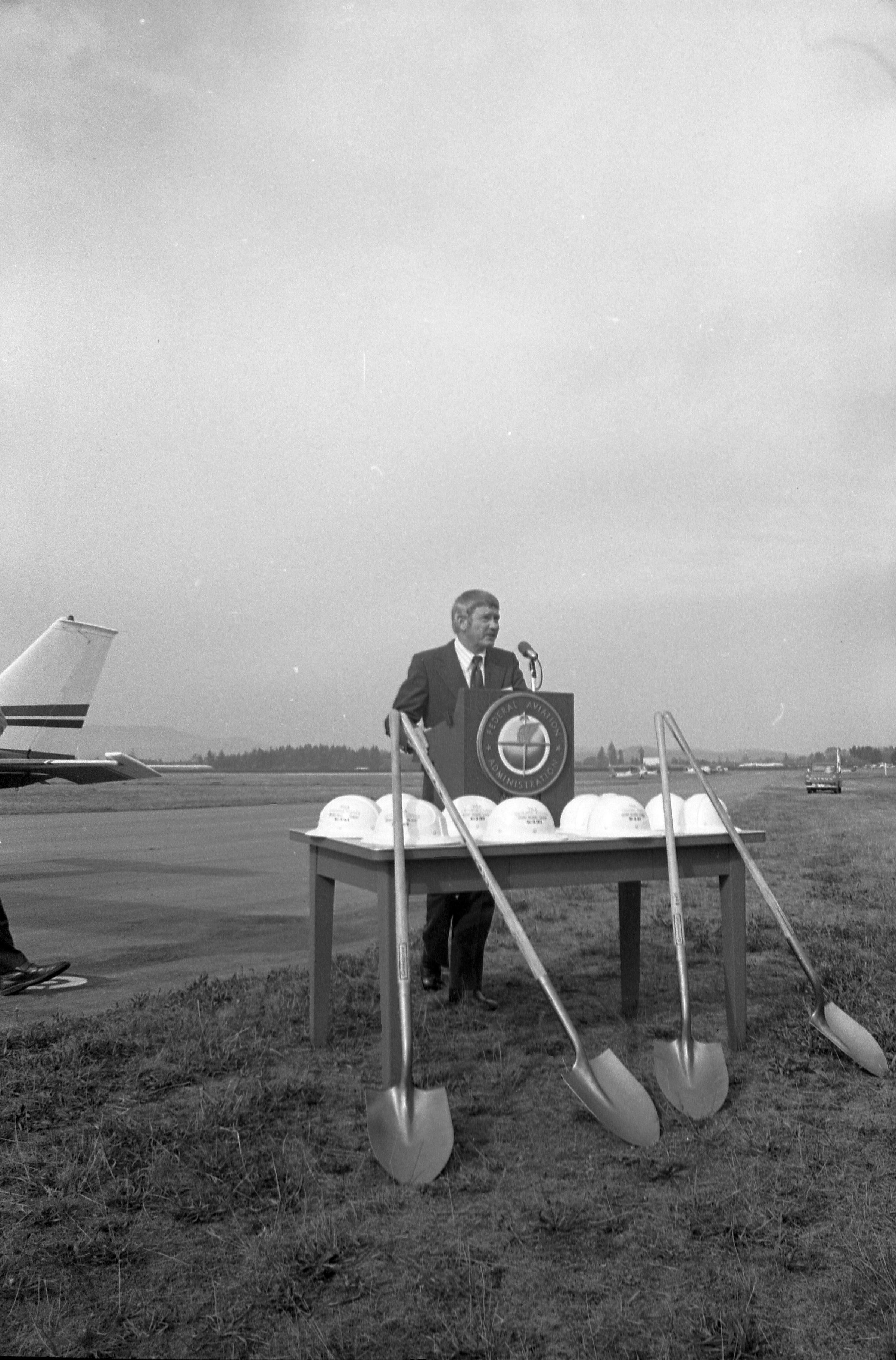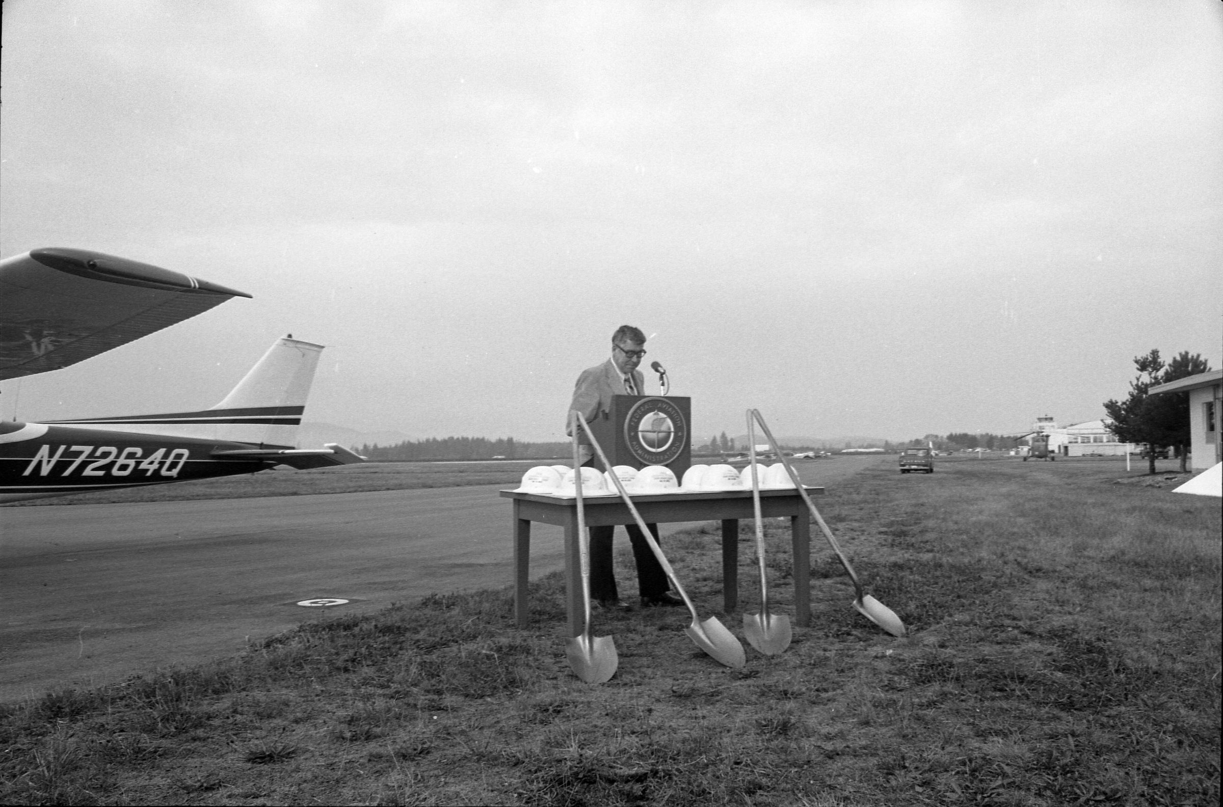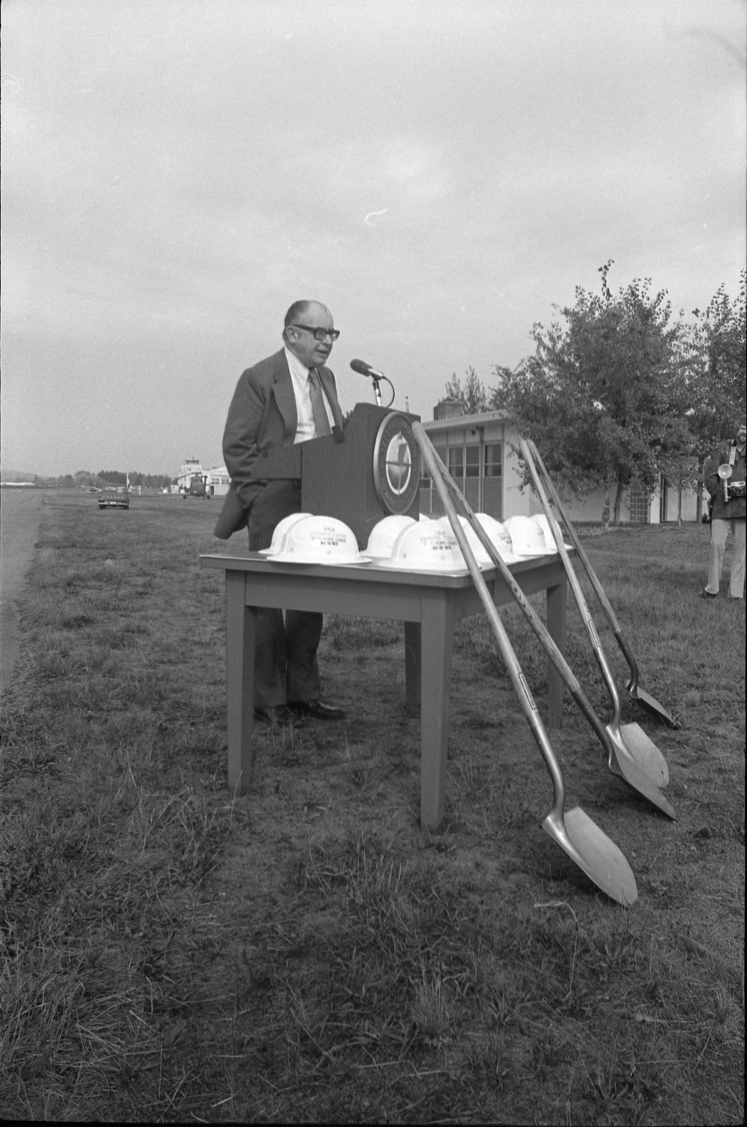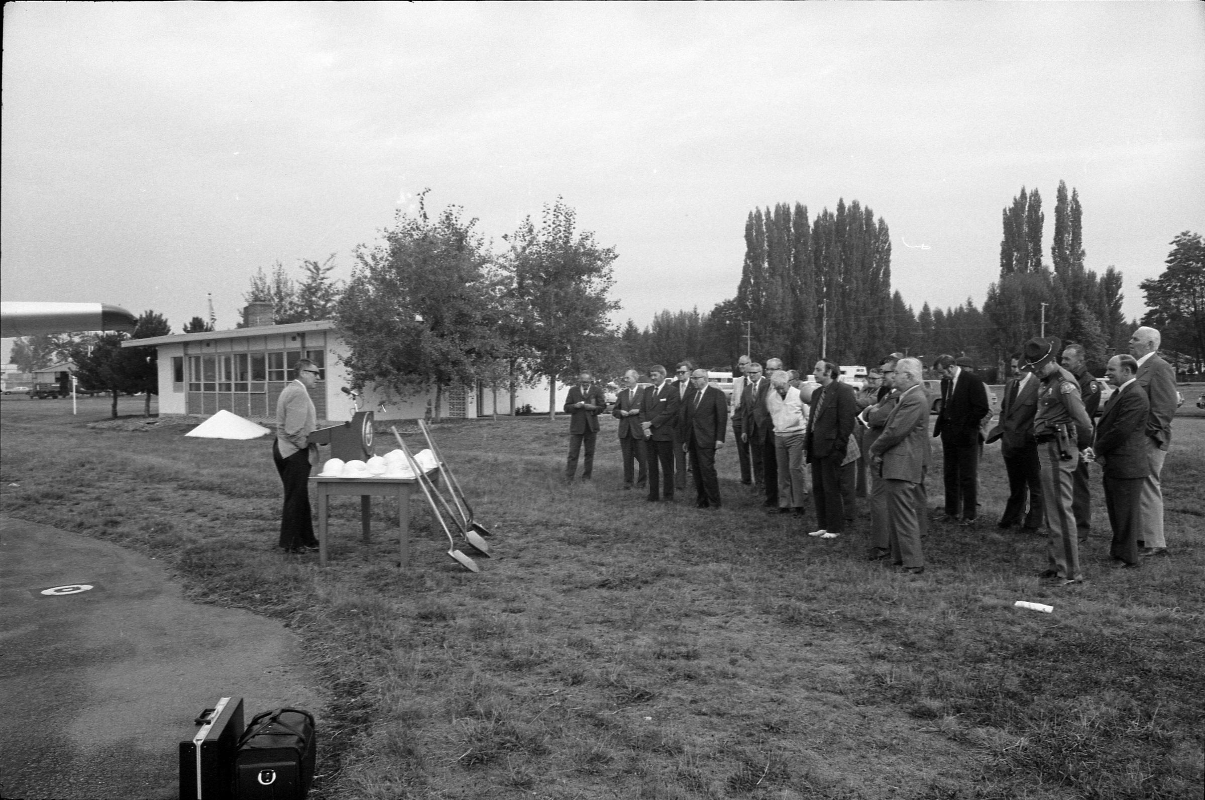 Olympia Airport Dedication, 1973. Black and white negative strips of 19 images (three strips of five, and one strip of four) originally created for the Lacey Leader newspaper. These images are of the Olympia Airport dedication in October of 1973.Made/Created