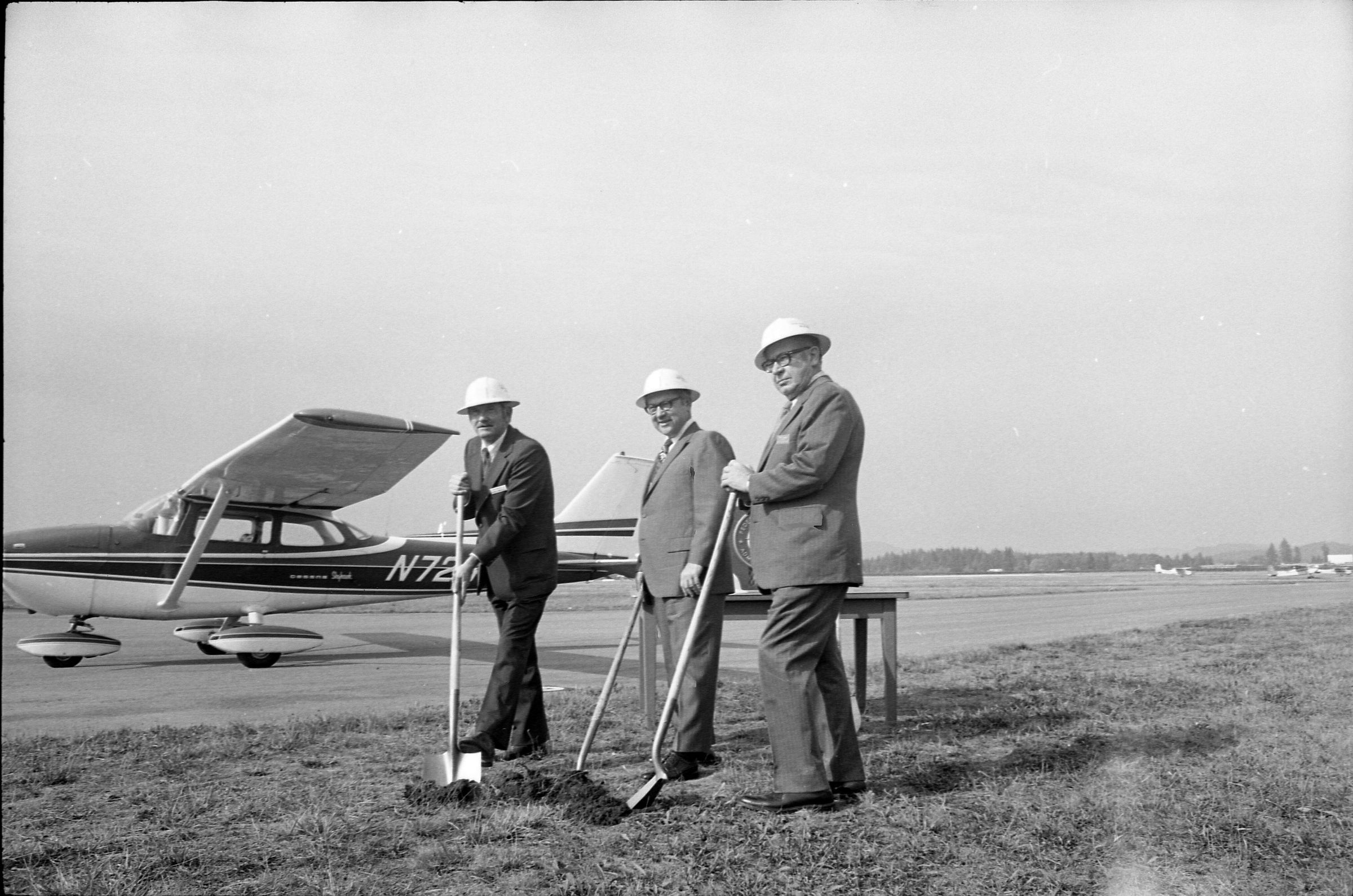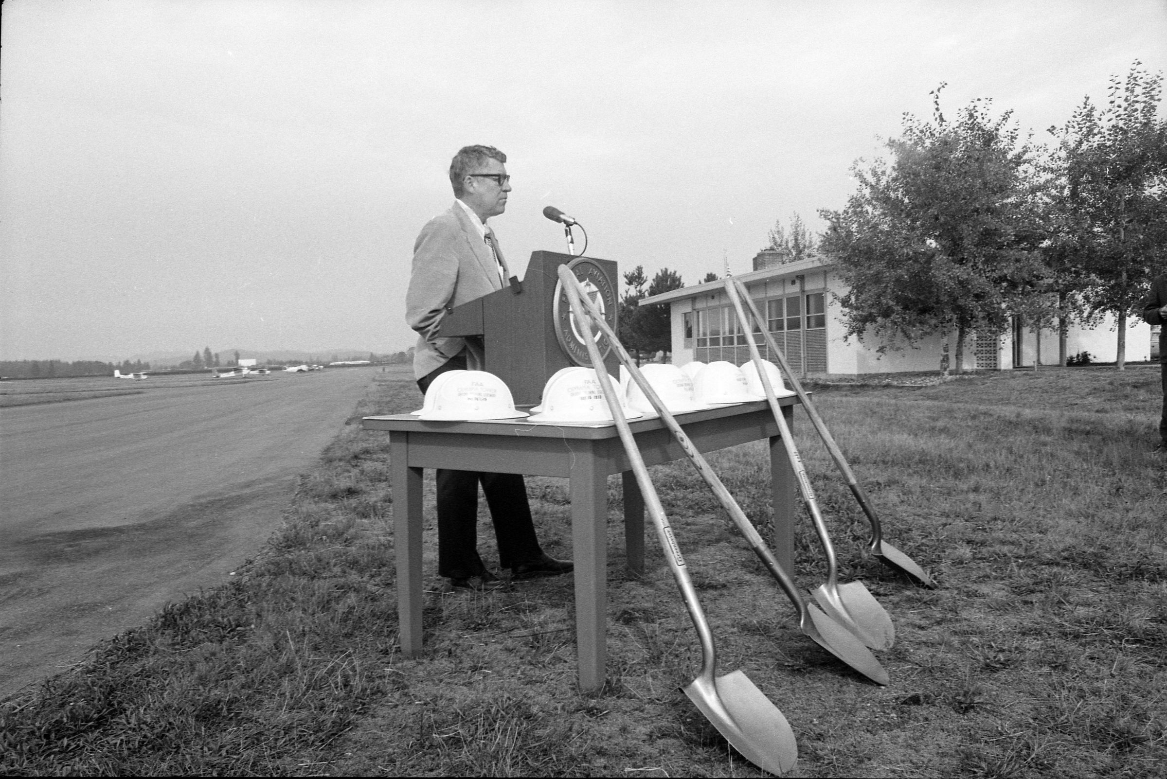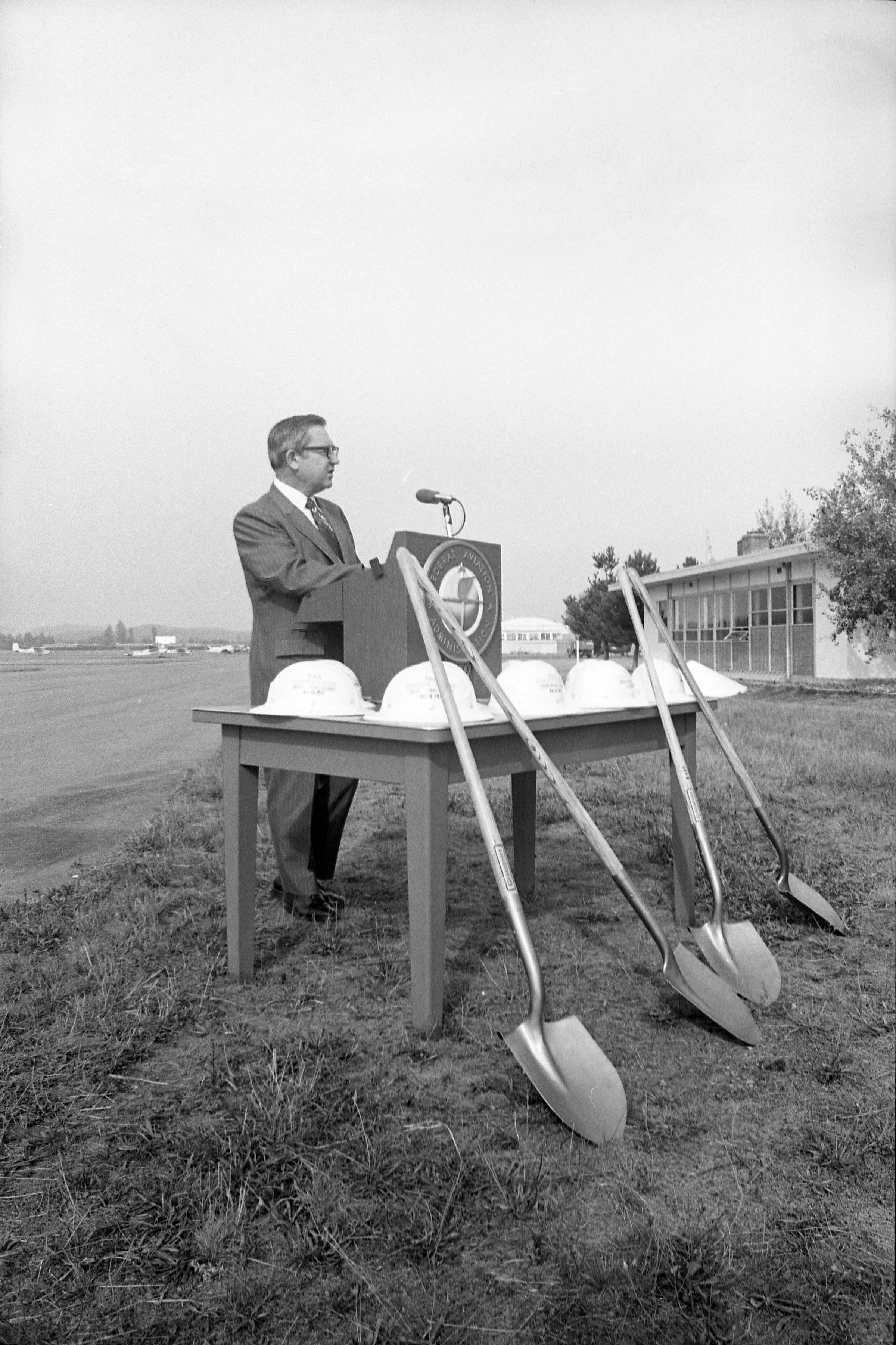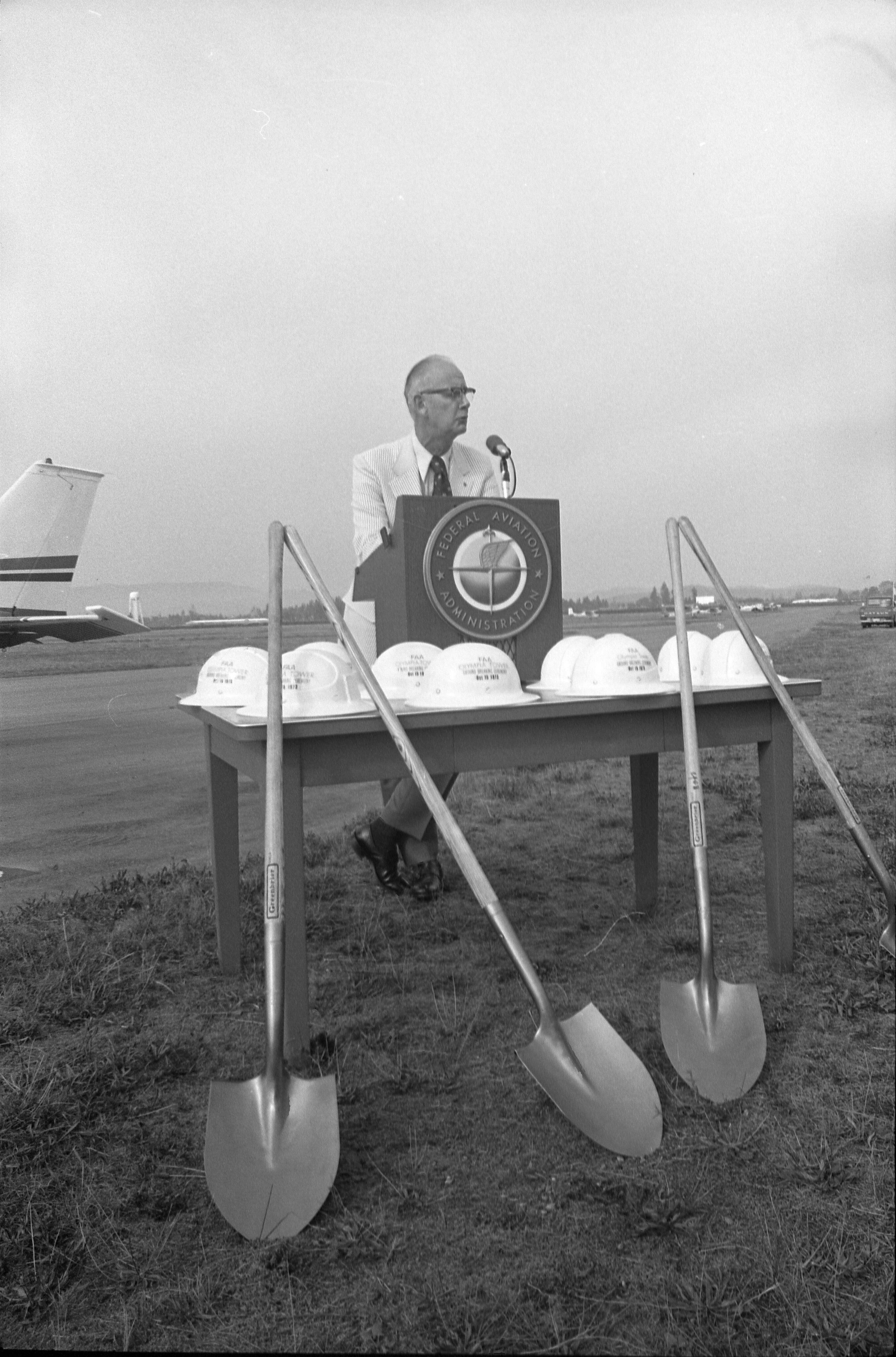 Olympia Airport Dedication, 1973. Black and white negative strips of 19 images (three strips of five, and one strip of four) originally created for the Lacey Leader newspaper. These images are of the Olympia Airport dedication in October of 1973.Made/Created