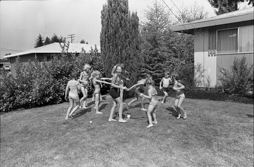 Fun, Sun, Water, 1977. Black and white negative strip of 21 images (one strip of six, and three strips of five) originally created for the Lacey Leader newspaper. These images were created using two separate film rolls, so two of these images have the same physical number. For the purposes of this descroiption, these strips will be grouped according to the film roll from which they originally came. Each group will be assigned a lower-case letter to go along with the physical numbers on the strips (ex: 1a, 2a, 3a, 1b, 2b, 3b, etc.) to help differentiate between images.