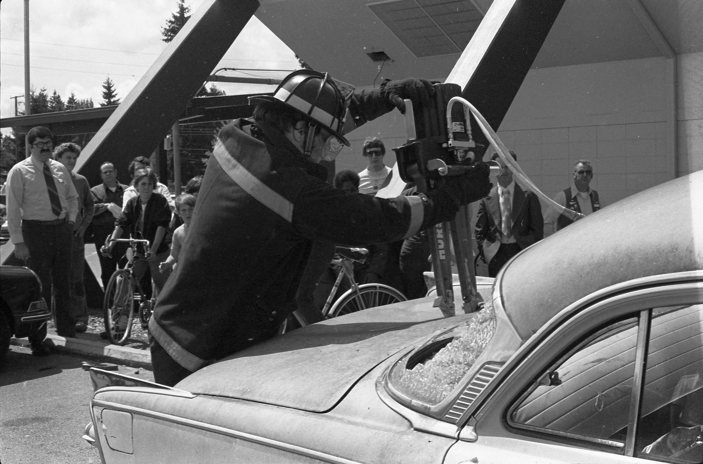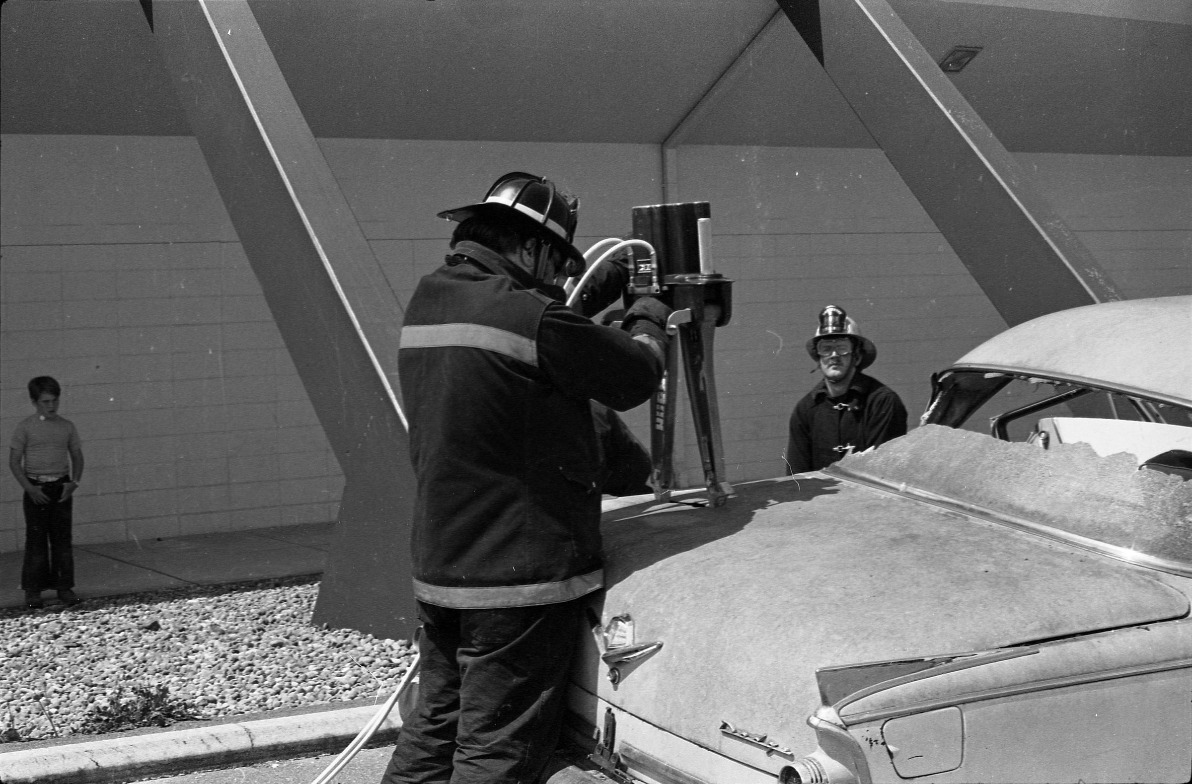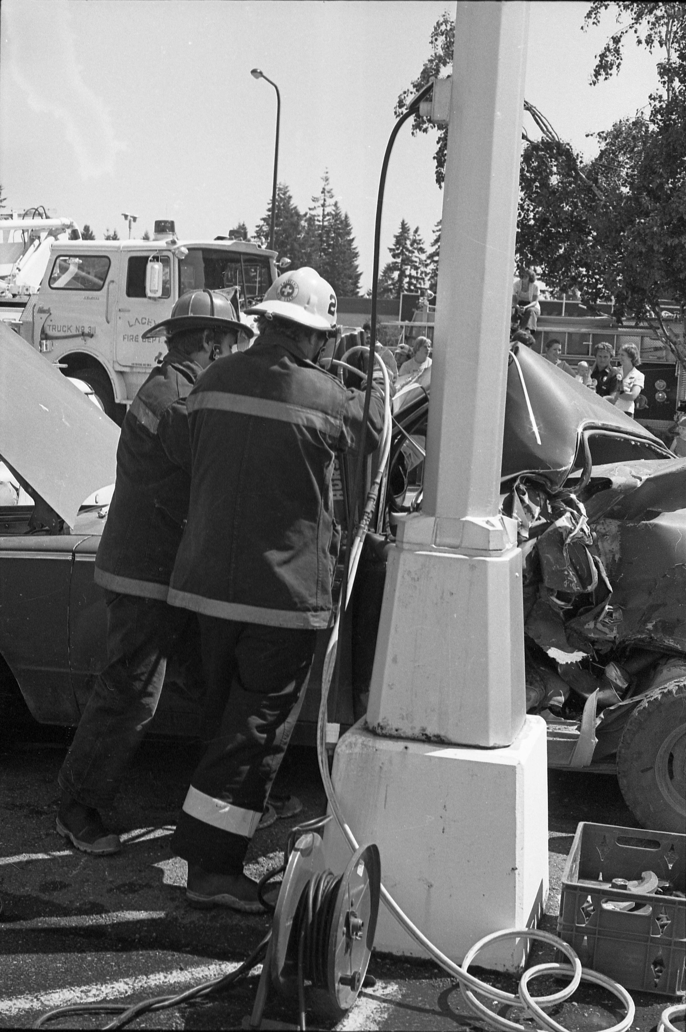 Fire Fighters in Action, 1977. Black and white negative strips of 7 images (one strip of five frames, and one strip of two frames) originally created for the Lacey Leader newspaper. In these photographs we see fire fighters giving a demonstration of things they do on the job. In frame 23 there are two fire fighters with their back to the camera. They are in a uniform and have a helmet on. They are standing in front of a vehicle that appears to have been crushed. In frame 24 we see someone leaning into the front passenger door of a car. The person appears to be a fire fighter and is reaching for someone in the drivers seat. On the strip containing frames 1-3, and 43 and 44: Frame 43 shows two people seated. The one on the left is a woman with a blood pressure cuff and stethoscope around her neck, the other end of the stethoscope is on a man's arm.. She is wearing glasses, and pants with a matching top and has her legs crossed. There is a man seated across from her wearing a striped shirt. Behind the man is a large window. Behind her is floral wall paper. Frame 44 shows a fire fighter standing in front of a car. He appears to operating a tool that opened the car's doors as the doors on the vehicle have been removed. The fire fighter is wearing full fire gear, including a helmet. Frame 1 shows a fire fighter using a tool to open what appears to be the trunk of a car. He is in full fire fighter uniform including a helmet. To the right of him is another fire fighter also wearing full gear and a helmet. To the left of the photo is a person standing and watching their demonstration. Frame 2 shows this same image, but shows that there are at least seven figures in the background watching this demonstration. Frame 3 shows the same image but with a larger crowd behind the fire fighter operating on the trunk of the car. There are adults and children in the crowd.Made/Created