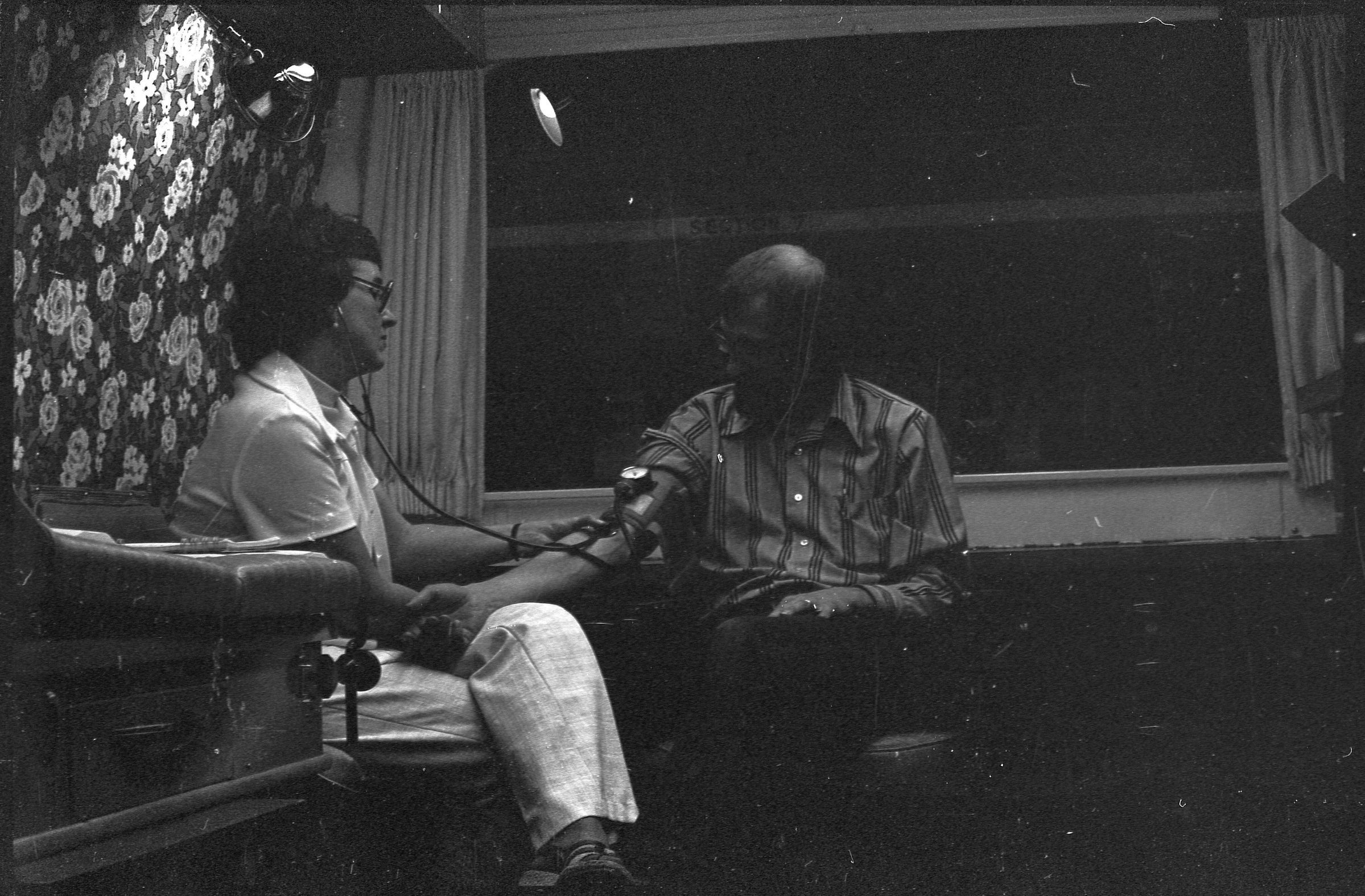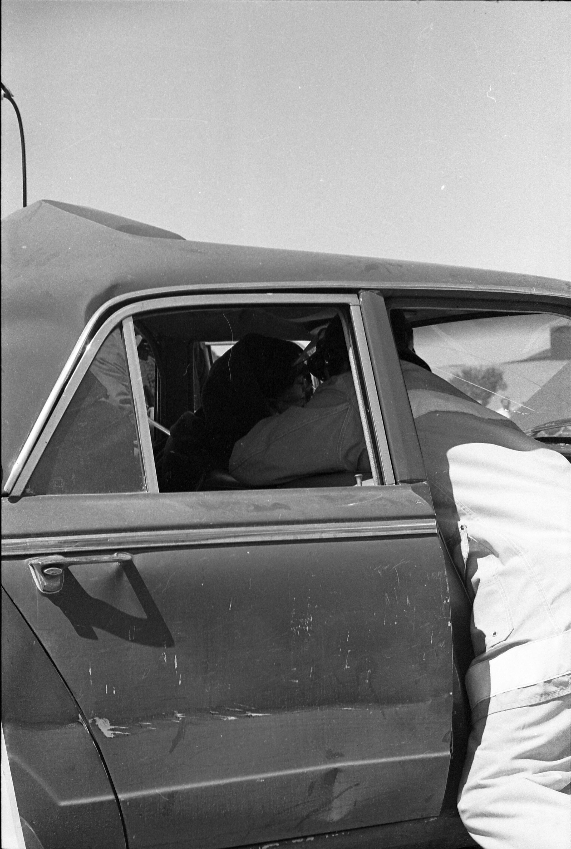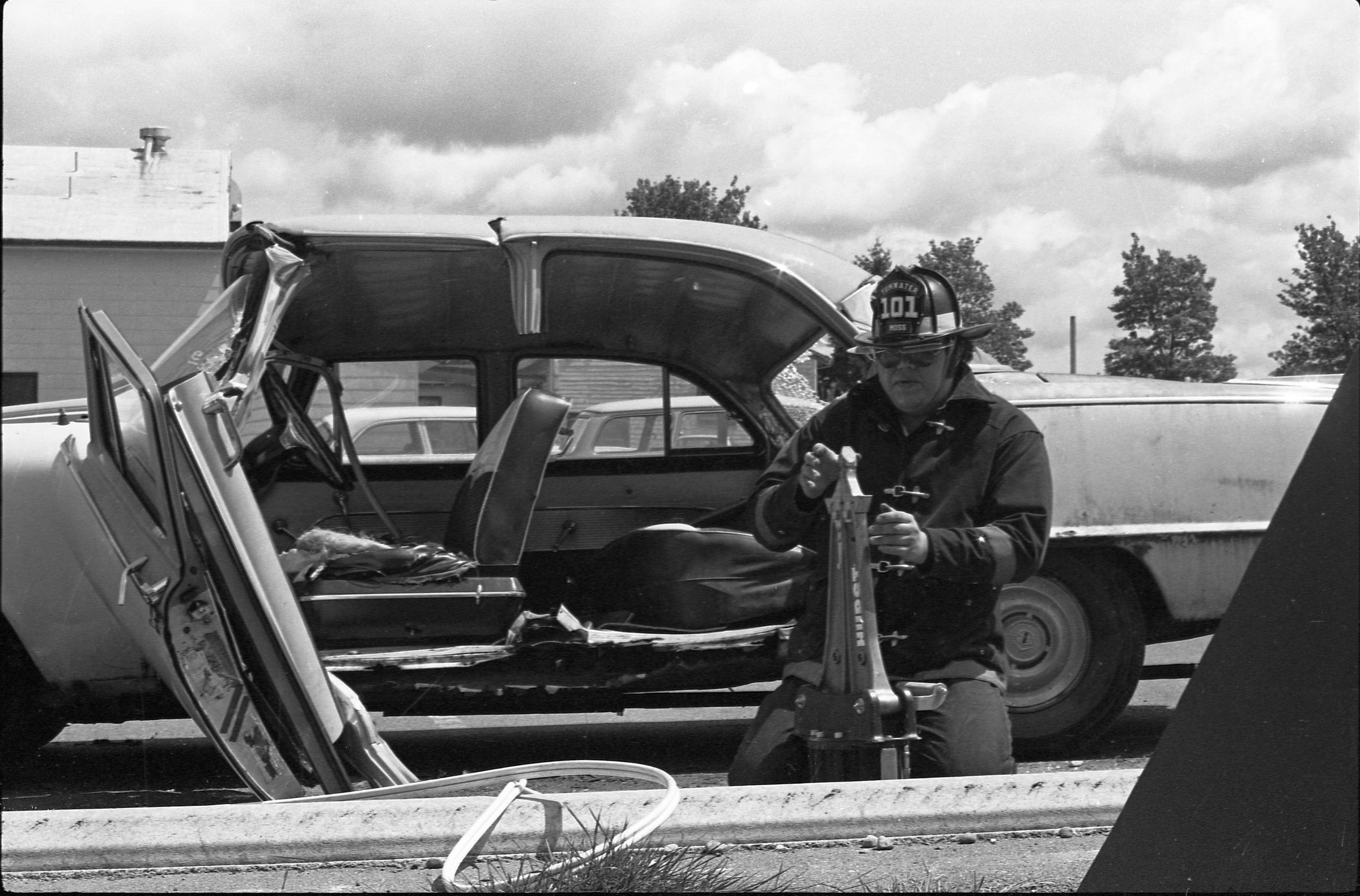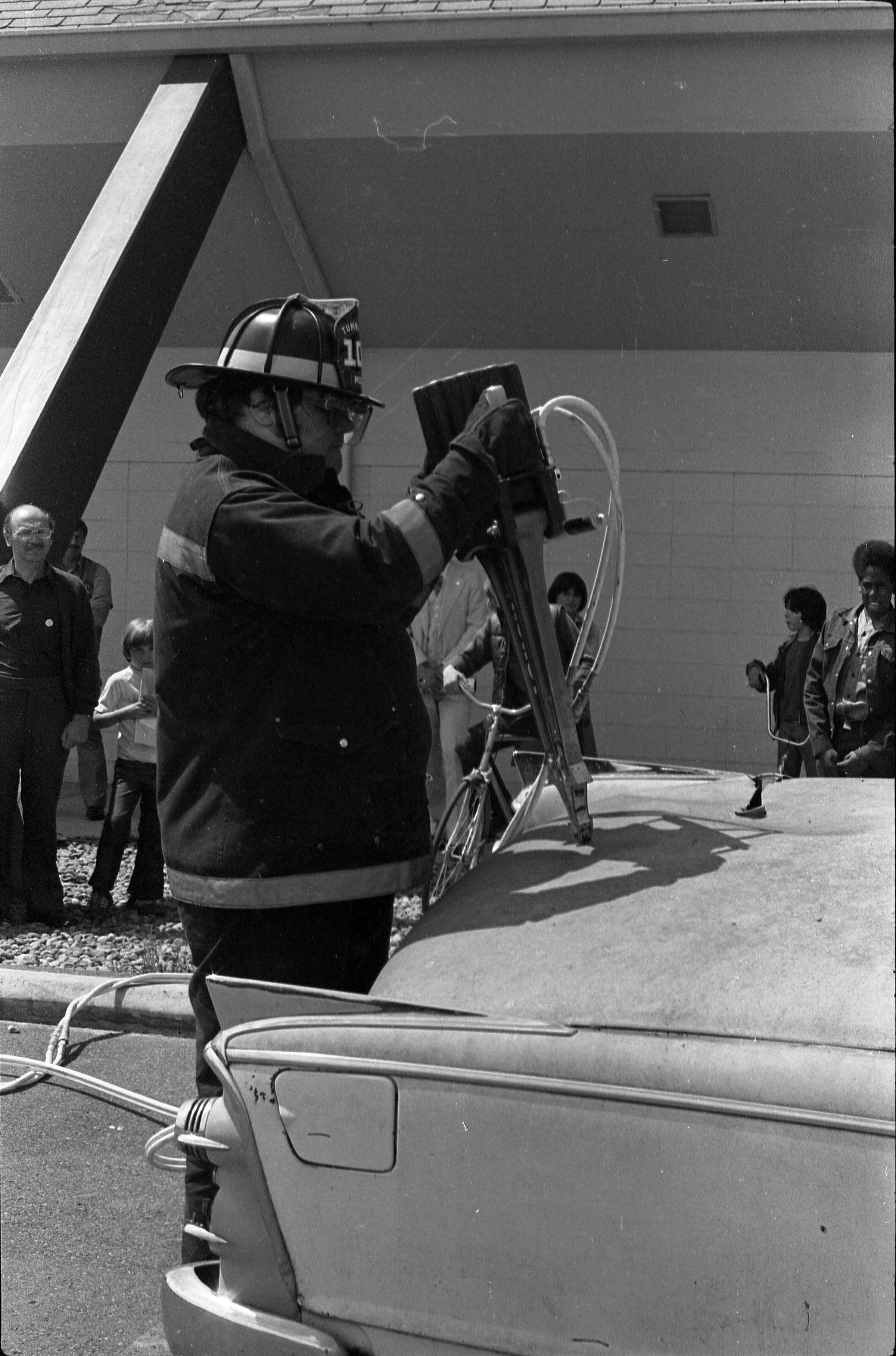 Fire Fighters in Action, 1977. Black and white negative strips of 7 images (one strip of five frames, and one strip of two frames) originally created for the Lacey Leader newspaper. In these photographs we see fire fighters giving a demonstration of things they do on the job. In frame 23 there are two fire fighters with their back to the camera. They are in a uniform and have a helmet on. They are standing in front of a vehicle that appears to have been crushed. In frame 24 we see someone leaning into the front passenger door of a car. The person appears to be a fire fighter and is reaching for someone in the drivers seat. On the strip containing frames 1-3, and 43 and 44: Frame 43 shows two people seated. The one on the left is a woman with a blood pressure cuff and stethoscope around her neck, the other end of the stethoscope is on a man's arm.. She is wearing glasses, and pants with a matching top and has her legs crossed. There is a man seated across from her wearing a striped shirt. Behind the man is a large window. Behind her is floral wall paper. Frame 44 shows a fire fighter standing in front of a car. He appears to operating a tool that opened the car's doors as the doors on the vehicle have been removed. The fire fighter is wearing full fire gear, including a helmet. Frame 1 shows a fire fighter using a tool to open what appears to be the trunk of a car. He is in full fire fighter uniform including a helmet. To the right of him is another fire fighter also wearing full gear and a helmet. To the left of the photo is a person standing and watching their demonstration. Frame 2 shows this same image, but shows that there are at least seven figures in the background watching this demonstration. Frame 3 shows the same image but with a larger crowd behind the fire fighter operating on the trunk of the car. There are adults and children in the crowd.Made/Created