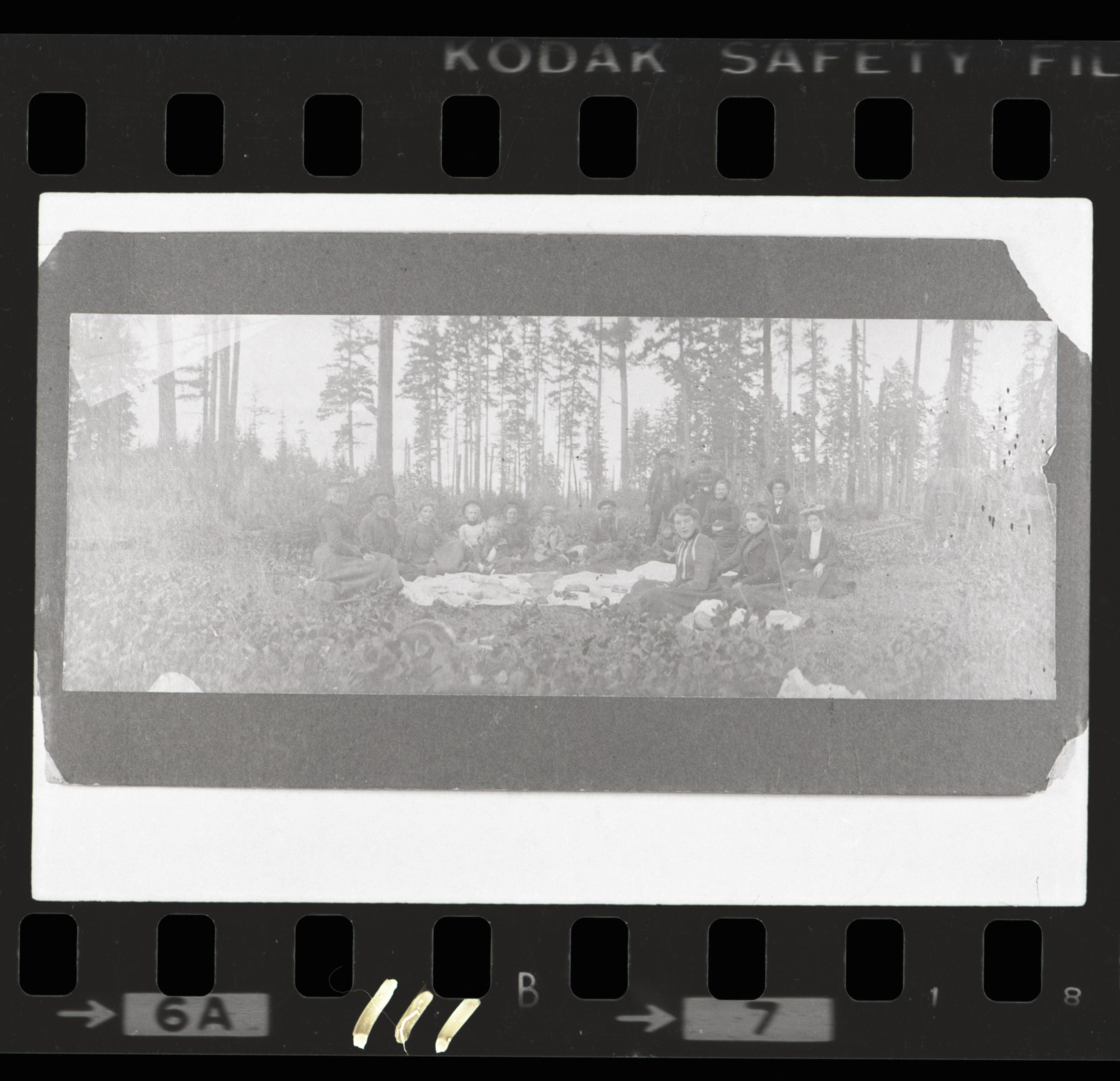 Houchaus family picnic at Hogum Bay. Black and white negative (probably made from an original 7 x 13 print like #102). Image features a wooded landscape with fifteen people sitting around a blanket spread out on the ground. There are many tall trees in the background. The dark mat support can be seen in this image as well as the image flaws like tears and spots.