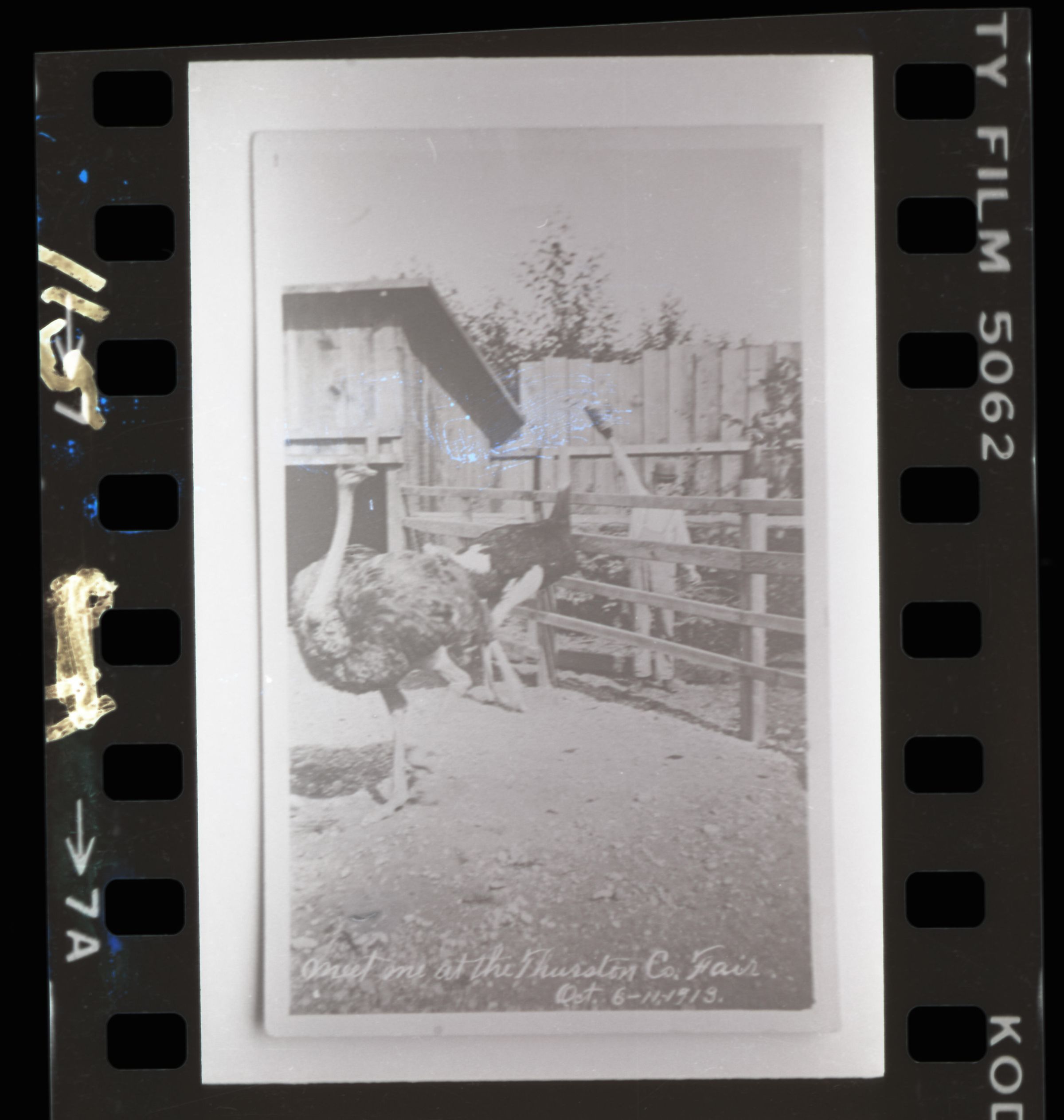 Thurston County Fair promotional photo, October 6-14, 1913. Black and white negative made from an original print on a 3 x 5 postcard. Image features two ostriches in a pen with a fence around it. A man in overalls and a derby hat stands outside the fence holding high in the air a container presumably holding food that one of the ostriches is feeding from. This is difficult to see as a smudge obscures this part of the image. An outbuilding can be seen in the background. A very tall wood fence is behind it. The outline of the original print can be seen in the image with a white border. At the bottom in white handwriting: "Meet Me at the Thurston Co. Fair. Oct. 6-11, 1913."