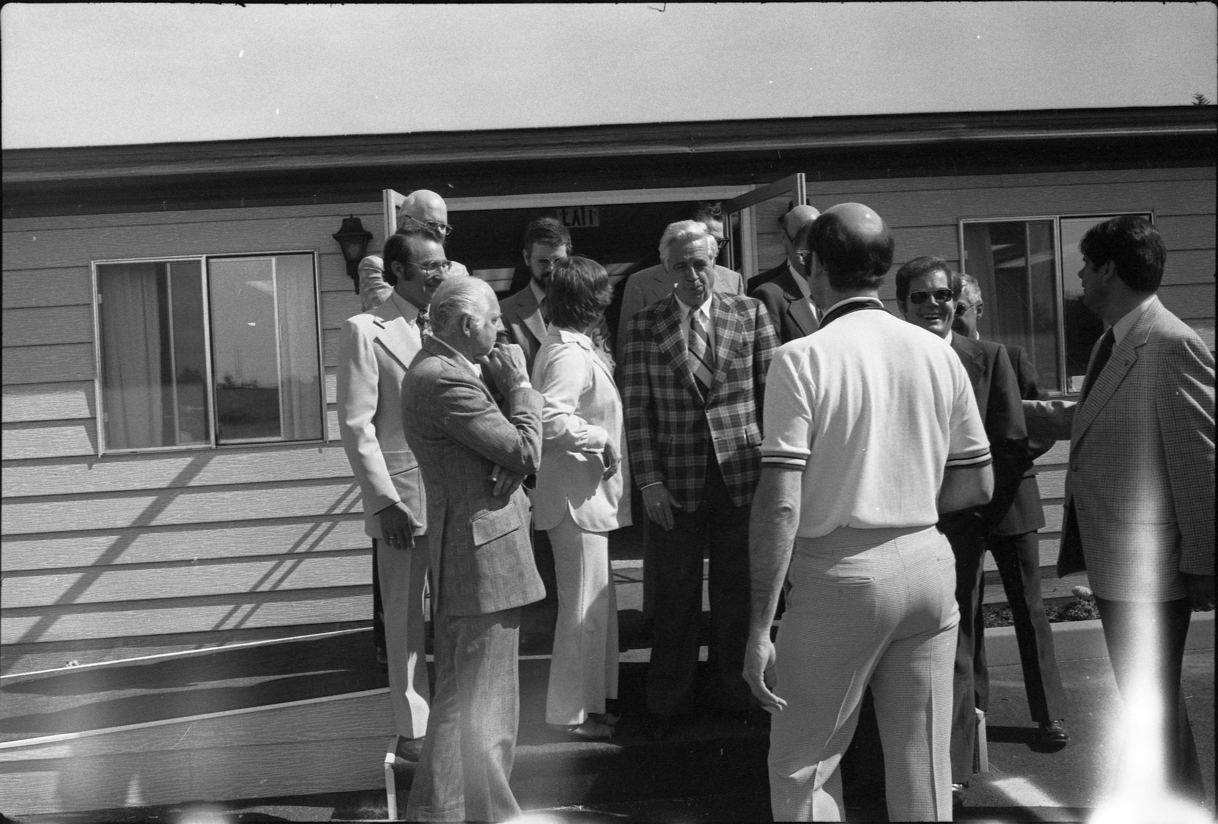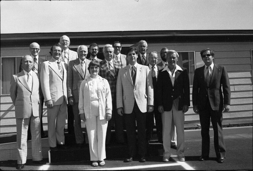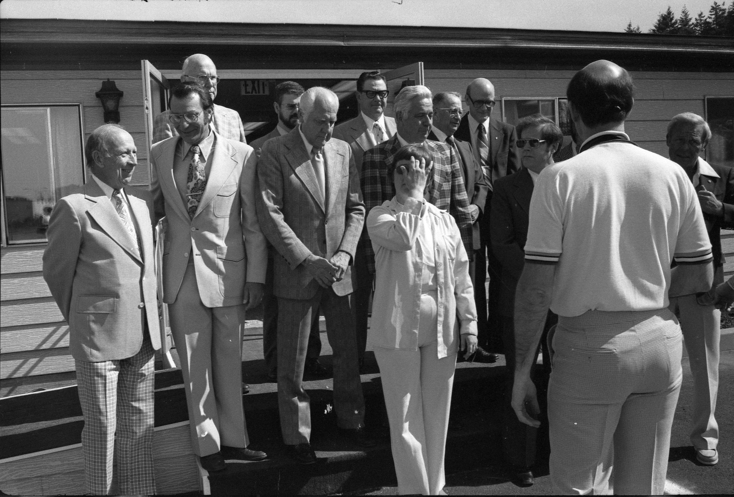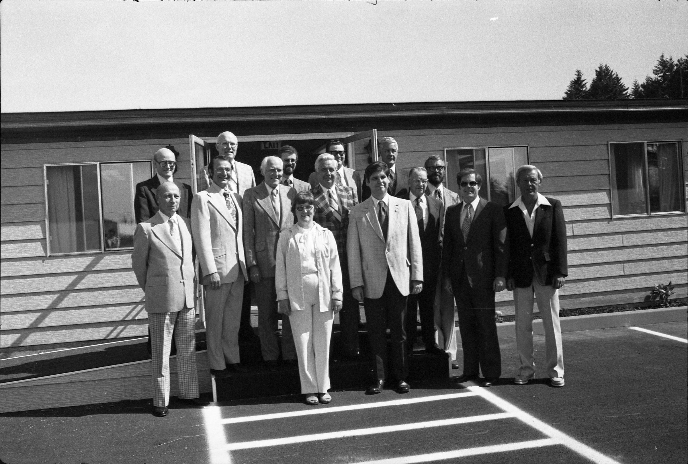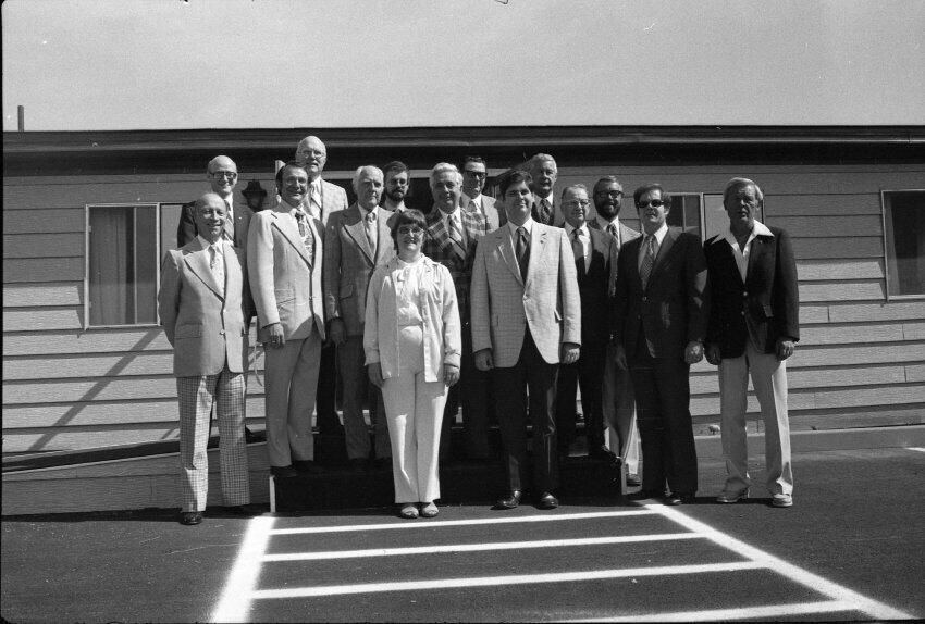 Frames 4-7 are of this same group taken at closer angles. Frames 8-11 show two men being lead into the door by a woman, who is holding the door open. There is a third man standing to the right of the door. The man to the left of the photograph has dark hair, and is wearing dark pants, a light jacket, a shirt and tie. The man next to him is wearing a light suit and a light shirt. Next to him is a woman who is also wearing a light suit. She is holding the door open with her back and gesturing with her hands for the men to enter. Next to the door, on the other side, is a man wearing a suit, a light shirt, and dark framed glasses. He has dark hair and is smiling. Ken Balsley identified the man against the door as John Gott, Chairman of the board. Frame 12 shows a man in a suit standing next to the same woman from earlier. Frame 13 shows a group of 7 people standing in what appears to be a parking lot. There are 5 men wearing suits, and two women. One woman is standing in the middle of the picture with a striped shirt on, and shoulder length hair. The people closest to the camera have their arms crossed across their chest. Frame 14 shows two men standing to the left of the image wearing suits and their hands are in their pockets. In the middle of the photograph, a woman in a suit is shaking hands with a man to the right of the photograph. There are two men standing to either side of the man shaking hands. Frames 15 and 16 show a group of 9 people posing on a platform for their photo. In the middle of the photo is a man (Doug Prull) wearing a light colored jacket, a tie, and dark pants. There are four women to his right and four women to his left. The woman to the right of Mr. Prull is Linda Matthews, and the woman to the right of Ms. Matthews is Nancy McCarty. Frame 17 shows a man in light pants and a white polo taking pictures with a large camera. Behind him are four people standing around talking. Frame 18 shows two men, one in a dark suit jacket and one in a light jacket talking to each other. The man on the right is Ed Bagley. Frame 19 shows the same two men but this photo is taken from in front.Made/Created