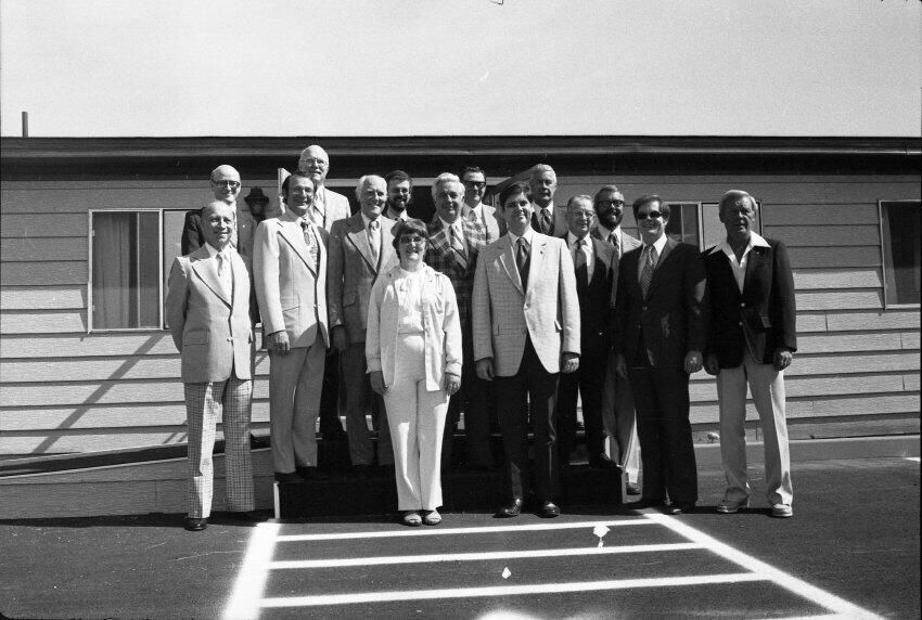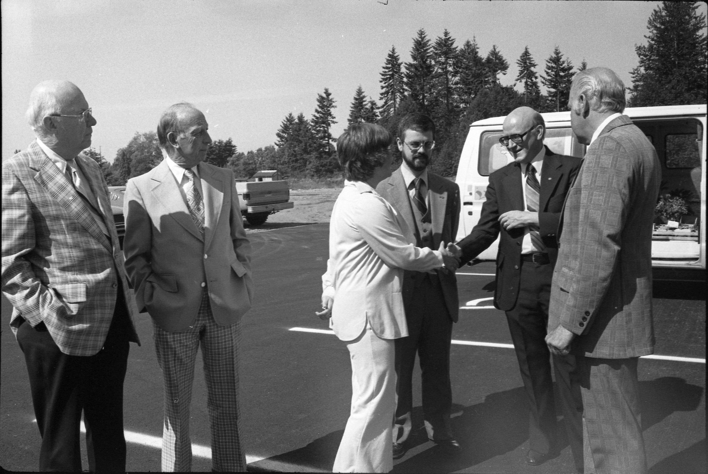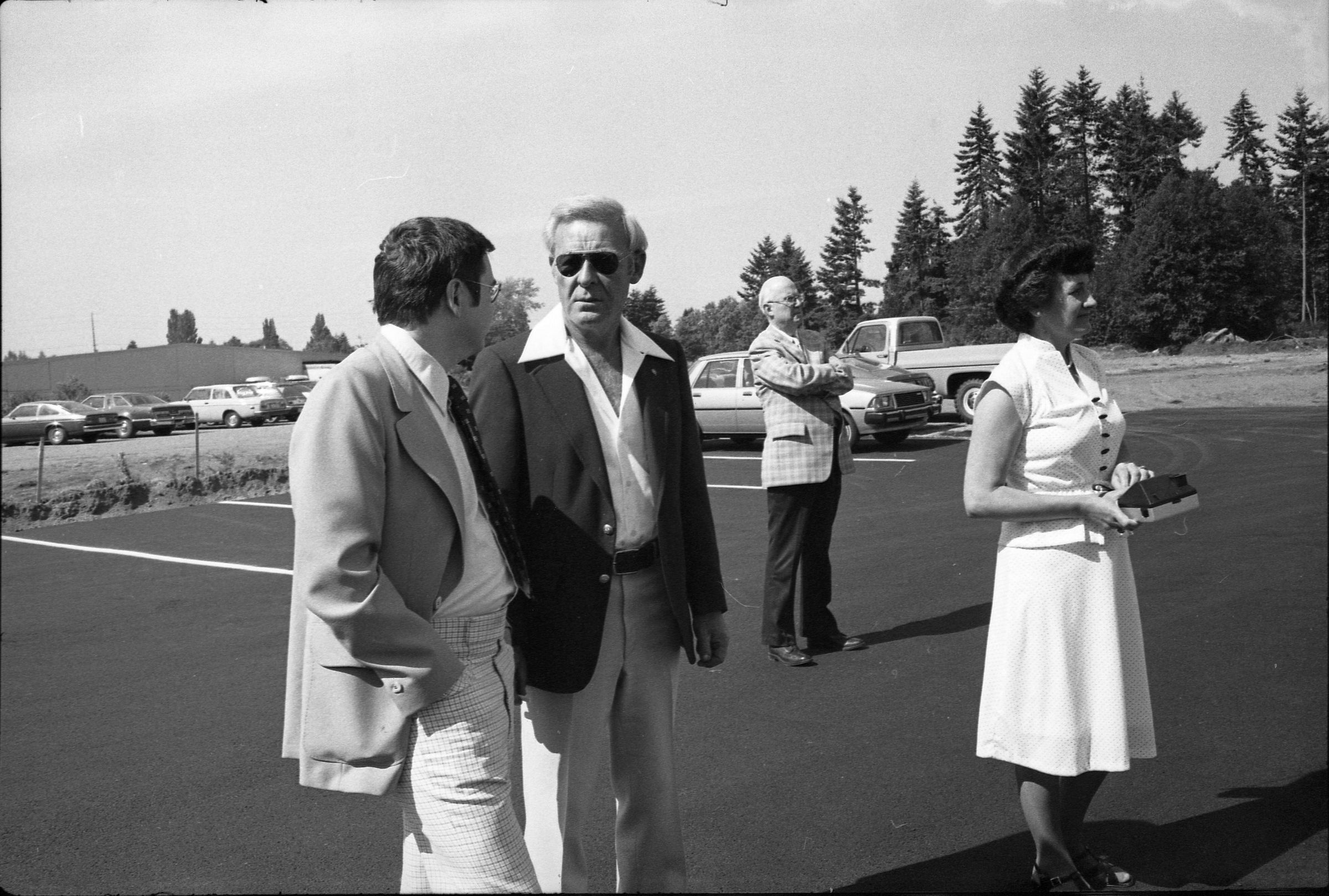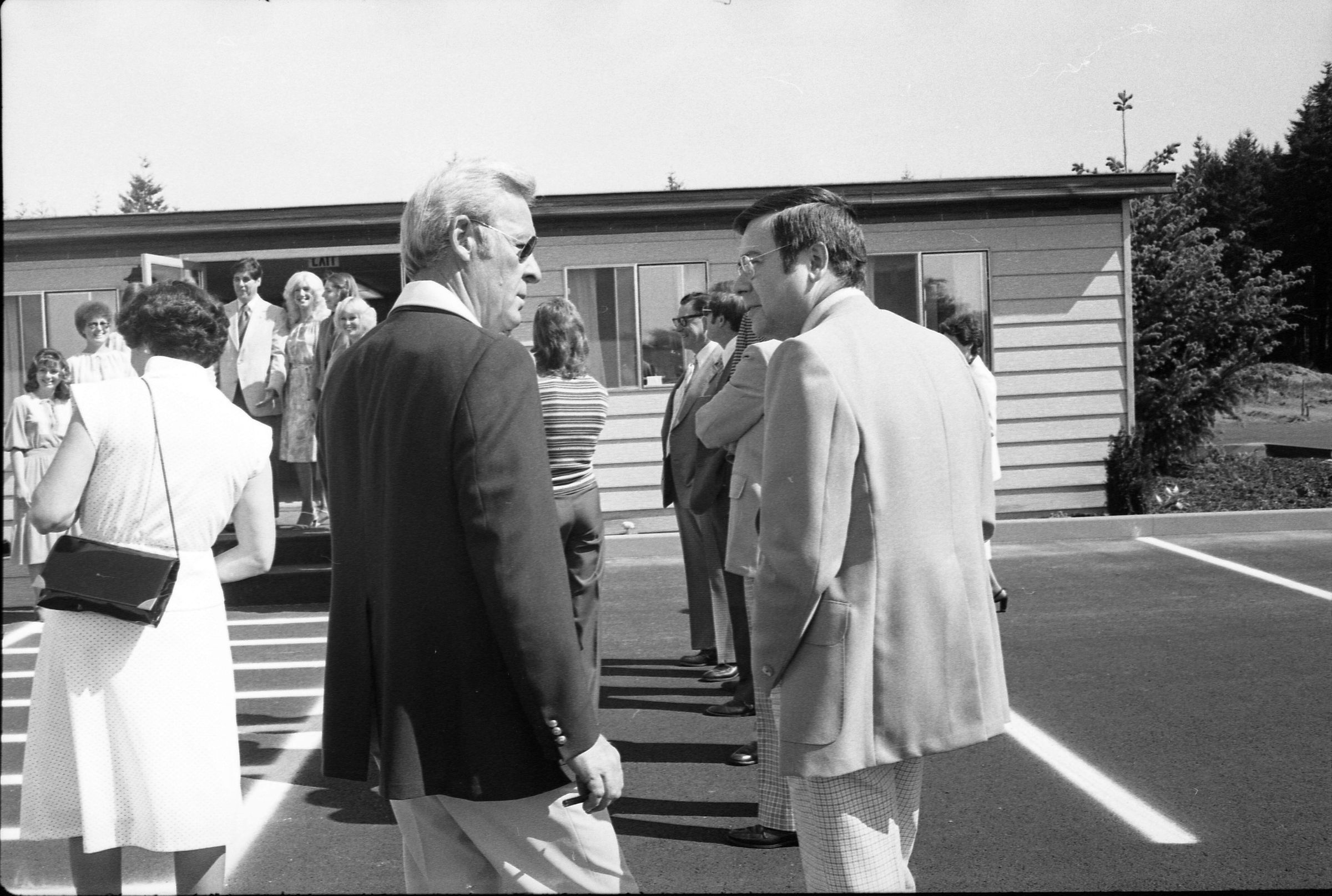 Frames 4-7 are of this same group taken at closer angles. Frames 8-11 show two men being lead into the door by a woman, who is holding the door open. There is a third man standing to the right of the door. The man to the left of the photograph has dark hair, and is wearing dark pants, a light jacket, a shirt and tie. The man next to him is wearing a light suit and a light shirt. Next to him is a woman who is also wearing a light suit. She is holding the door open with her back and gesturing with her hands for the men to enter. Next to the door, on the other side, is a man wearing a suit, a light shirt, and dark framed glasses. He has dark hair and is smiling. Ken Balsley identified the man against the door as John Gott, Chairman of the board. Frame 12 shows a man in a suit standing next to the same woman from earlier. Frame 13 shows a group of 7 people standing in what appears to be a parking lot. There are 5 men wearing suits, and two women. One woman is standing in the middle of the picture with a striped shirt on, and shoulder length hair. The people closest to the camera have their arms crossed across their chest. Frame 14 shows two men standing to the left of the image wearing suits and their hands are in their pockets. In the middle of the photograph, a woman in a suit is shaking hands with a man to the right of the photograph. There are two men standing to either side of the man shaking hands. Frames 15 and 16 show a group of 9 people posing on a platform for their photo. In the middle of the photo is a man (Doug Prull) wearing a light colored jacket, a tie, and dark pants. There are four women to his right and four women to his left. The woman to the right of Mr. Prull is Linda Matthews, and the woman to the right of Ms. Matthews is Nancy McCarty. Frame 17 shows a man in light pants and a white polo taking pictures with a large camera. Behind him are four people standing around talking. Frame 18 shows two men, one in a dark suit jacket and one in a light jacket talking to each other. The man on the right is Ed Bagley. Frame 19 shows the same two men but this photo is taken from in front.Made/Created