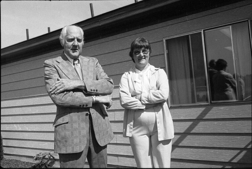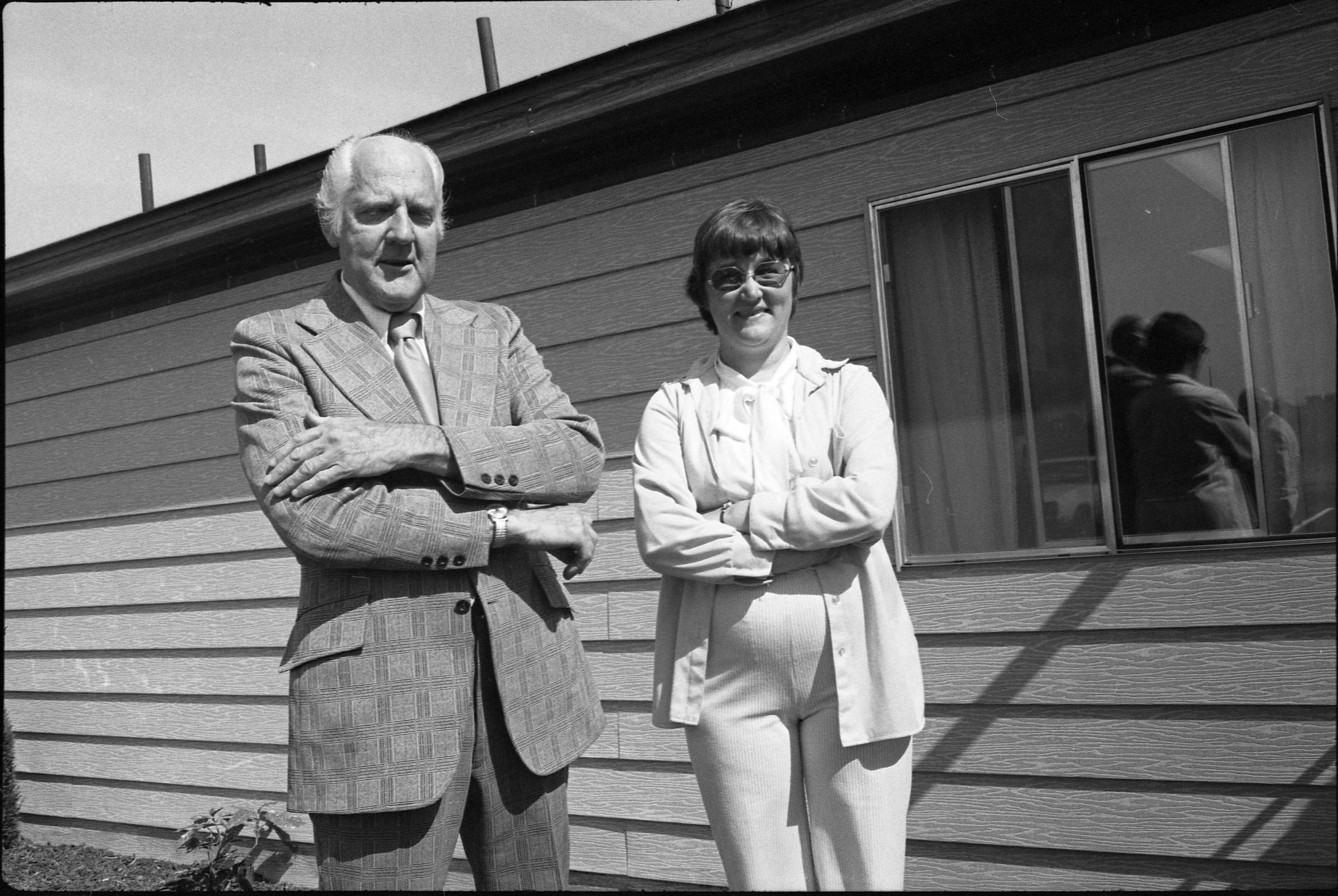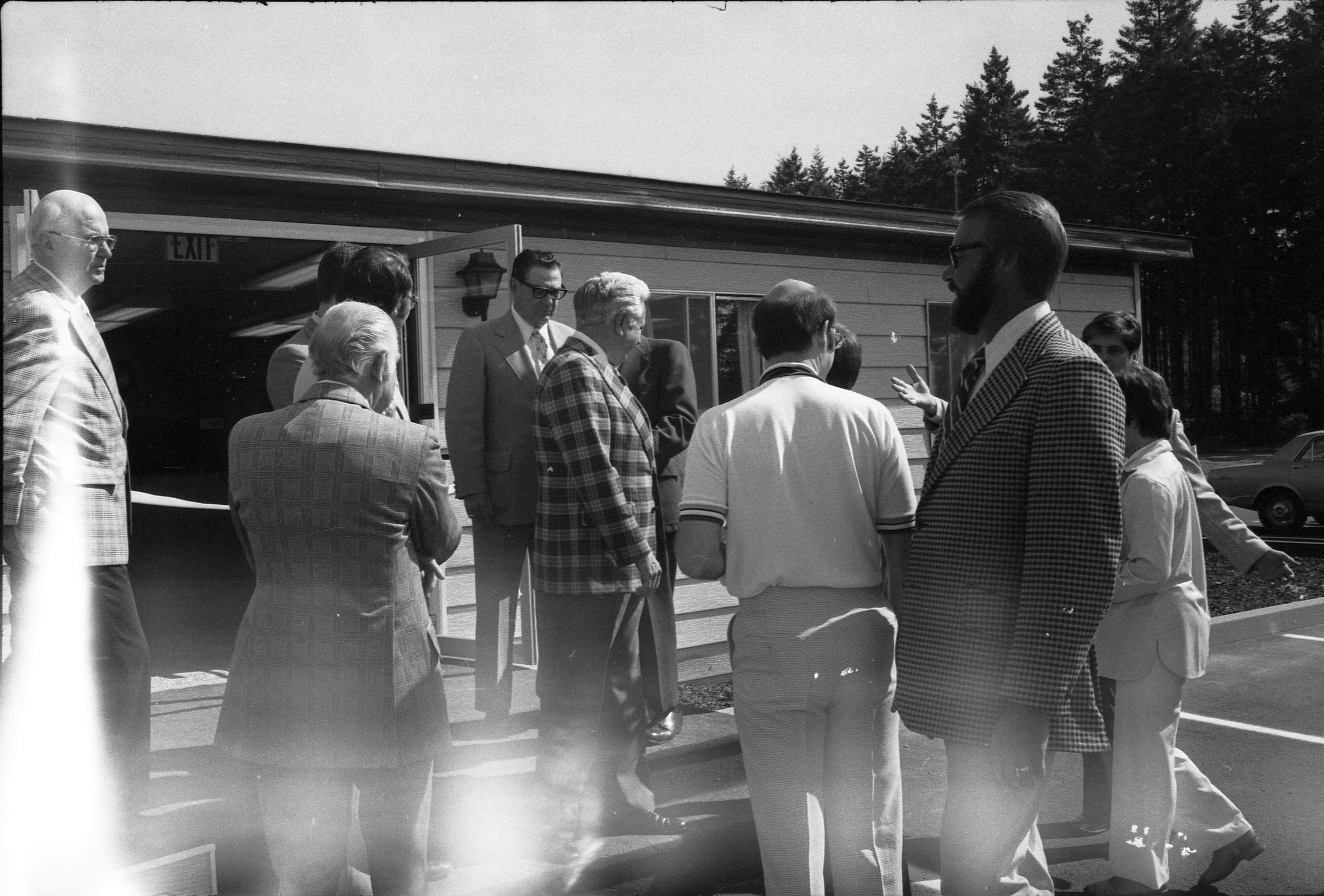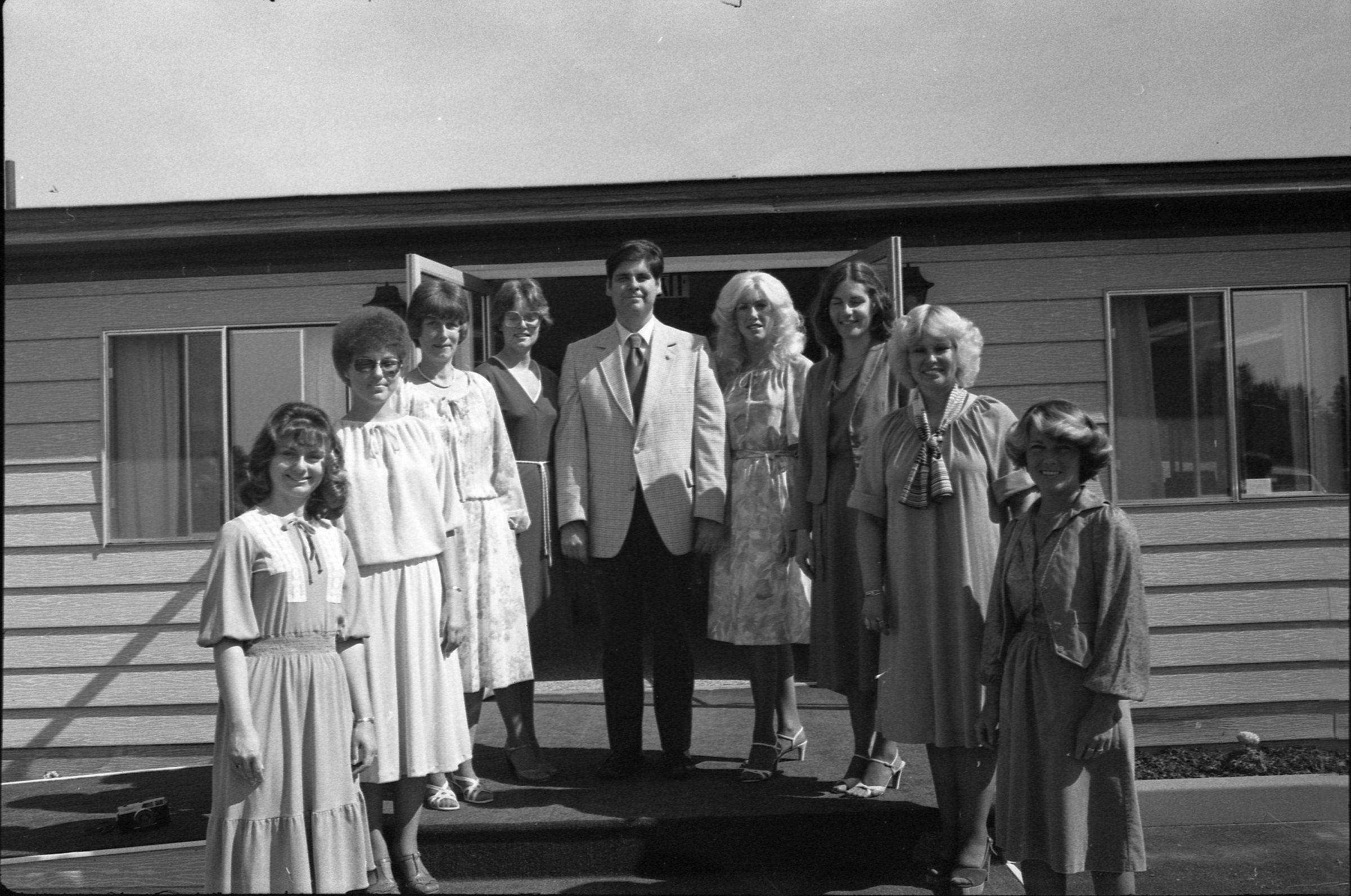 Frames 4-7 are of this same group taken at closer angles. Frames 8-11 show two men being lead into the door by a woman, who is holding the door open. There is a third man standing to the right of the door. The man to the left of the photograph has dark hair, and is wearing dark pants, a light jacket, a shirt and tie. The man next to him is wearing a light suit and a light shirt. Next to him is a woman who is also wearing a light suit. She is holding the door open with her back and gesturing with her hands for the men to enter. Next to the door, on the other side, is a man wearing a suit, a light shirt, and dark framed glasses. He has dark hair and is smiling. Ken Balsley identified the man against the door as John Gott, Chairman of the board. Frame 12 shows a man in a suit standing next to the same woman from earlier. Frame 13 shows a group of 7 people standing in what appears to be a parking lot. There are 5 men wearing suits, and two women. One woman is standing in the middle of the picture with a striped shirt on, and shoulder length hair. The people closest to the camera have their arms crossed across their chest. Frame 14 shows two men standing to the left of the image wearing suits and their hands are in their pockets. In the middle of the photograph, a woman in a suit is shaking hands with a man to the right of the photograph. There are two men standing to either side of the man shaking hands. Frames 15 and 16 show a group of 9 people posing on a platform for their photo. In the middle of the photo is a man (Doug Prull) wearing a light colored jacket, a tie, and dark pants. There are four women to his right and four women to his left. The woman to the right of Mr. Prull is Linda Matthews, and the woman to the right of Ms. Matthews is Nancy McCarty. Frame 17 shows a man in light pants and a white polo taking pictures with a large camera. Behind him are four people standing around talking. Frame 18 shows two men, one in a dark suit jacket and one in a light jacket talking to each other. The man on the right is Ed Bagley. Frame 19 shows the same two men but this photo is taken from in front.Made/Created