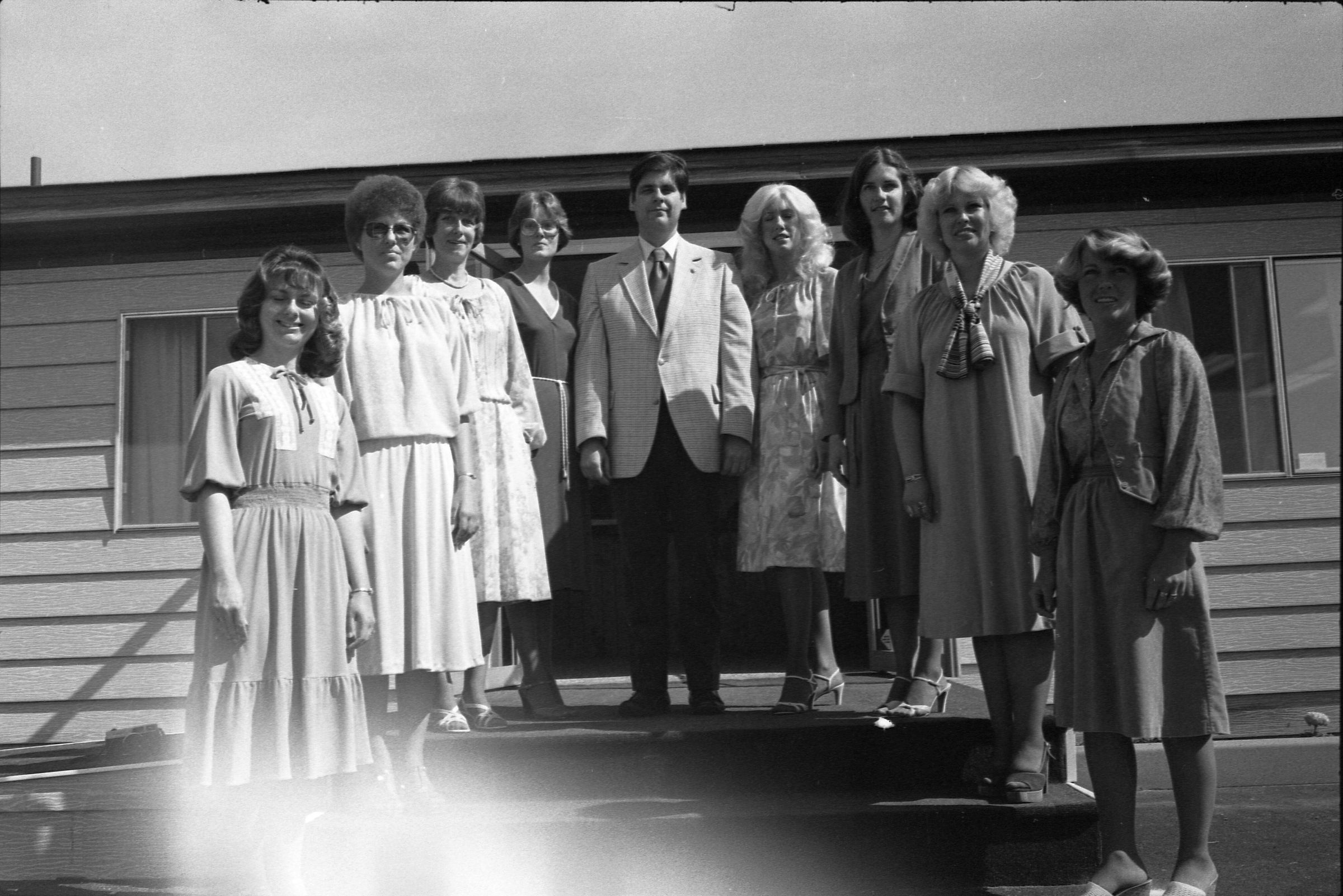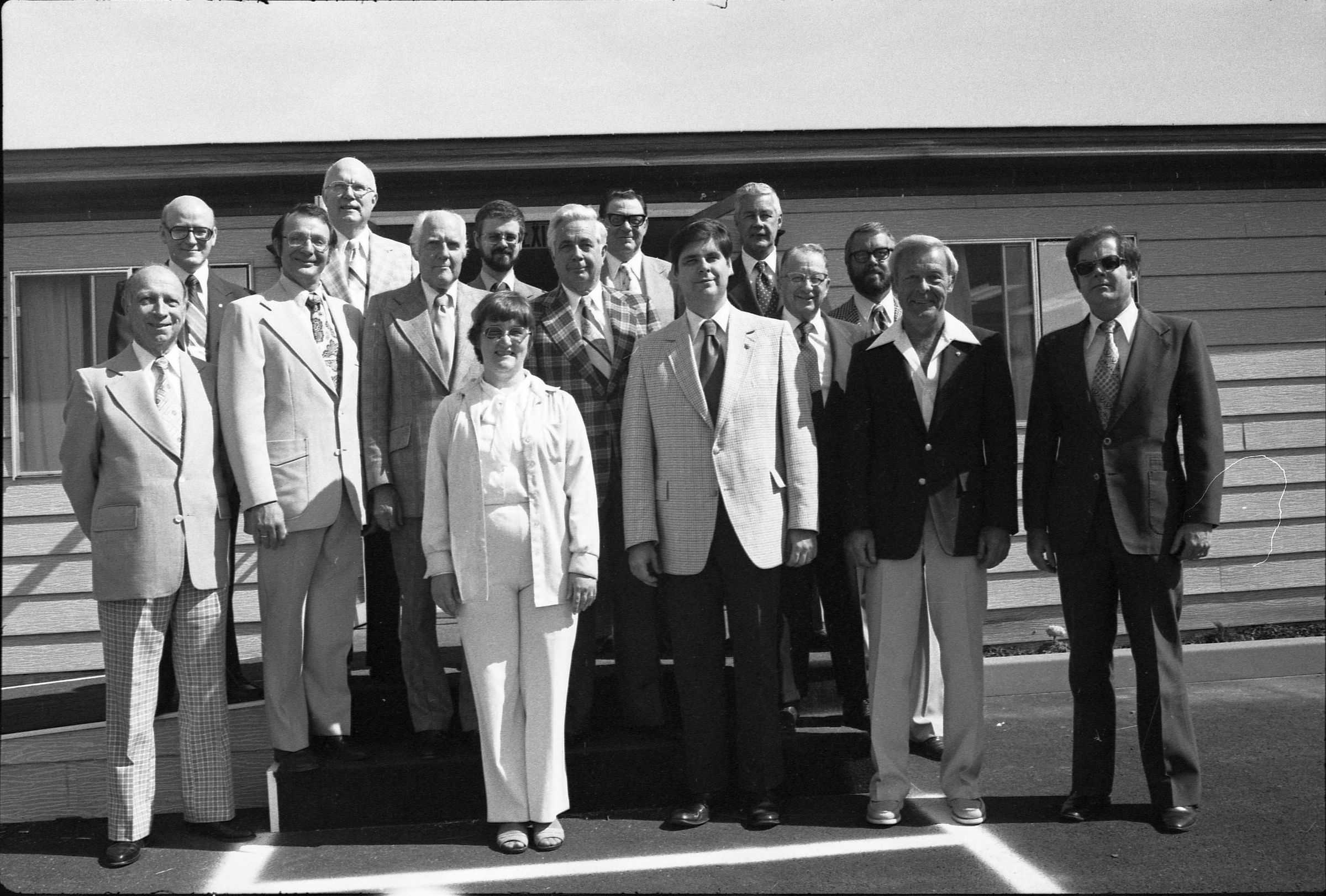 The strip containing frames 1-3 and 43-44: Frame 43 and 44 show at least eleven people standing near a platform outside of a building. At the center of both photos is a man in a plaid jacket. On the left-hand side of the image is a tall man with a beard and glasses wearing a blazer with a small plaid pattern. This man is Ron Rowe. Frame 1 shows a large group being arranged on a platform to have their photo taken. A man in light pants and a white polo shirt is standing in front of the group and appears to be arranging them. Everyone in the photograph is wearing a suit, shirt and tie. Frames 2 and 3 are of the posed group in front of the building. 15 people are visible in the images. The people shown in images 2 and 3 are, from left to right, front row: Karen Fraser and Doug Prull; middle row: Bob Williams, Paul DeTray, four unknown men, and Ed Bettine; back row: Kenneth Wilcox, an unknown man, Ken Parsons, two unknown men, and Ron Rowe.