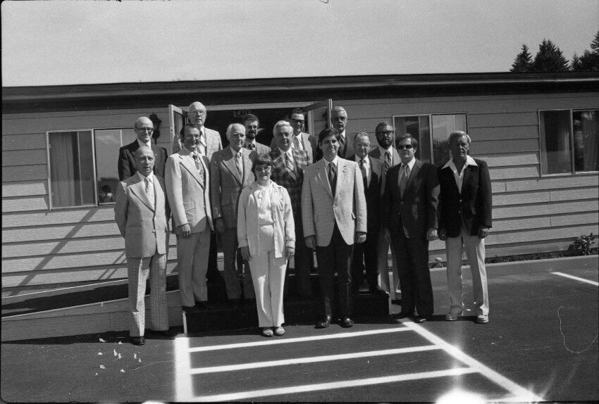 Lacey Bank Ribbon Cutting, 1979. Black and white film negative strips of 21 frames (one strip of six frames, and three strips of five frames) originally created for the Lacey Leader newspaper. These photos show the Lacey Bank Ribbon Cutting ceremony on June 1, 1979.