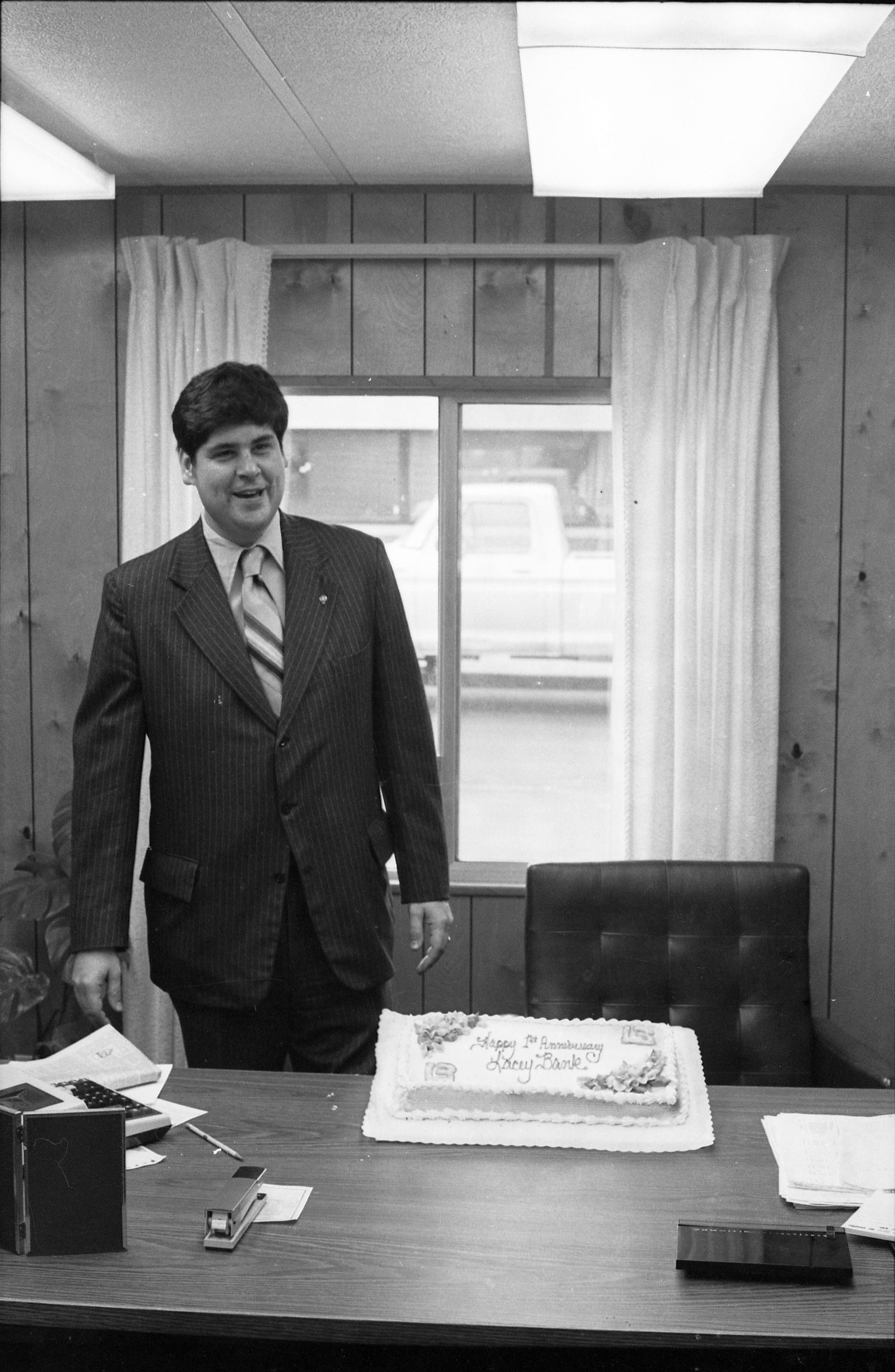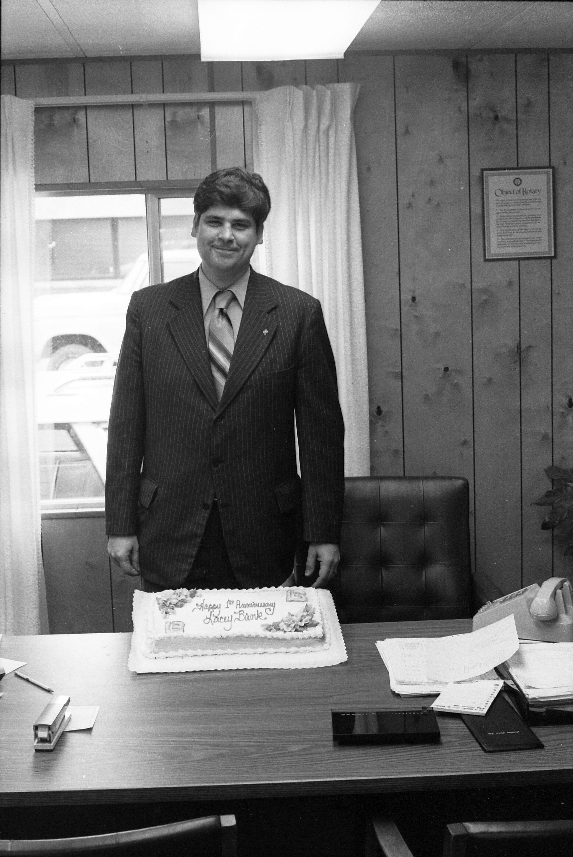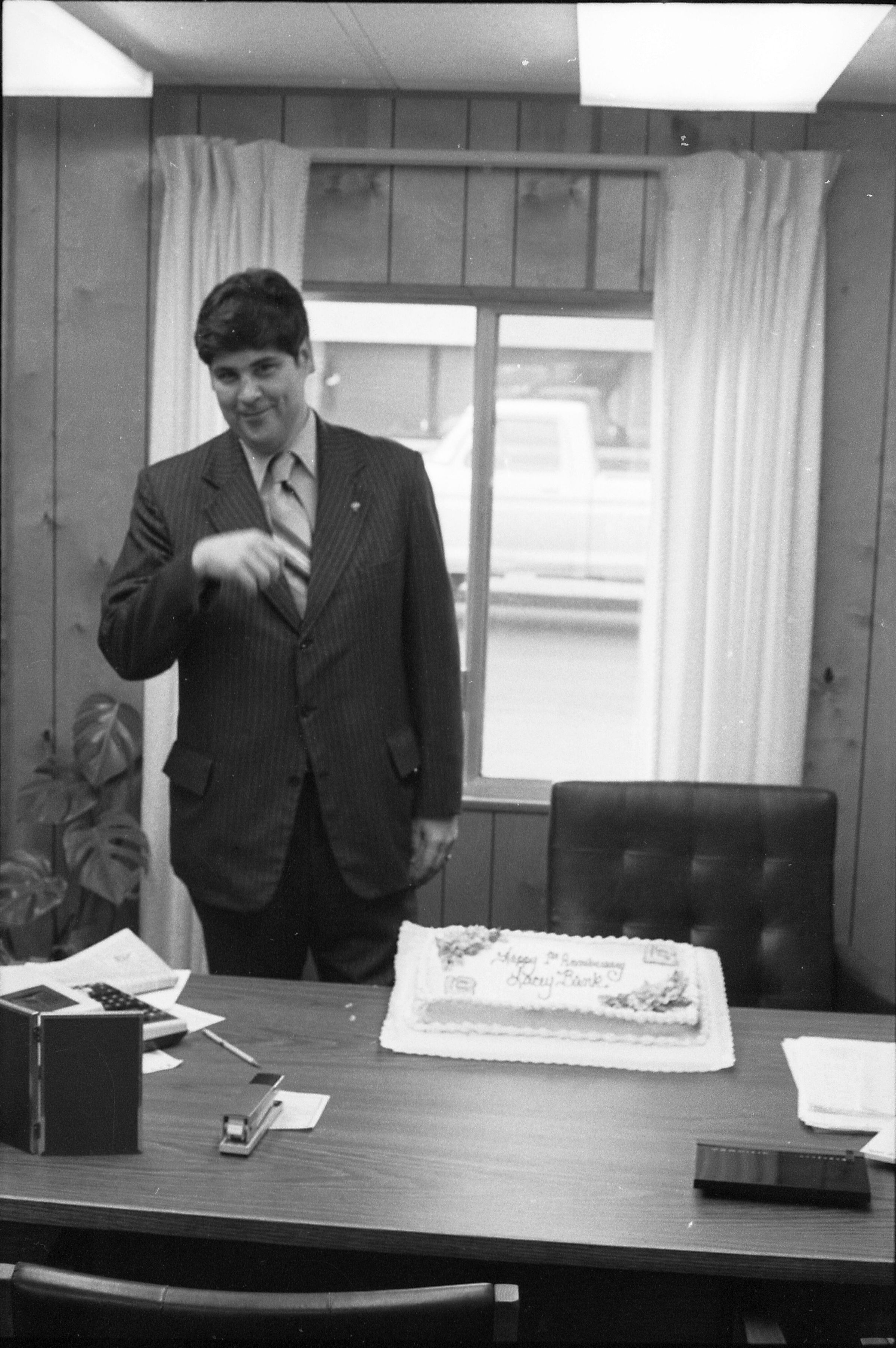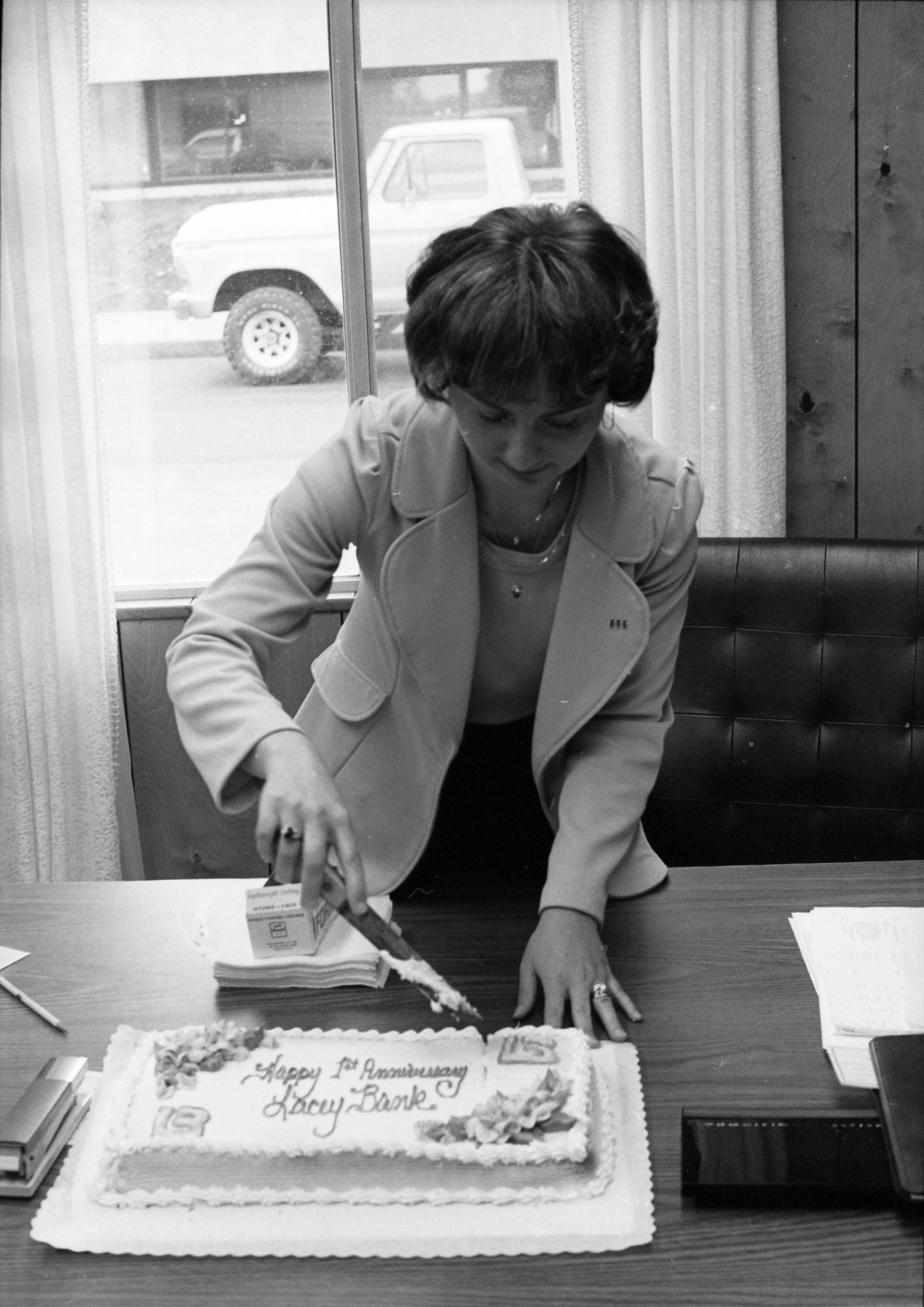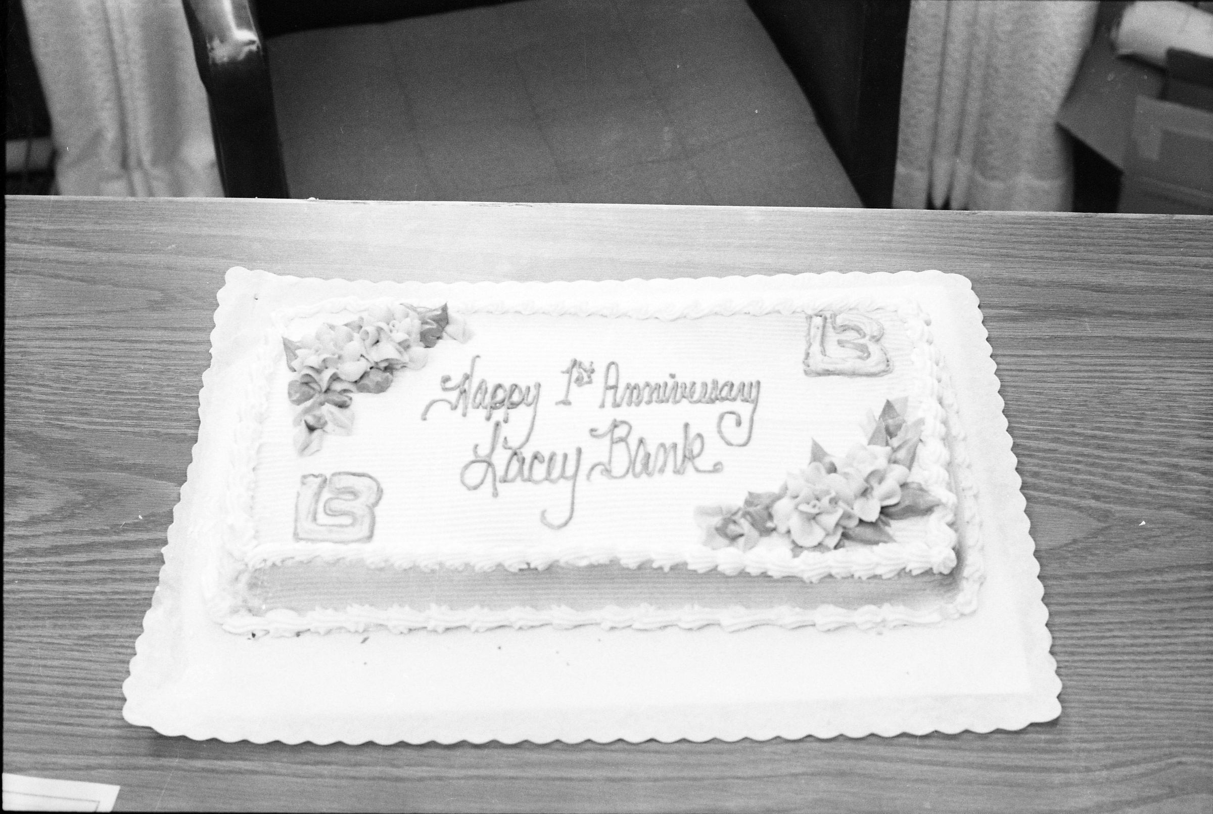 Frame 44 shows a cake on top of a wooden table. The cake reads "Happy 1st Anniversary Lacey Bank" There are flowers on the top left corner and bottom right corner on the cake. Frames 1-4 show a man with dark hair (Doug Prull) in a dark suit, light shirt, and striped tie. He is standing in front of the cake In frame 1 he appears to be correcting his tie with his right hand. In frames 2-4 his arms are down by his sides and he is smiling. Frame 5 shows at least seven women that appear to be bank tellers. Three women are seated in tall chairs at a counter. Two women are walking close to each other behind the seated women. There are also women seated opposite the tellers, possibly working the drive thru window. Frame 6 shows a woman in what appears to be a dress, and a blazer and has dark hair. She is leaning over the table cutting the cake with a large knife. Frame 7 shows two men both with dark hair and in dark suits. Both men also have light shirts on and ties.They are standing next to each other talking and are both looking to the left of the photo. The man on the left is Doug Prull, and the man on the right is Ken Balsley. The taller man on the left of the image is Doug Prull, President of the bank. Frame 8 shows a woman behind a desk in dark pants and a light colored jacket. She is handing something to another woman who is wearing dark pants and a floral top. Behind that woman are two more women who are holding what appears to be a plate and talking. Behind them is a filing cabinet with a potted plant on top. To the left of the filing cabinet are wooden cabinets. Frames 9 and 10 show two men standing next to each other talking. Both men have dark hair, are wearing dark suits, light shirts and ties. The man on the left of the photo (Doug Prull) is taller and you are able to see his face, the man on the right (Ed Bagley) is looking at him, so the back of his head is toward the camera. Frame 11 shows these same two men but they have switched sides. Frame 12 shows construction of a room. There is wood laying on the floor and someone is on top of a ladder holding something up to the top of a door way. There is a bucket and wooden benches set up around the floor and a large pile of wood on the floor. frame 13 shows a sign with an "LB" logo and under it and it reads "Lacey Bank."Made/Created