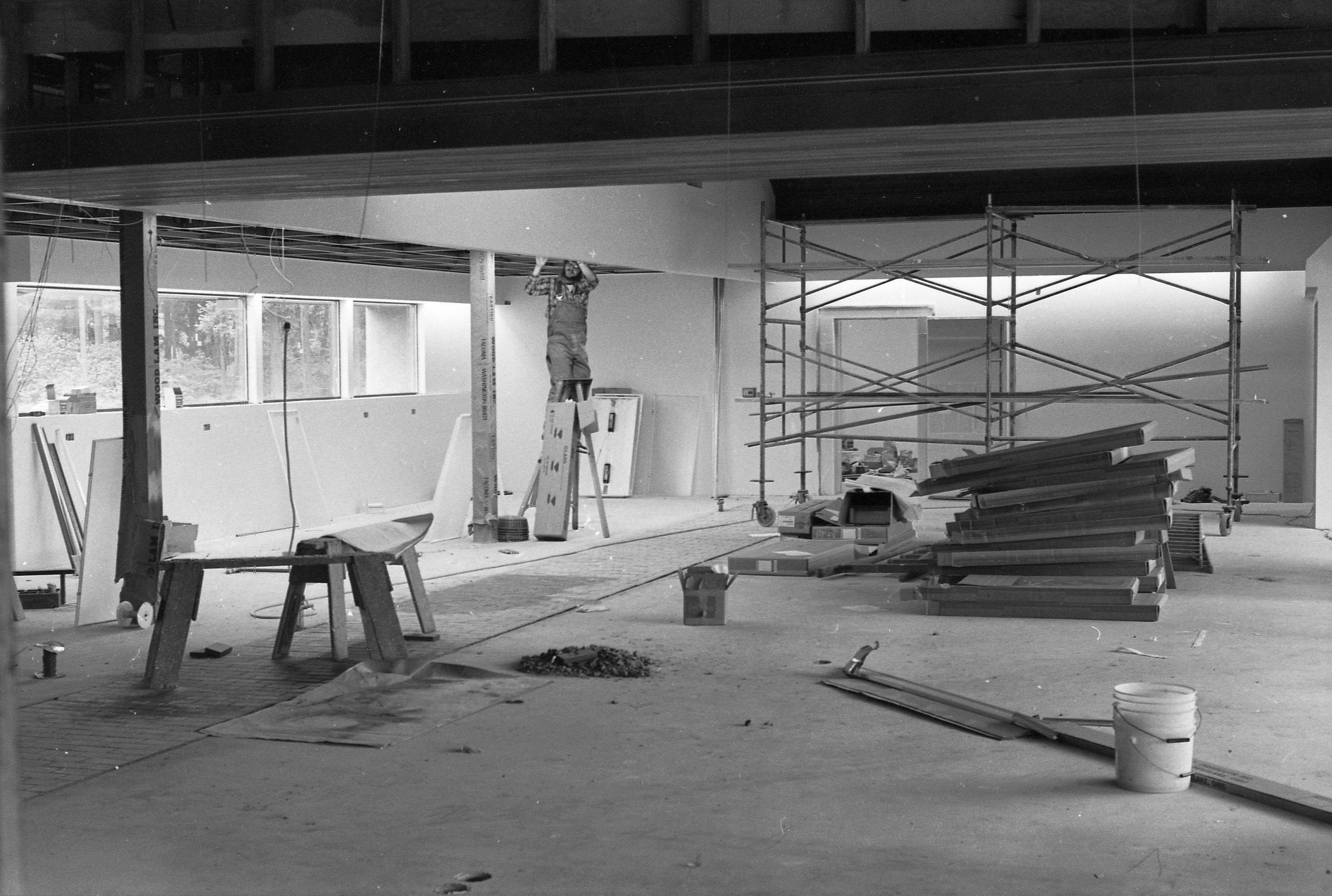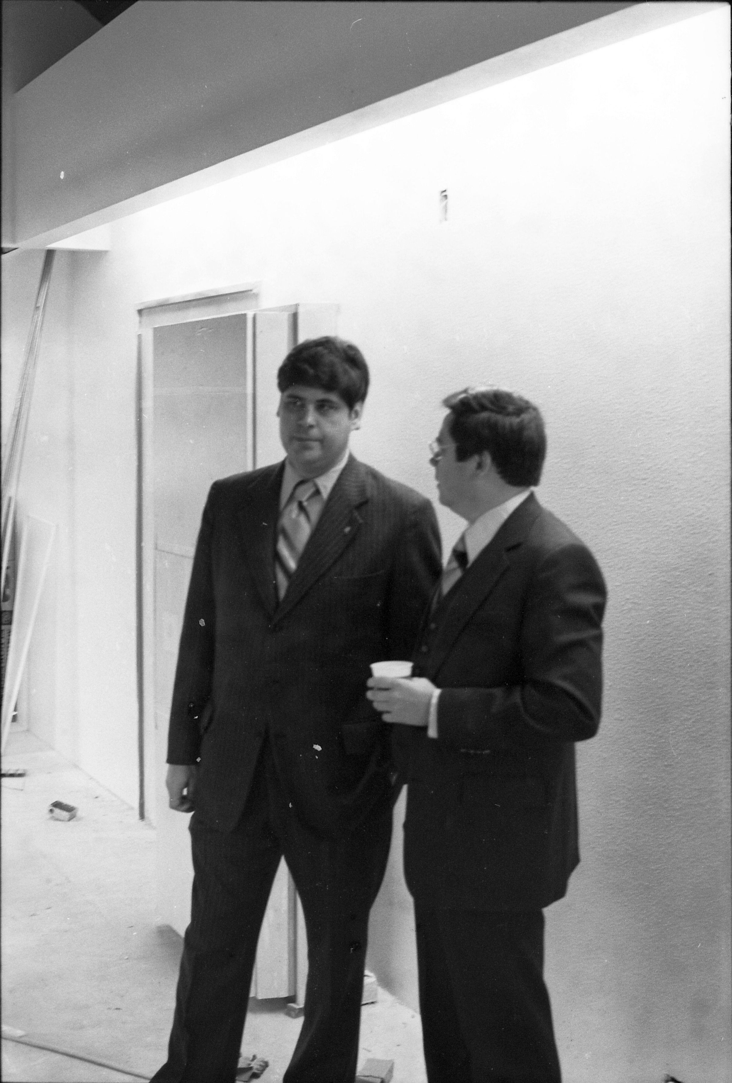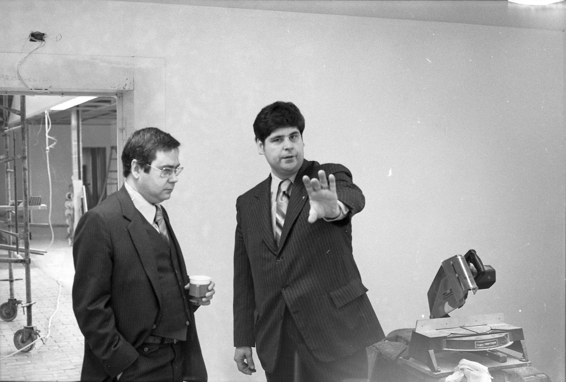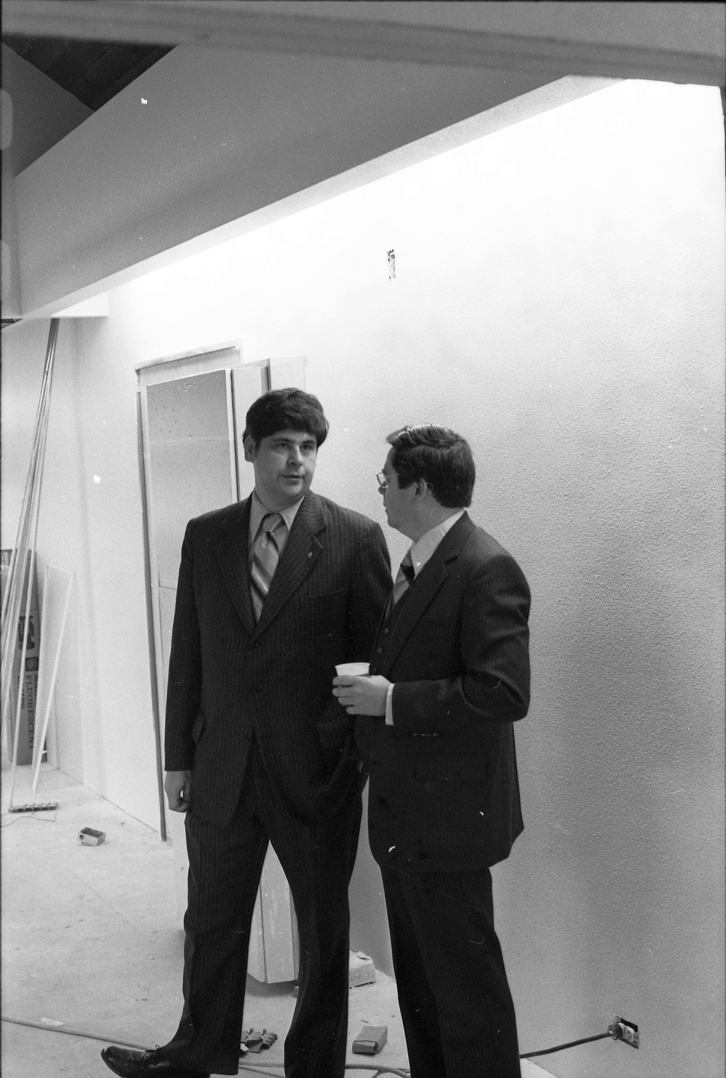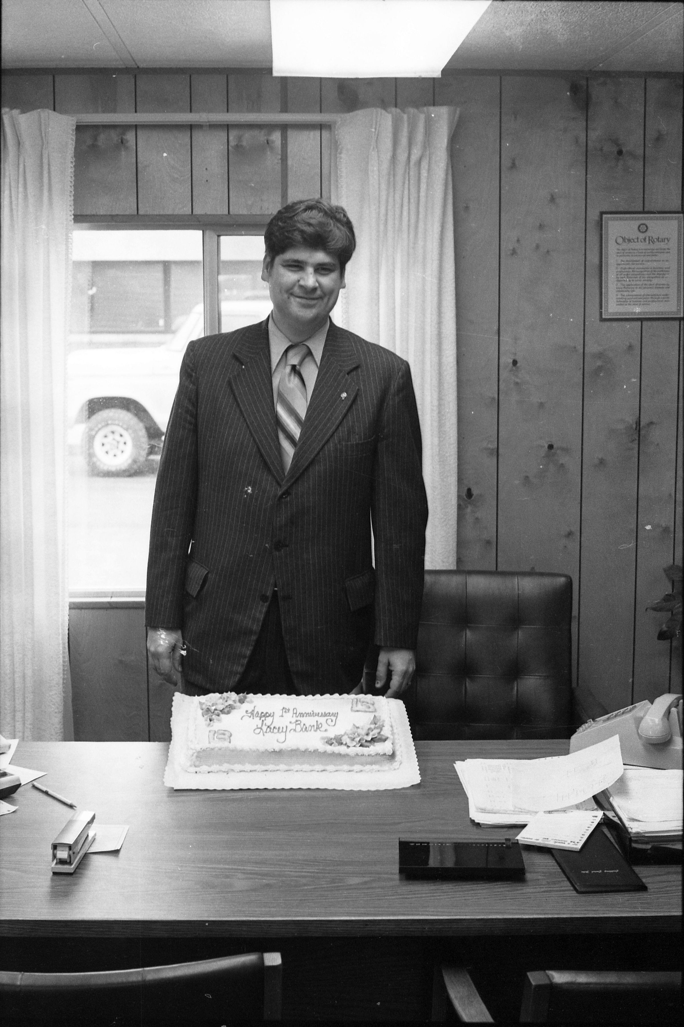 Frame 44 shows a cake on top of a wooden table. The cake reads "Happy 1st Anniversary Lacey Bank" There are flowers on the top left corner and bottom right corner on the cake. Frames 1-4 show a man with dark hair (Doug Prull) in a dark suit, light shirt, and striped tie. He is standing in front of the cake In frame 1 he appears to be correcting his tie with his right hand. In frames 2-4 his arms are down by his sides and he is smiling. Frame 5 shows at least seven women that appear to be bank tellers. Three women are seated in tall chairs at a counter. Two women are walking close to each other behind the seated women. There are also women seated opposite the tellers, possibly working the drive thru window. Frame 6 shows a woman in what appears to be a dress, and a blazer and has dark hair. She is leaning over the table cutting the cake with a large knife. Frame 7 shows two men both with dark hair and in dark suits. Both men also have light shirts on and ties.They are standing next to each other talking and are both looking to the left of the photo. The man on the left is Doug Prull, and the man on the right is Ken Balsley. The taller man on the left of the image is Doug Prull, President of the bank. Frame 8 shows a woman behind a desk in dark pants and a light colored jacket. She is handing something to another woman who is wearing dark pants and a floral top. Behind that woman are two more women who are holding what appears to be a plate and talking. Behind them is a filing cabinet with a potted plant on top. To the left of the filing cabinet are wooden cabinets. Frames 9 and 10 show two men standing next to each other talking. Both men have dark hair, are wearing dark suits, light shirts and ties. The man on the left of the photo (Doug Prull) is taller and you are able to see his face, the man on the right (Ed Bagley) is looking at him, so the back of his head is toward the camera. Frame 11 shows these same two men but they have switched sides. Frame 12 shows construction of a room. There is wood laying on the floor and someone is on top of a ladder holding something up to the top of a door way. There is a bucket and wooden benches set up around the floor and a large pile of wood on the floor. frame 13 shows a sign with an "LB" logo and under it and it reads "Lacey Bank."Made/Created