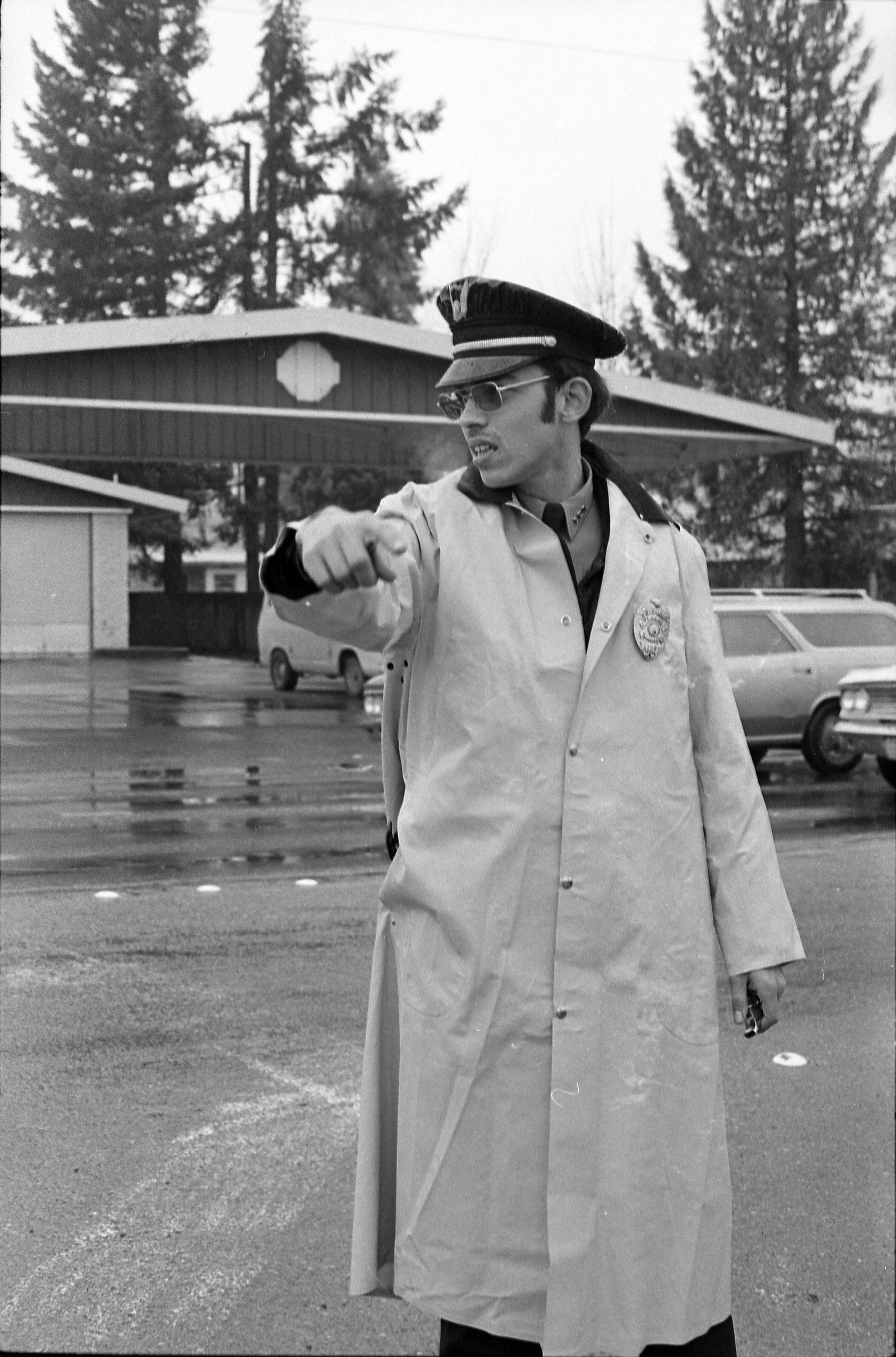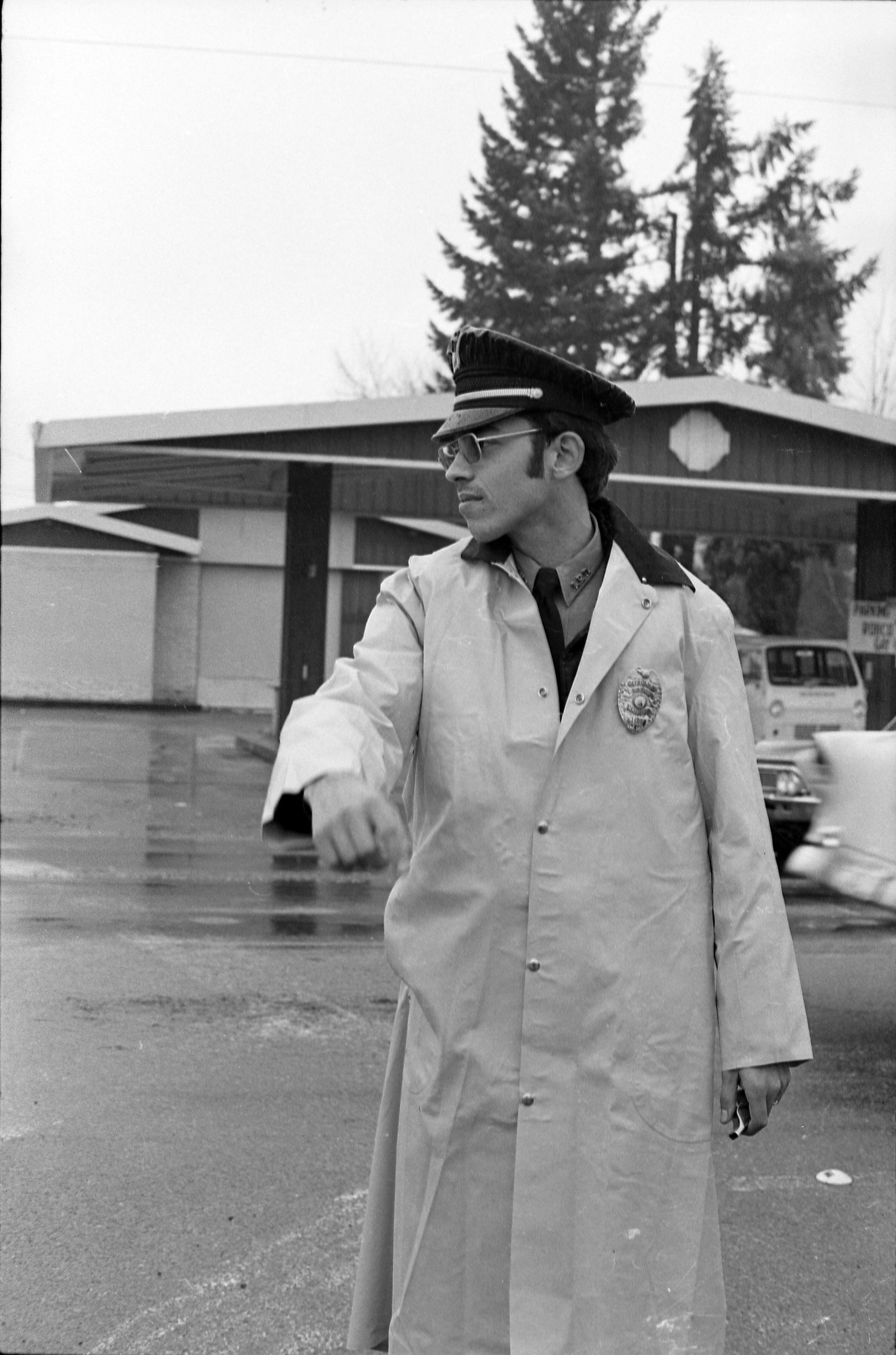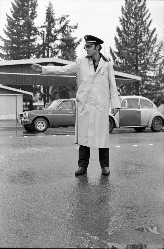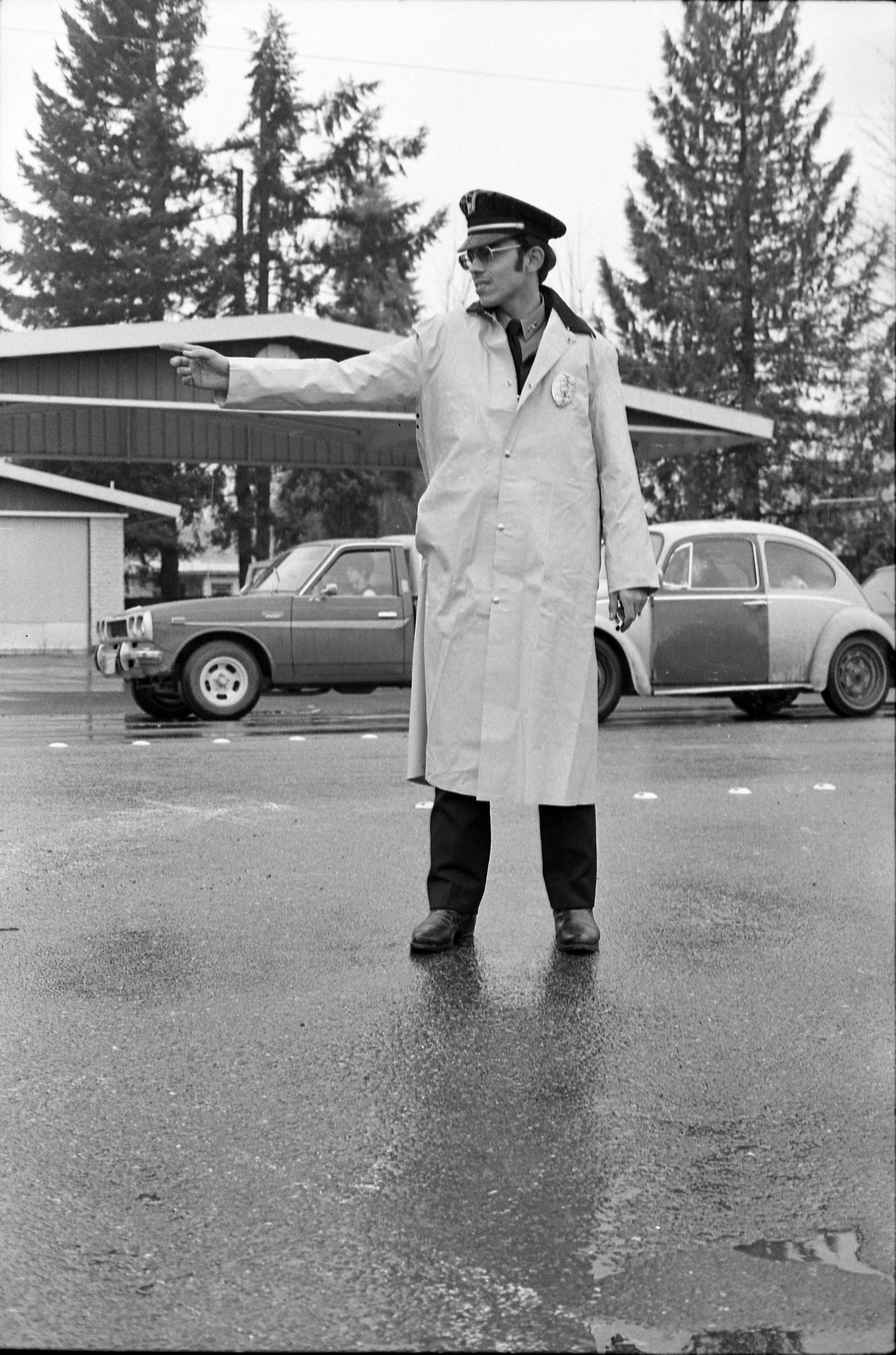 Frame 44 shows the officer standing in the road with his right arm raised and his hand directing traffic. He is looking to his right and his body is facing the camera. He is wearing a long rain coat with a dark shirt and dark pants under it. He is also wearing dark shoes, glasses and a policeman's hat. The left side of the raincoat has a police badge logo on the chest. Behind him is a building, a volkswagen bug and a truck. Frame 1 shows the policeman's left arm reaching into an electrical box, possibly one that controls traffic lights. Next to the unit is a telephone pole. Behind the pole the hood of a car is visible. Frames 2 and 3 show the policeman in the road directing traffic again, both show vehicles behind him, a building, and he is pointing with his right hand. Frame 4 shows him in the same position but now both his arms are by his sides. Frame 5 shows the same view of him with his hands by his sides but this image was taking horizontally, the rest are vertical.Made/Created