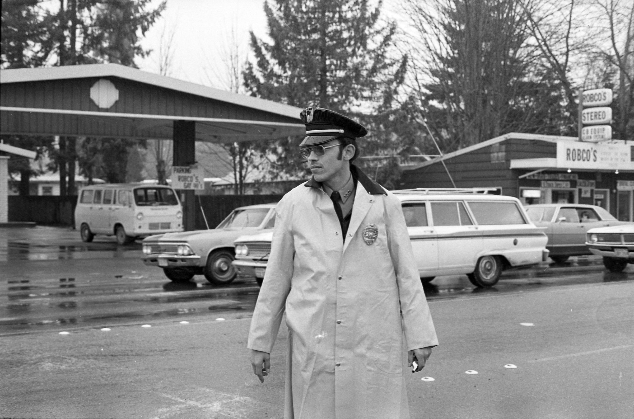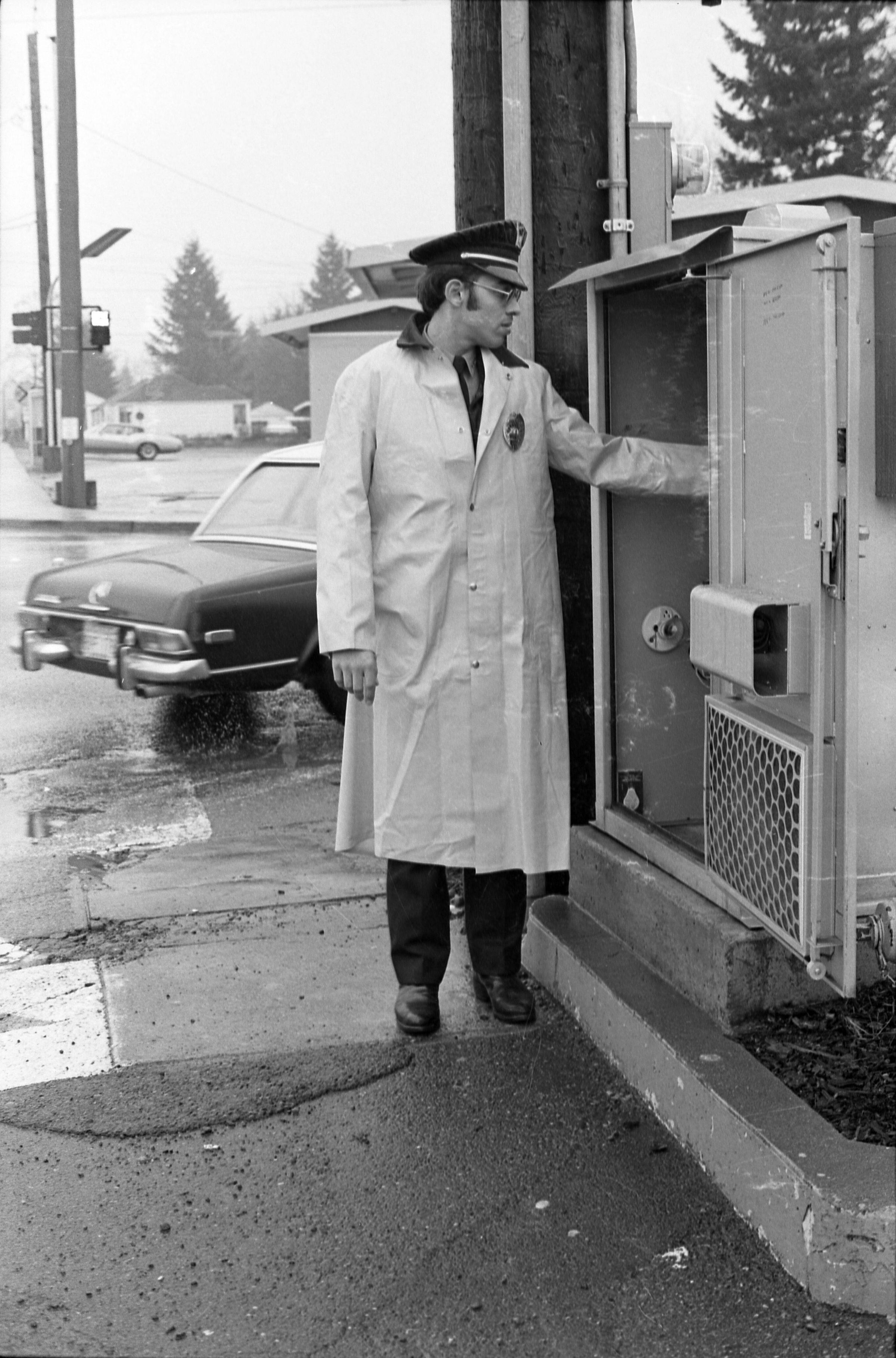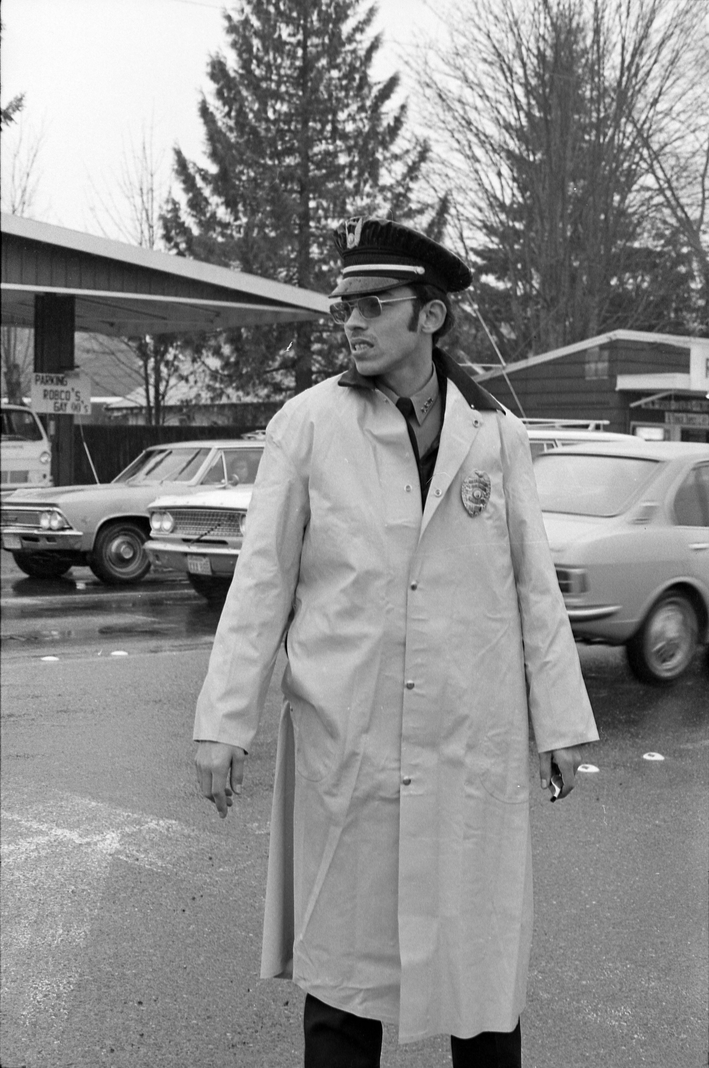 Frame 44 shows the officer standing in the road with his right arm raised and his hand directing traffic. He is looking to his right and his body is facing the camera. He is wearing a long rain coat with a dark shirt and dark pants under it. He is also wearing dark shoes, glasses and a policeman's hat. The left side of the raincoat has a police badge logo on the chest. Behind him is a building, a volkswagen bug and a truck. Frame 1 shows the policeman's left arm reaching into an electrical box, possibly one that controls traffic lights. Next to the unit is a telephone pole. Behind the pole the hood of a car is visible. Frames 2 and 3 show the policeman in the road directing traffic again, both show vehicles behind him, a building, and he is pointing with his right hand. Frame 4 shows him in the same position but now both his arms are by his sides. Frame 5 shows the same view of him with his hands by his sides but this image was taking horizontally, the rest are vertical.Made/Created