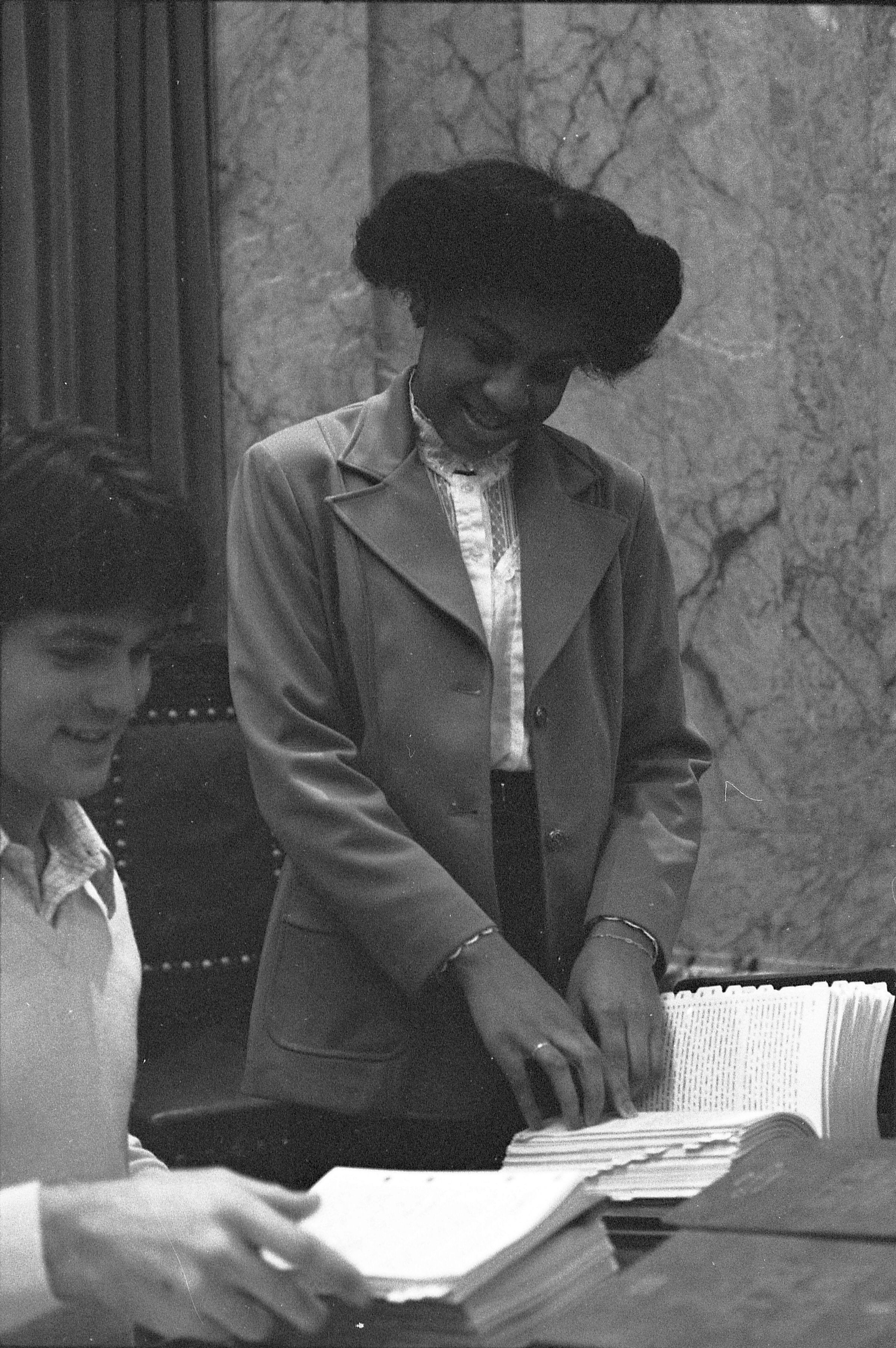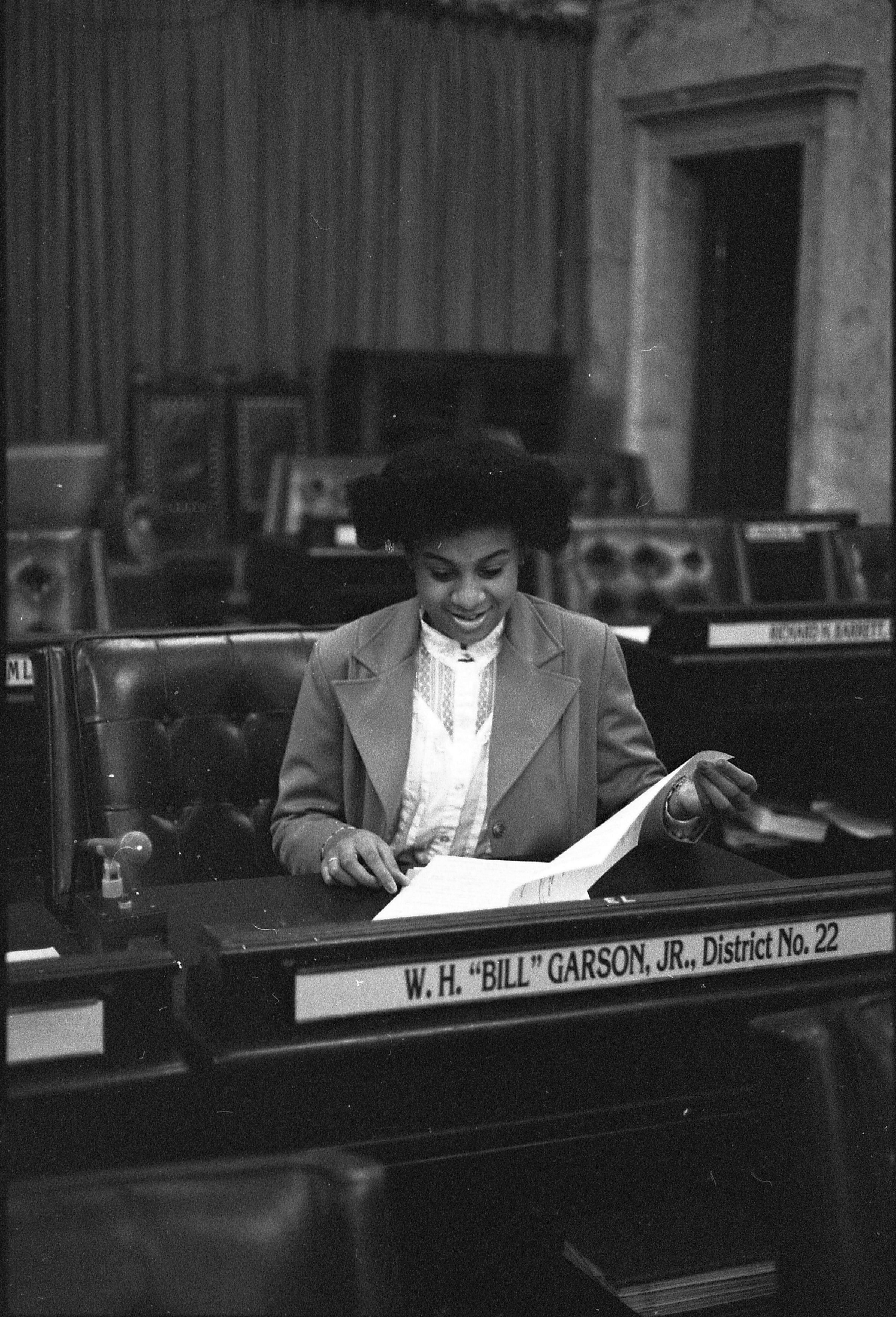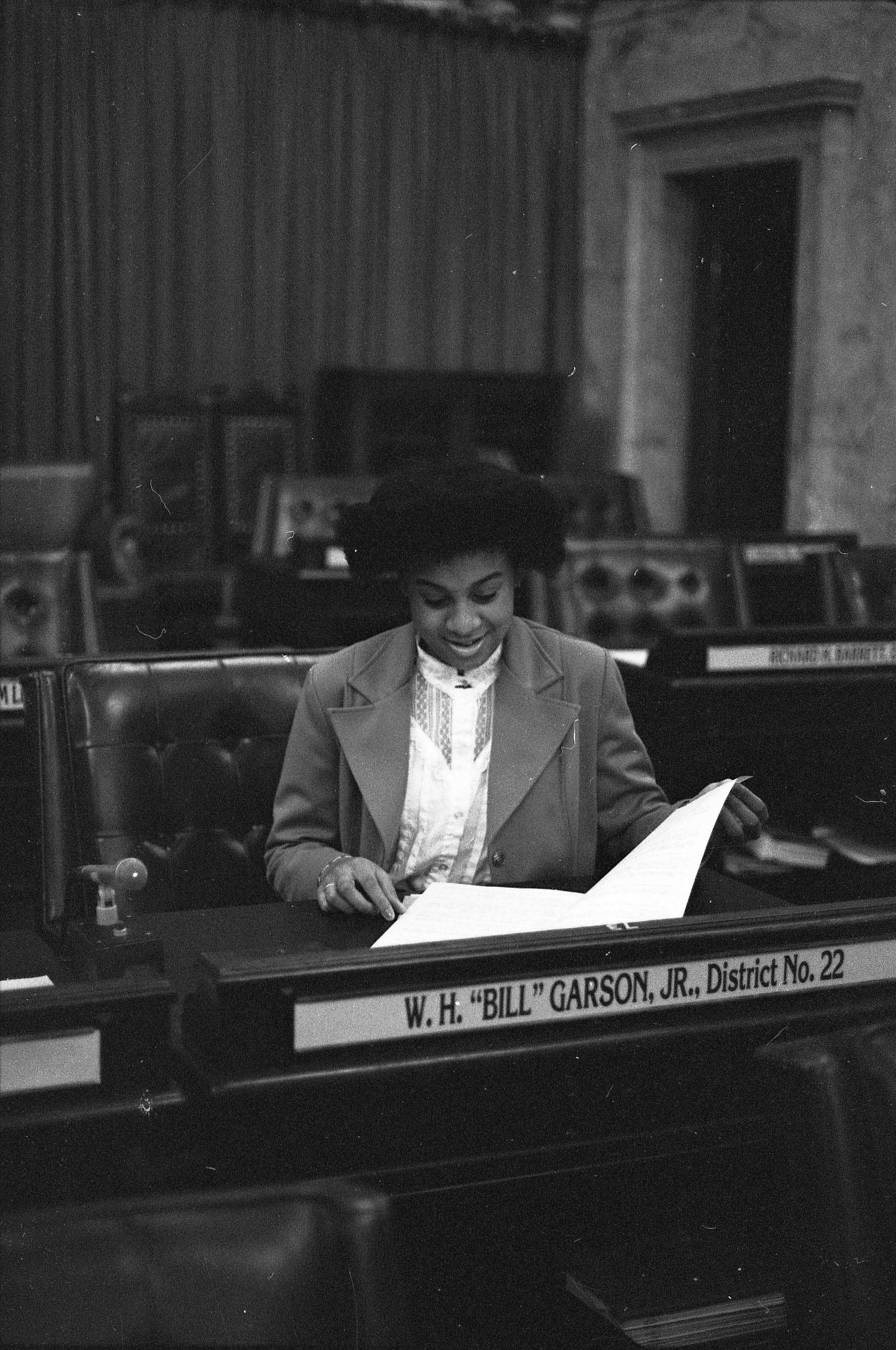 Frames 6-10 show a woman in a light shirt and jacket with dark pants standing at a desk with a name plate on it that reads "W.H. "Bill" Garson, Jr. District No. 22." The woman has a folder open and is looking at the contents of the folder. Behind her in the photographs appear to be other desks that also have name plates on them. Frames 11 and 12 she is seated in a chair behind the desk, and looking inside the folder she was holding in the previous frames. Frames 13-16 show the same woman but now she is standing next to a desk where another person is seated. The seated figure is wearing a long sleeved shirt with a vest over the top. They are both looking at paperwork that is on top of the desk.Made/Created
