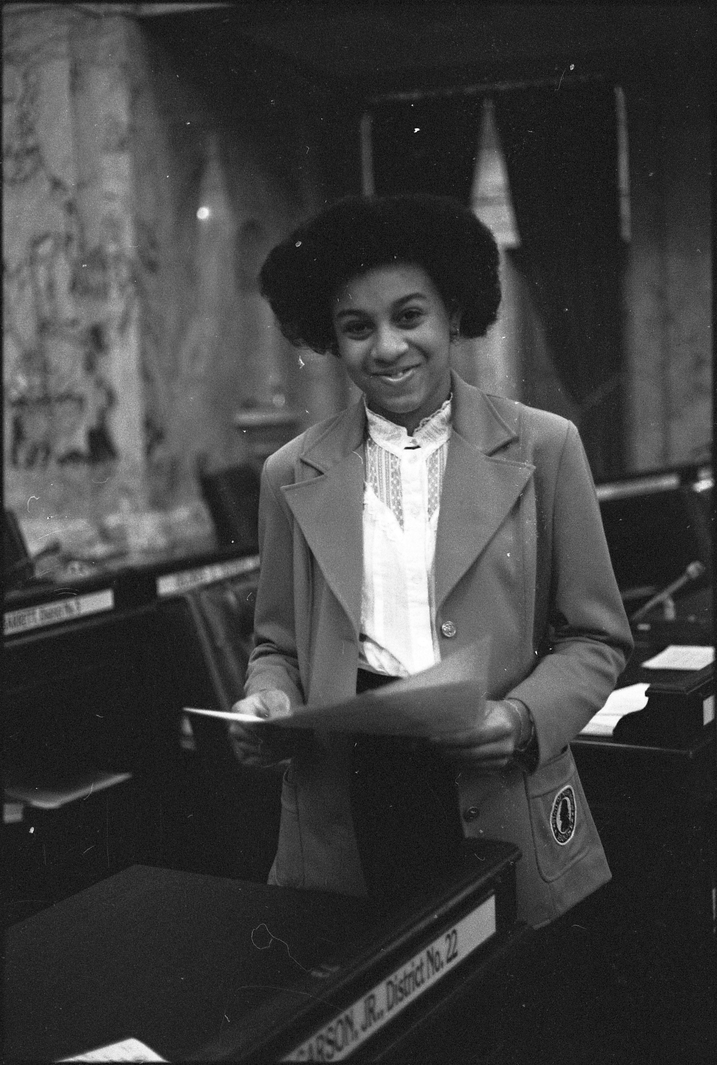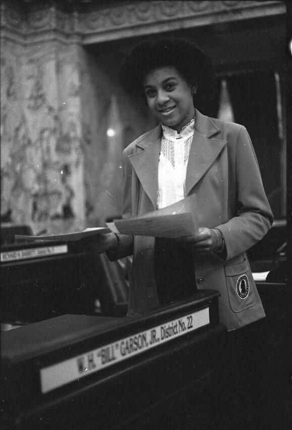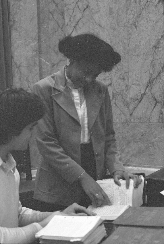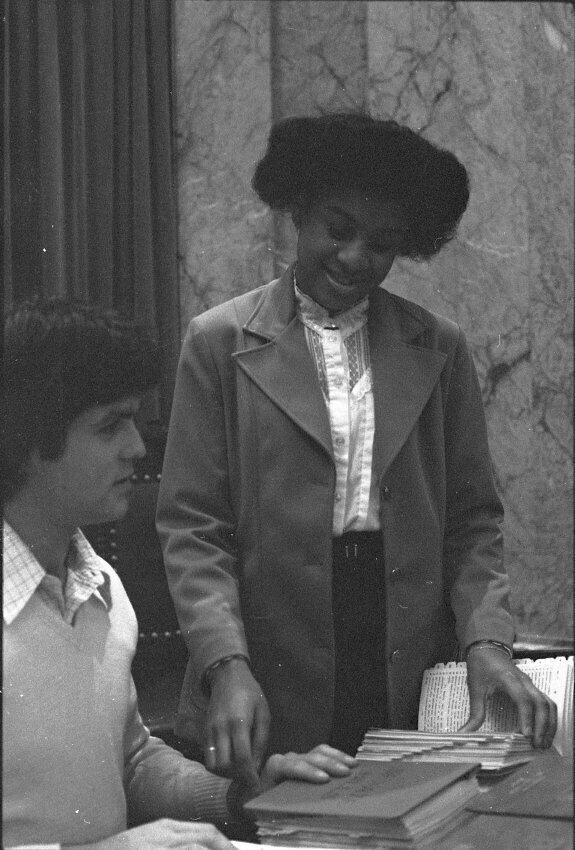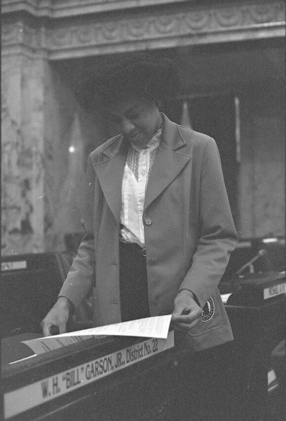 Frames 6-10 show a woman in a light shirt and jacket with dark pants standing at a desk with a name plate on it that reads "W.H. "Bill" Garson, Jr. District No. 22." The woman has a folder open and is looking at the contents of the folder. Behind her in the photographs appear to be other desks that also have name plates on them. Frames 11 and 12 she is seated in a chair behind the desk, and looking inside the folder she was holding in the previous frames. Frames 13-16 show the same woman but now she is standing next to a desk where another person is seated. The seated figure is wearing a long sleeved shirt with a vest over the top. They are both looking at paperwork that is on top of the desk.Made/Created