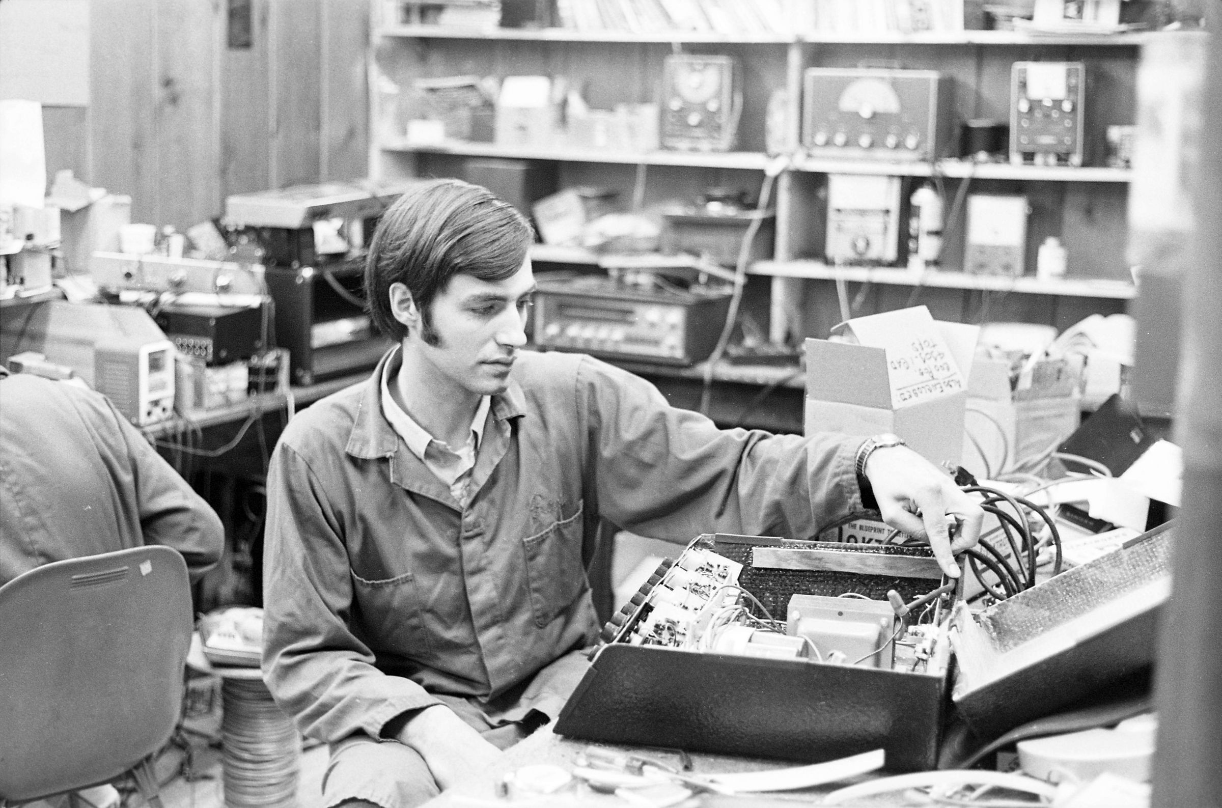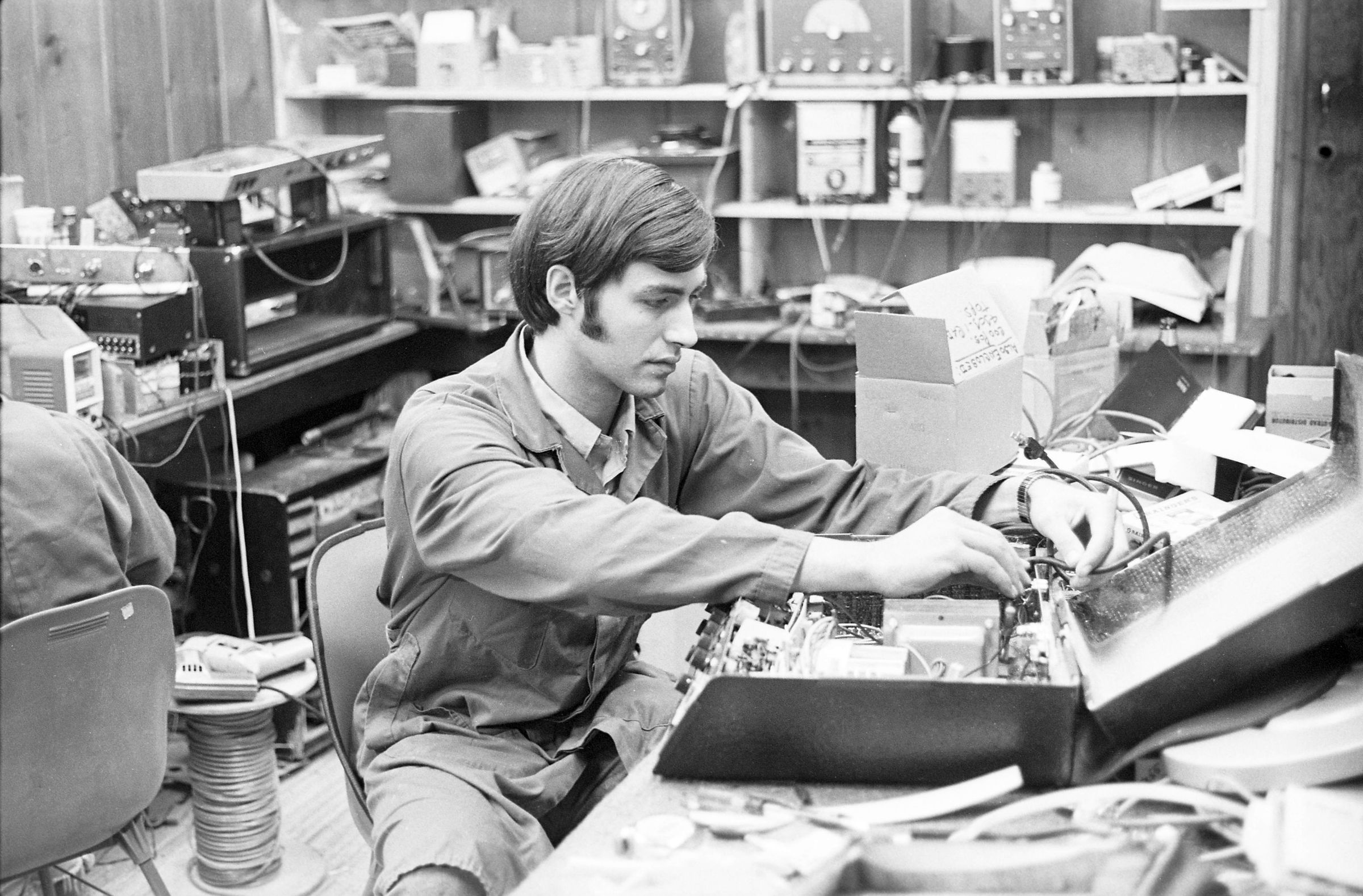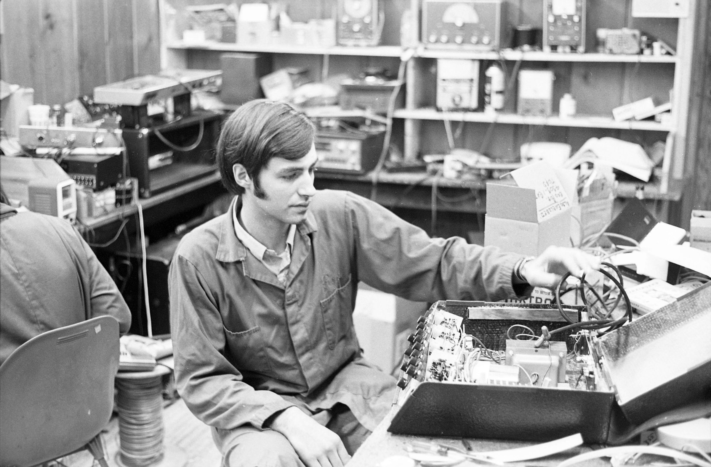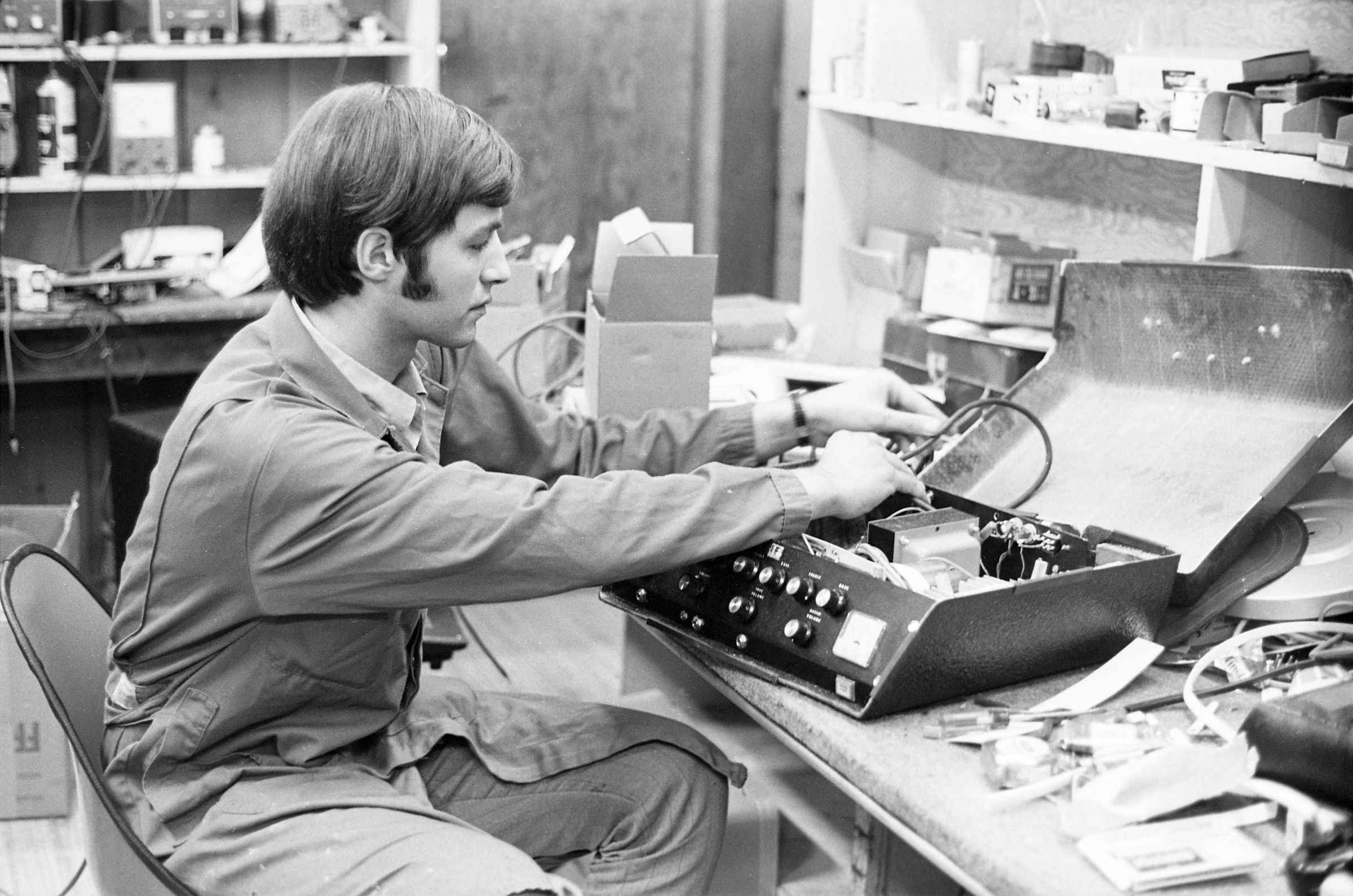 Ray Hoffman posing for the Lacey Leader. Black and white negative strip of four frames originally created for the Lacey Leader newspaper. According to the envelope containing the negatives, the man in the photographs is Ray Hoffman. In all four frames, the man appears to be working on a machine which is on the table in front of him. The back wall behind him has various machines and equipment on it. There is a figure sitting with his back to him, who is not visible to the camera. Ray is wearing light pants and a light button up shirt, with a shirt under the buttoned shirt.Made/Created
