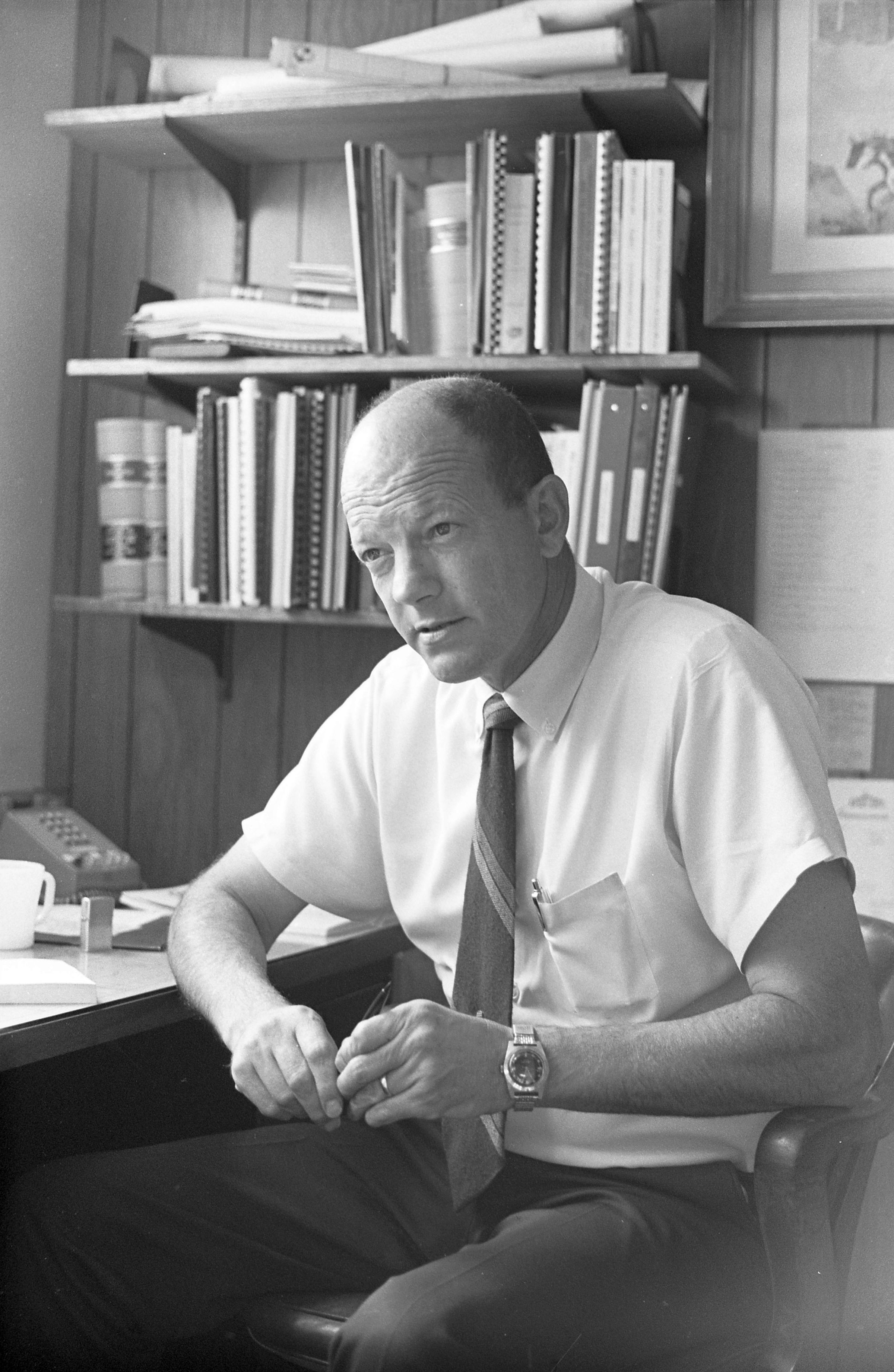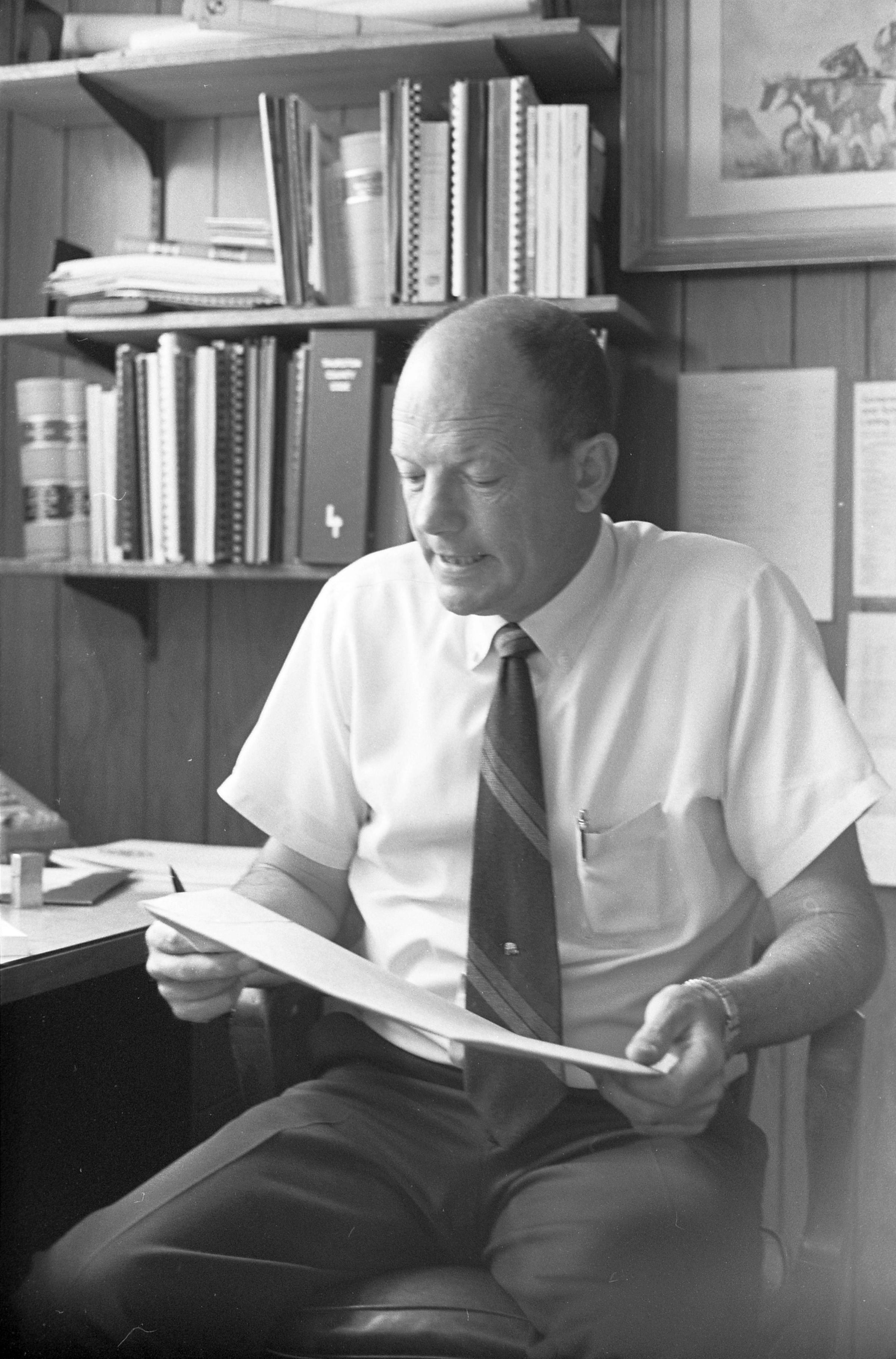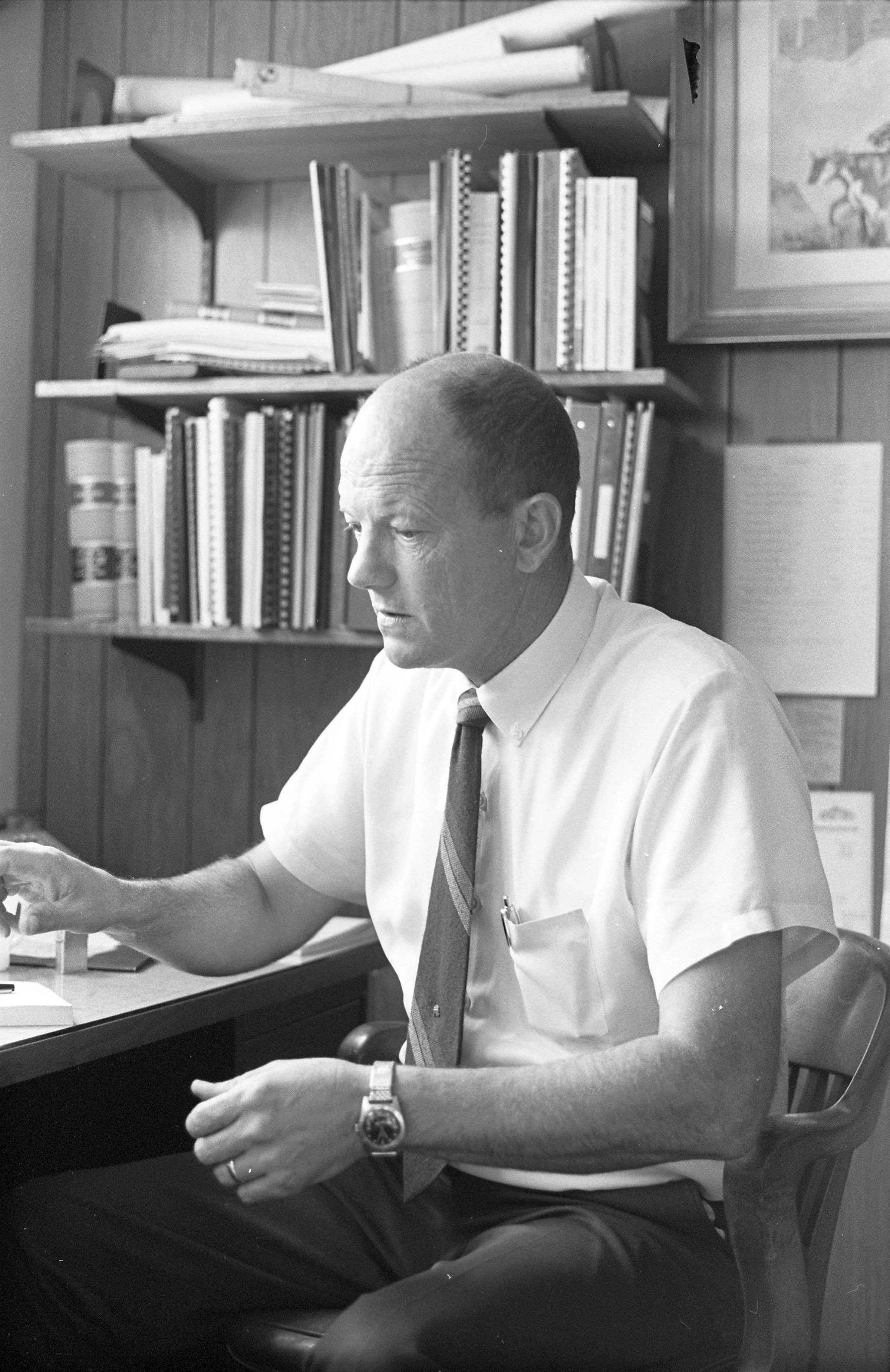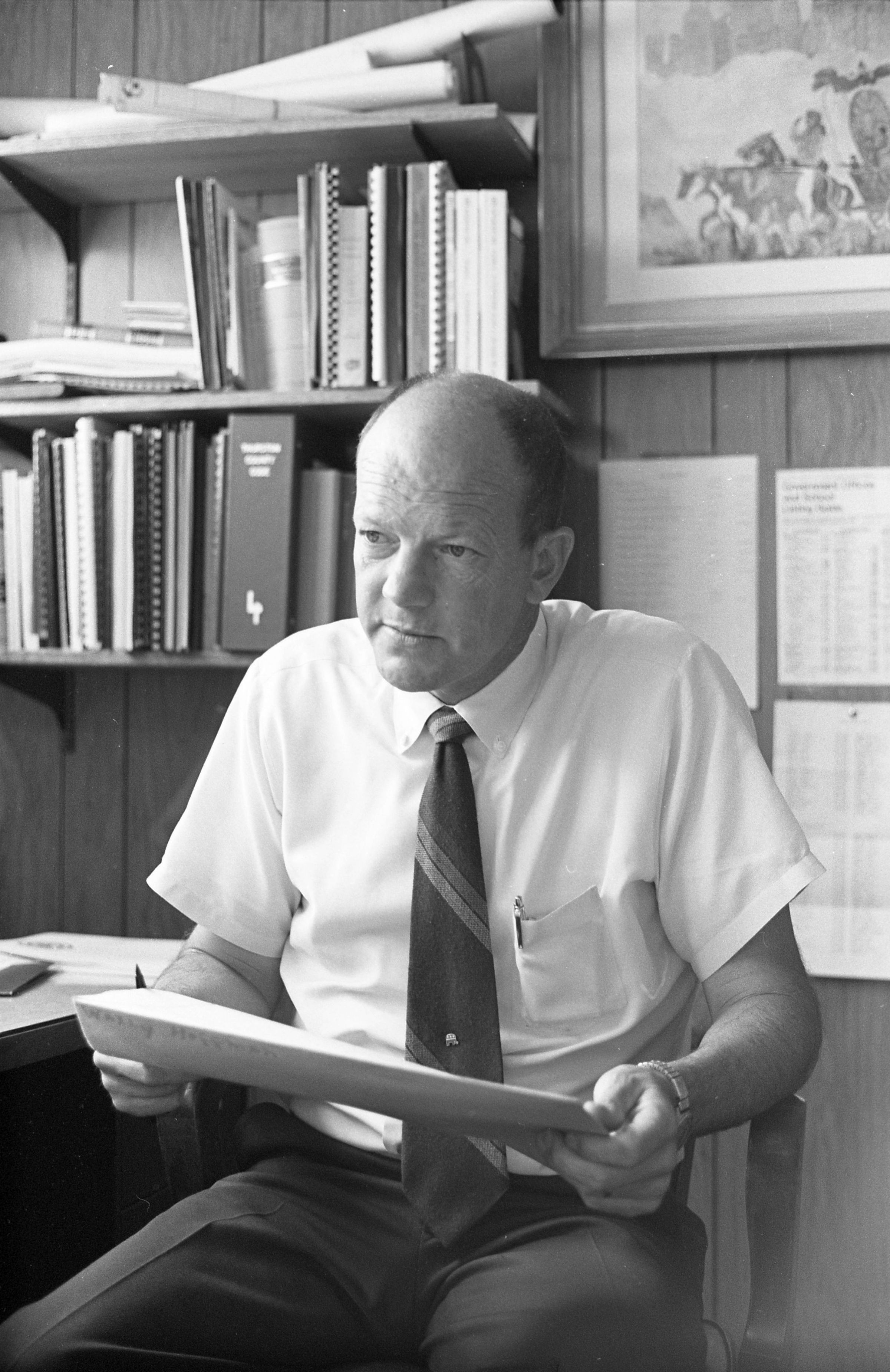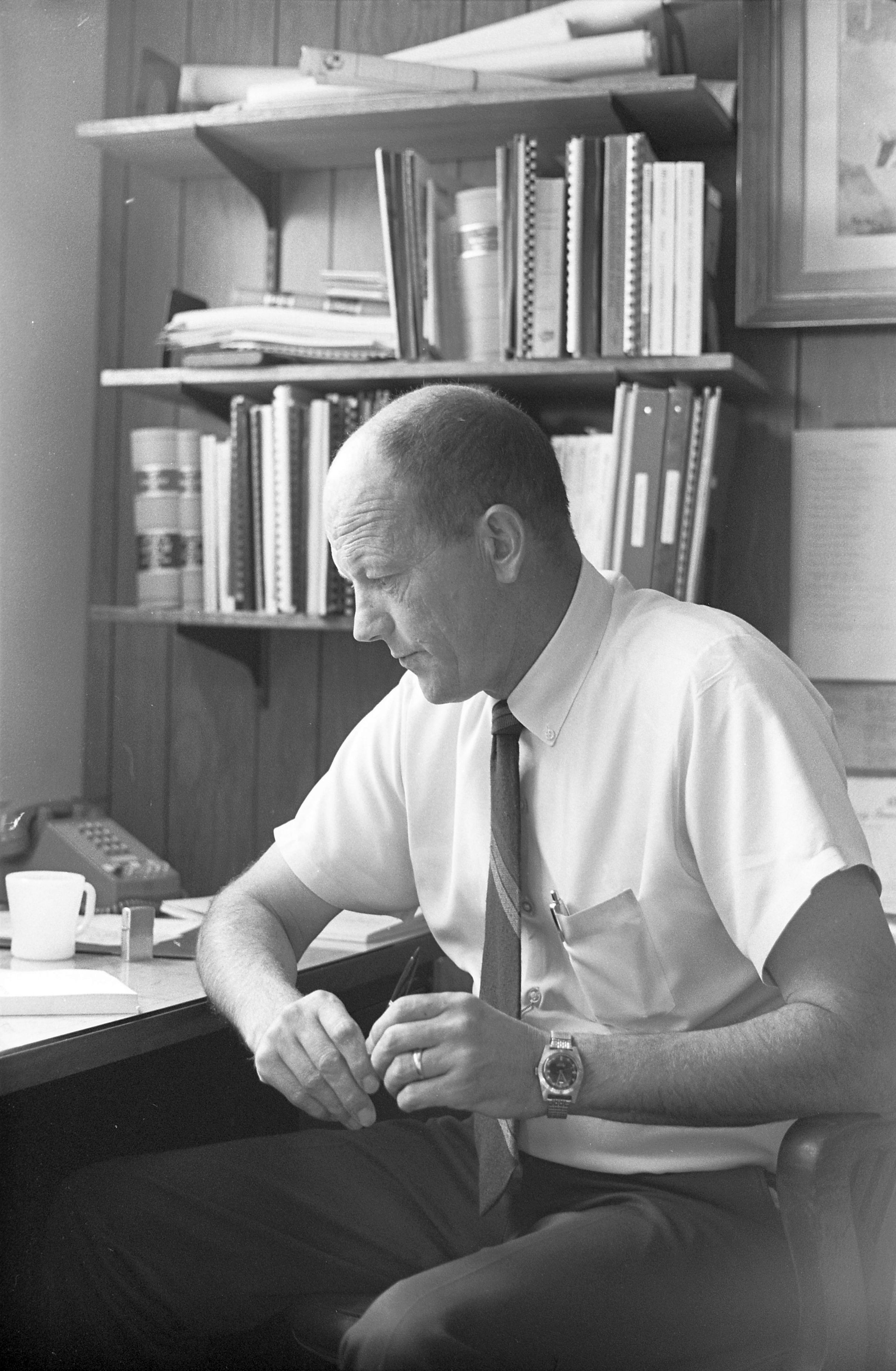 Ken Stevens poses for the Lacey Leader. Black and white negatives strip of five frames originally created for the Lacey Leader newspaper. According to the envelope containing the negatives, the man in the photographs is Ken Stevens. In all five frames Ken is wearing a white short sleeved button up shirt, dark pants, and a dark tie. He has a watch on his right wrist. He is sitting at a desk or table. Behind him appear to be bookshelves with binders, folders, and books on them.Made/Created