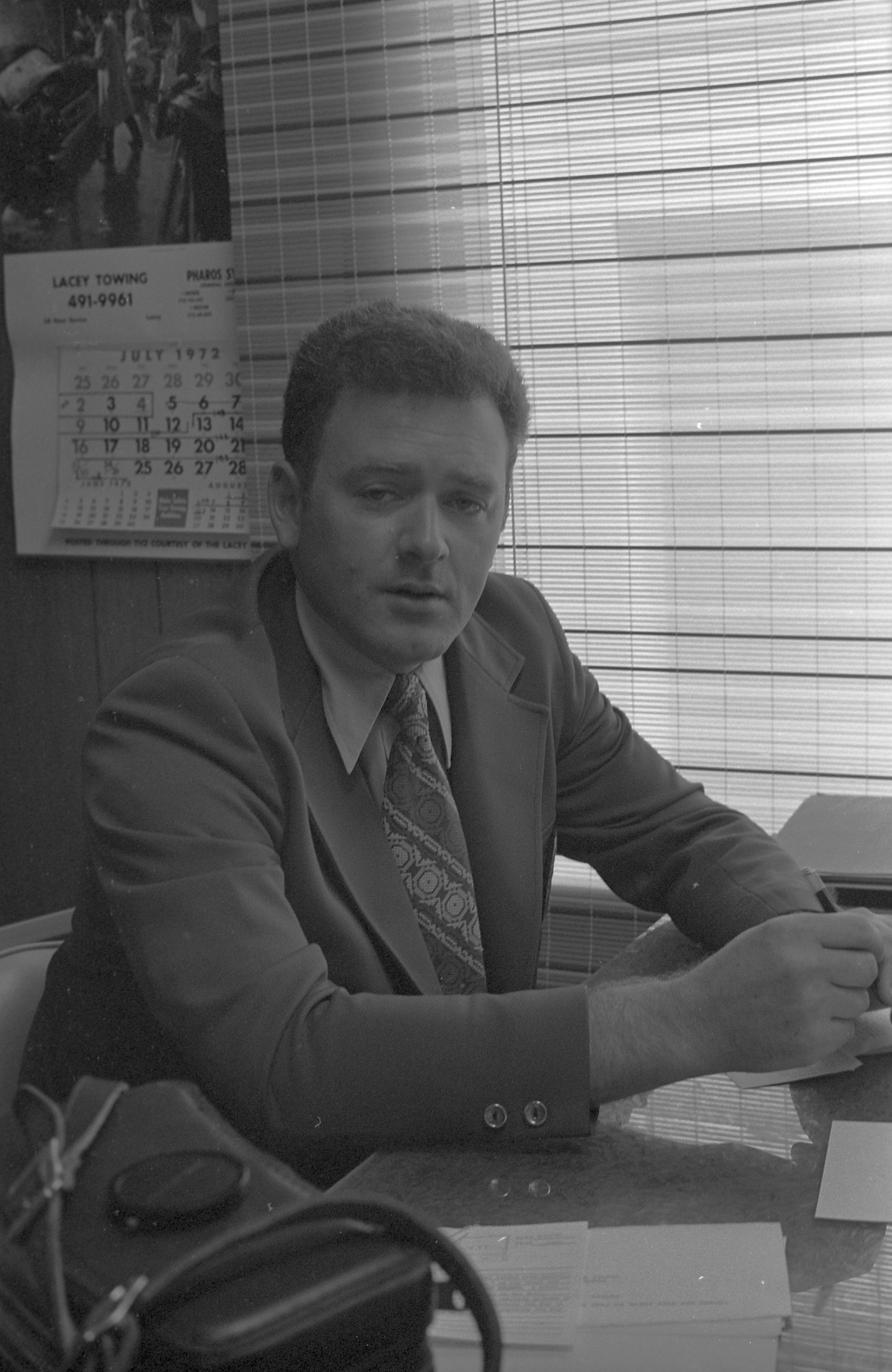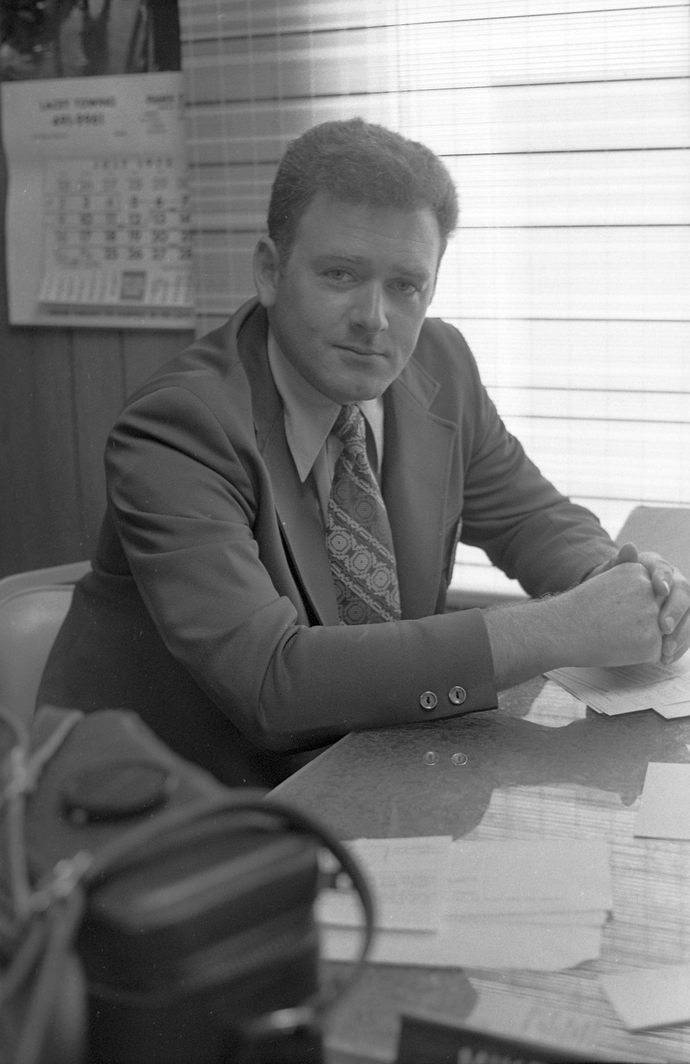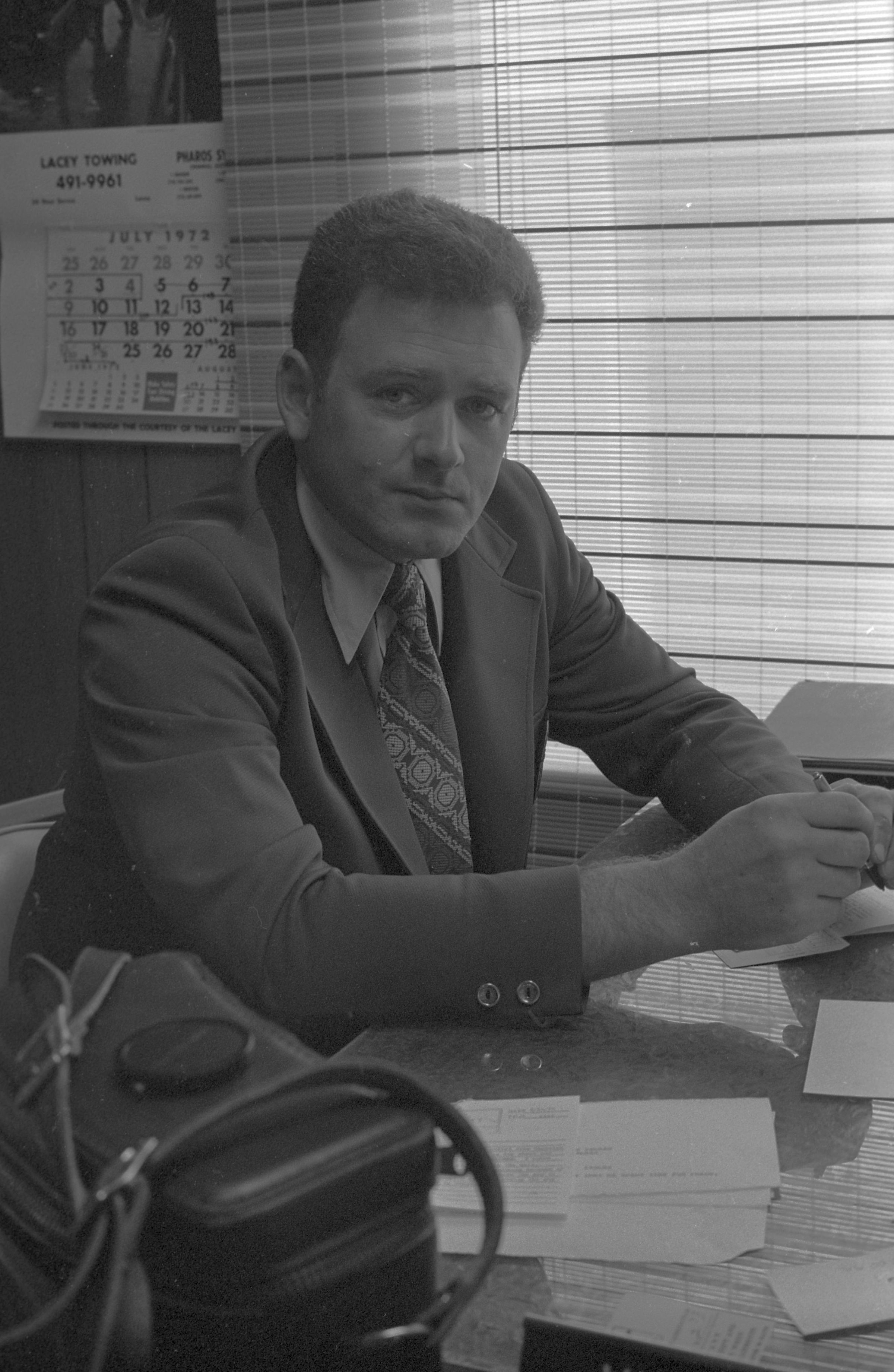 Mike Smith poses for the Lacey Leader. Black and white negative strip of three images originally created for the Lacey Leader newspaper. According to the envelope containing the negatives, the man featured in the photographs is Mike Smith.Made/Created
