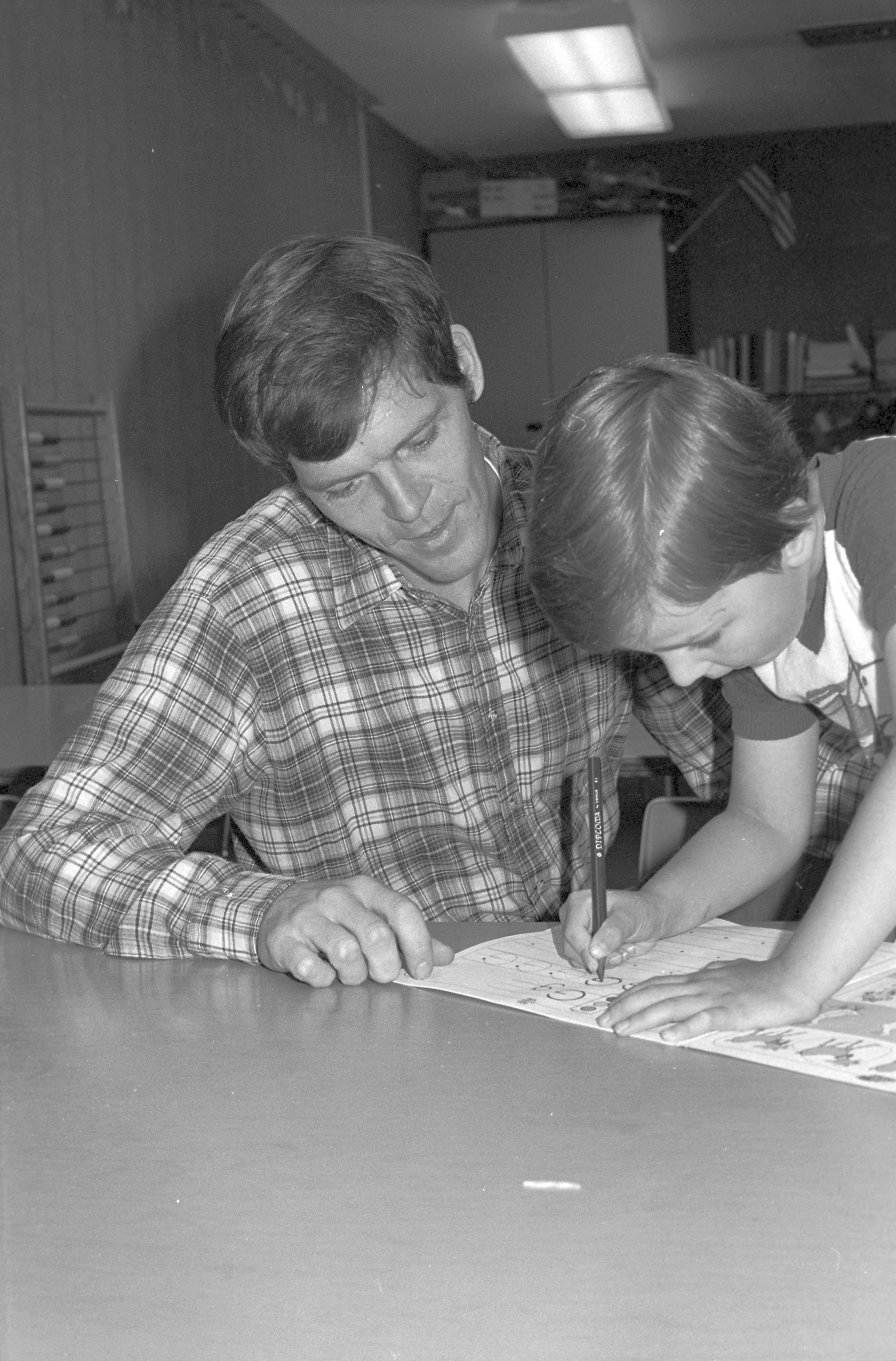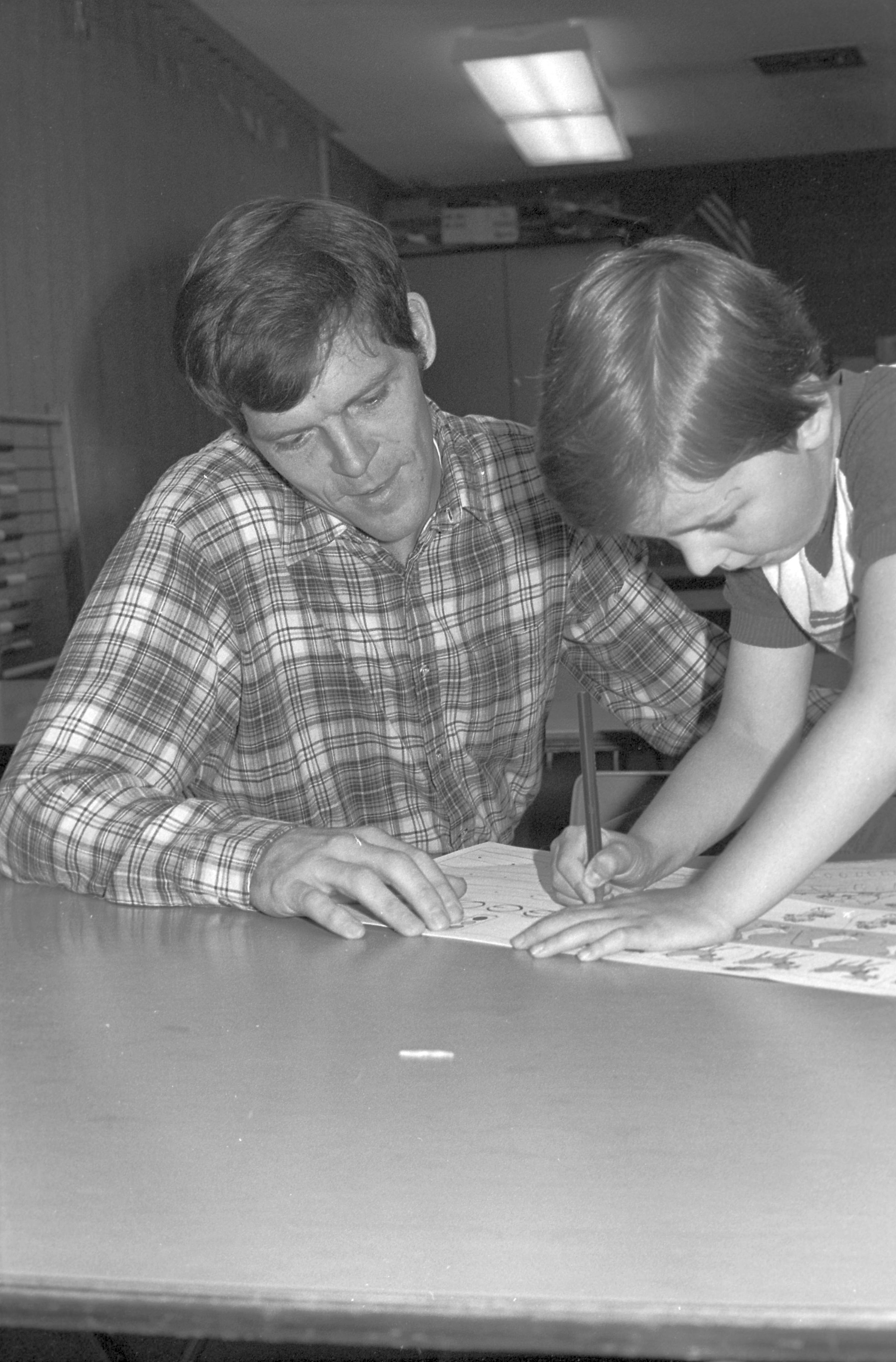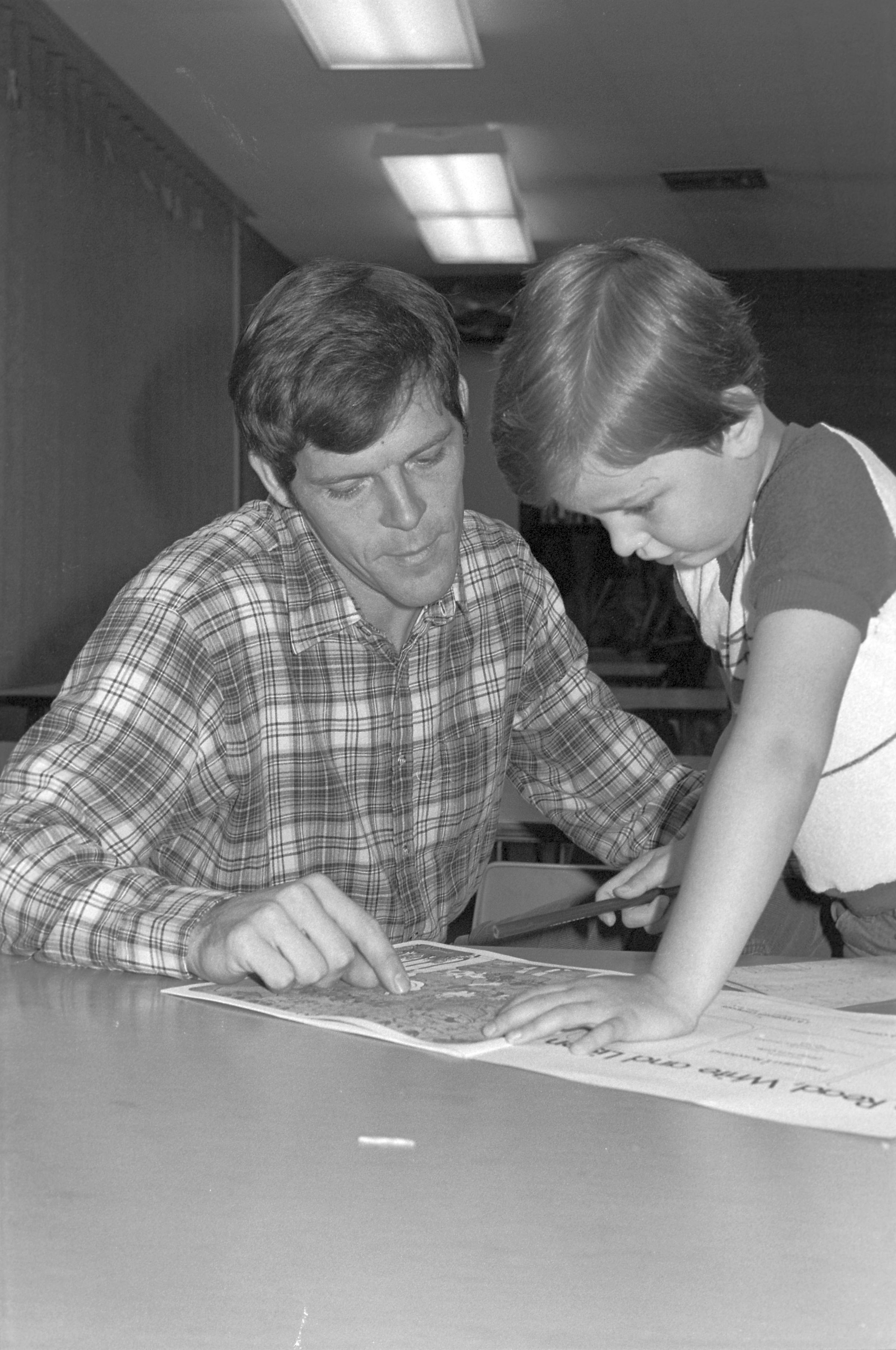Terry Brennon posing for the Lacey Leader. Black and white negative strips of six frames (two strips of three frames) originally created for the Lacey Leader newspaper. According to the envelope containing the negatives, the photographs are of Terry Brennon. The photographs are of a man and a younger boy. There is no way to identify which person in the photograph is Terry Brennon. In all frames the man is seated at a desk and the boy is standing next to him. The man is wearing a plaid button up long-sleeved shirt and has brown hair. The boy is wearing light pants and a t-shirt with a white body and different colored sleeves.Made/Created