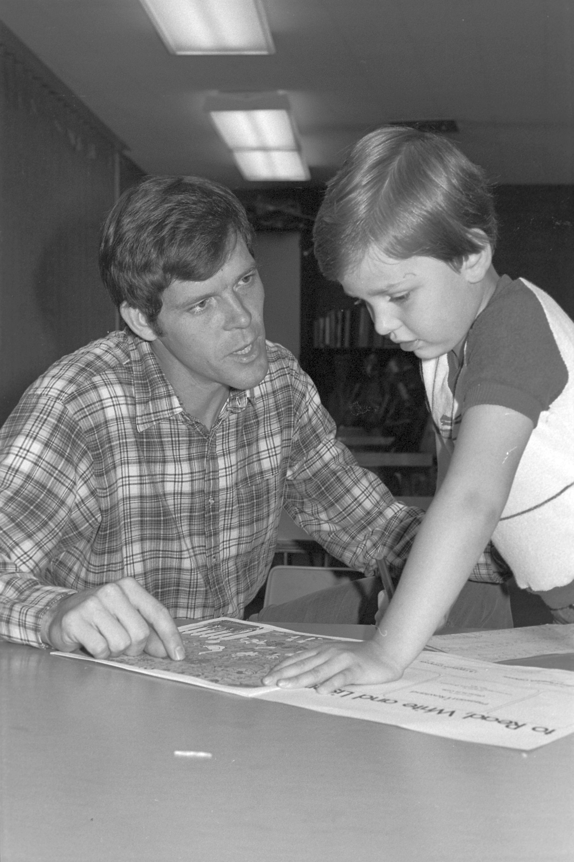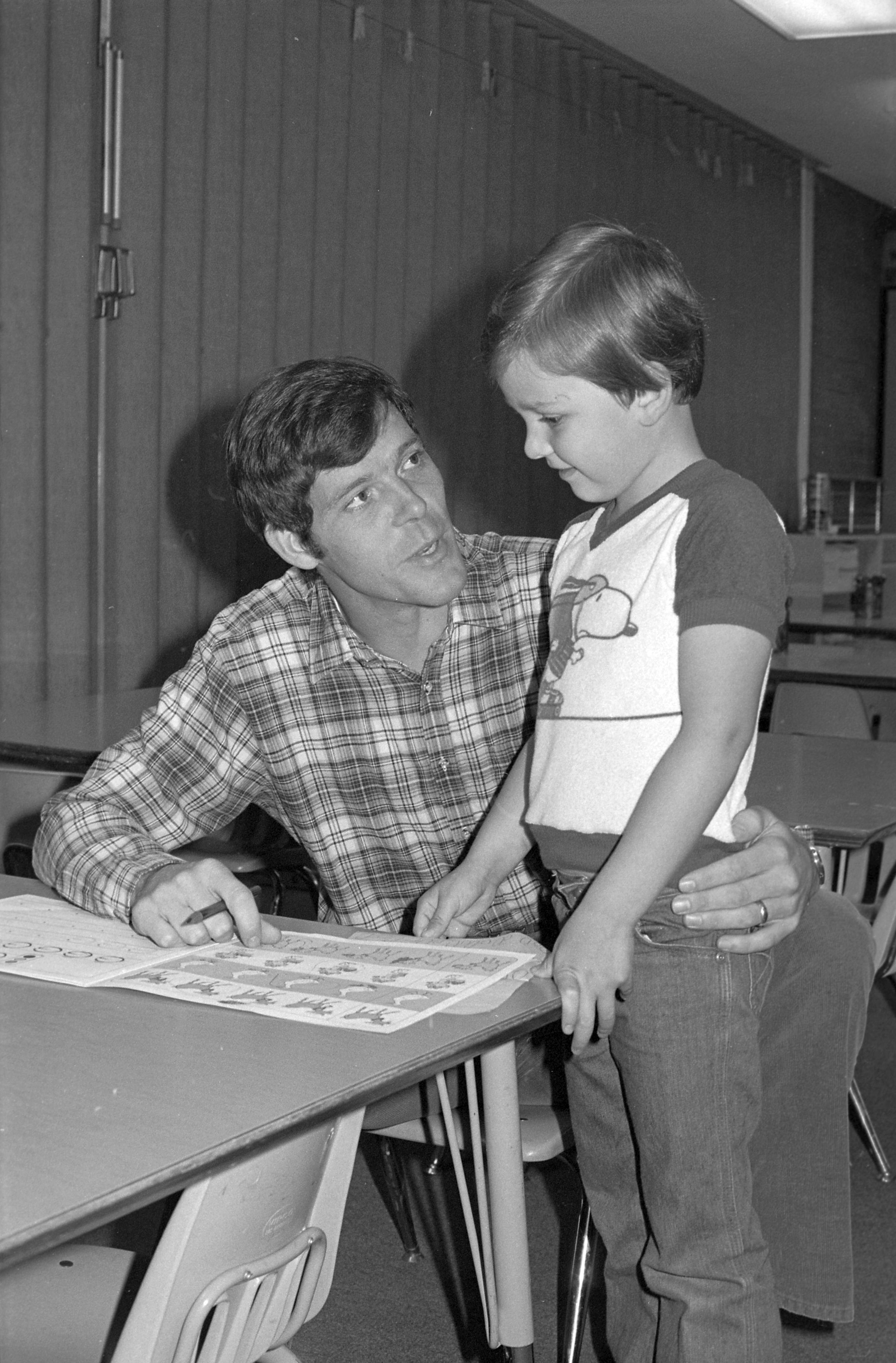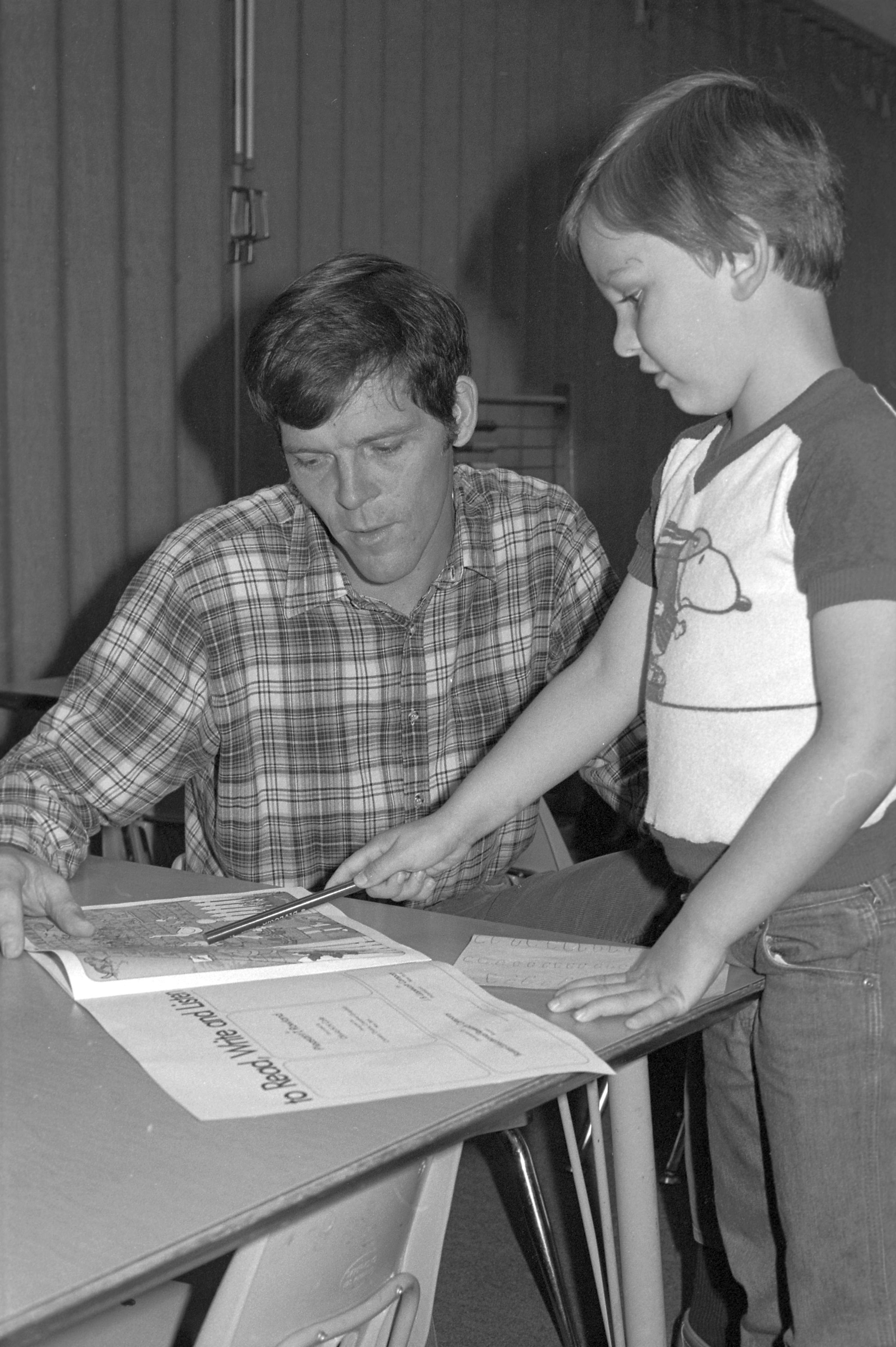 Terry Brennon posing for the Lacey Leader. Black and white negative strips of six frames (two strips of three frames) originally created for the Lacey Leader newspaper. According to the envelope containing the negatives, the photographs are of Terry Brennon. The photographs are of a man and a younger boy. There is no way to identify which person in the photograph is Terry Brennon. In all frames the man is seated at a desk and the boy is standing next to him. The man is wearing a plaid button up long-sleeved shirt and has brown hair. The boy is wearing light pants and a t-shirt with a white body and different colored sleeves.Made/Created